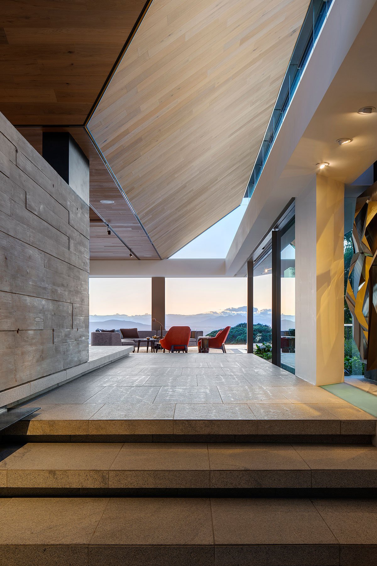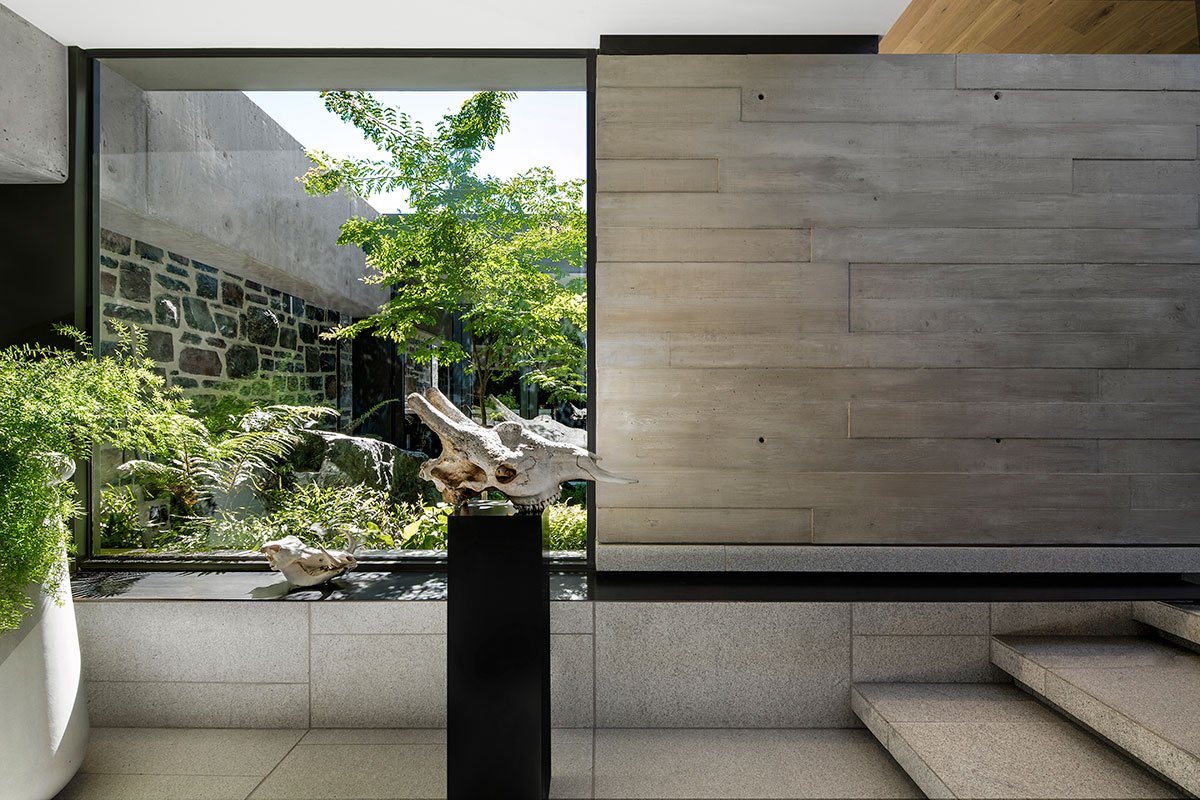 One enters the house through the large metal front door, which sits between the house proper and the stone wall, into a small entrance lobby connected to a courtyard garden. From this restrained quiet space a few steps take you up into the living space with its cinematic bold views over the city.