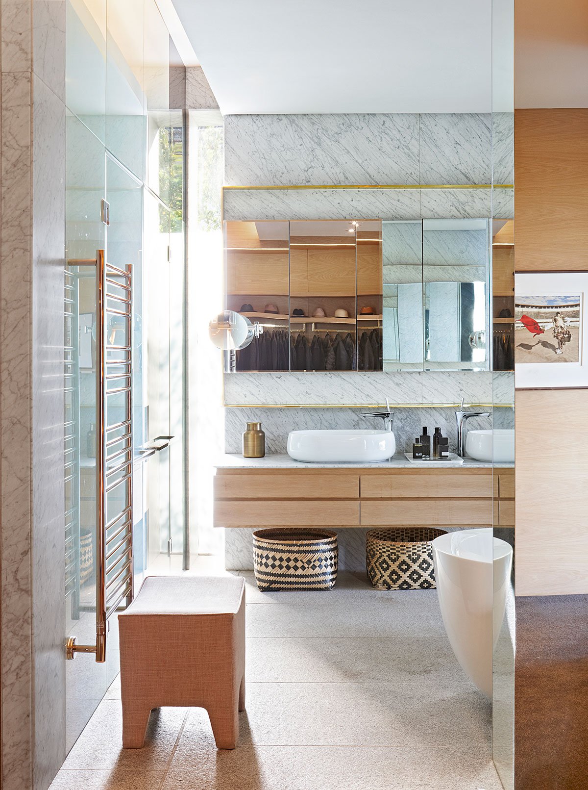 The house is stacked on three levels. The topmost level with maximum views, holds most of the living spaces; the open-plan kitchen, dining room and lounge. The family’s work and bedroom spaces are on the mid-level along with the garage, gym, cinema and guest room on the lower level.