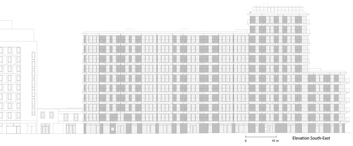 The residential complex consists of a ten-storey block, which is marked by two further storeys in the shape of a tower. A six-storey, staggered front building brings the eaves height back to the historical Berlin dimensions and flanks the access to a common inner courtyard on Barnerstrasse. At the other end, the ground and upper floors connect the complex to the neighbouring buildings. Apart from the commercial units on the ground floor, only flats were built here. Regardless of its large dimensions, the building presents itself light and open through its room-high, generous window fronts and an openly designed, flat glazed ground floor.