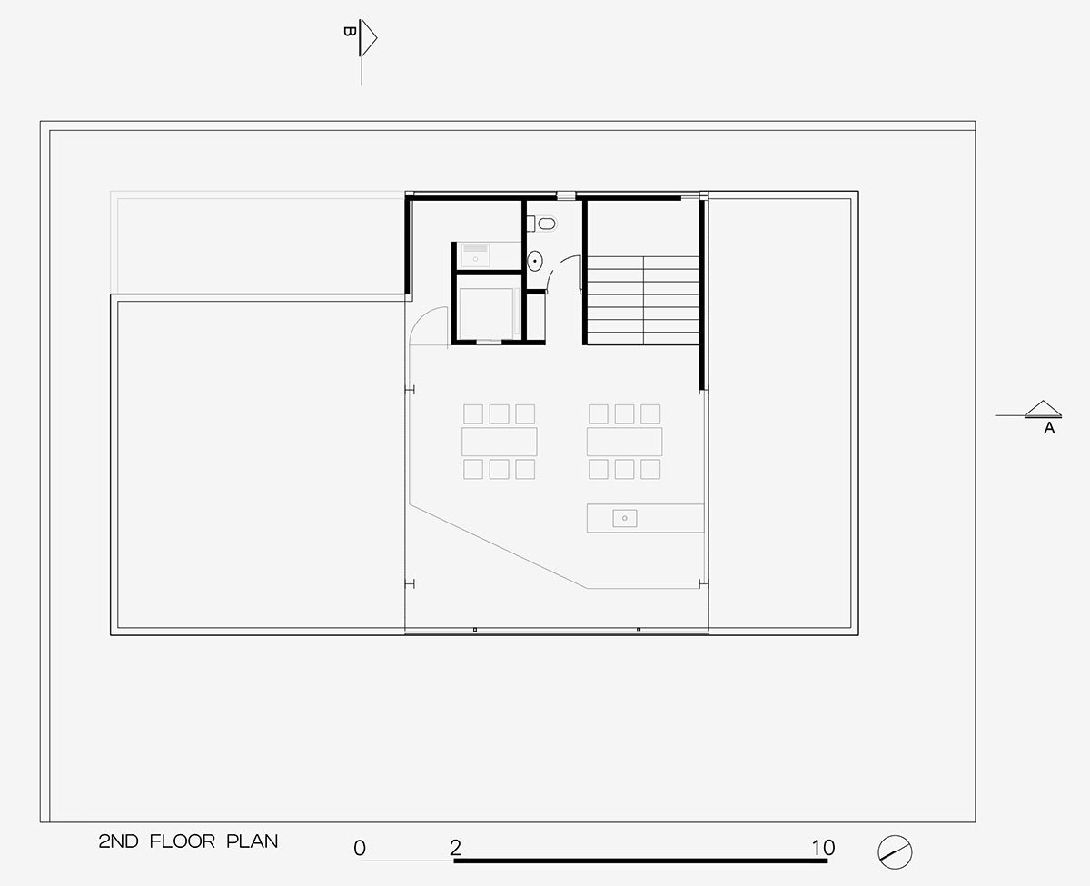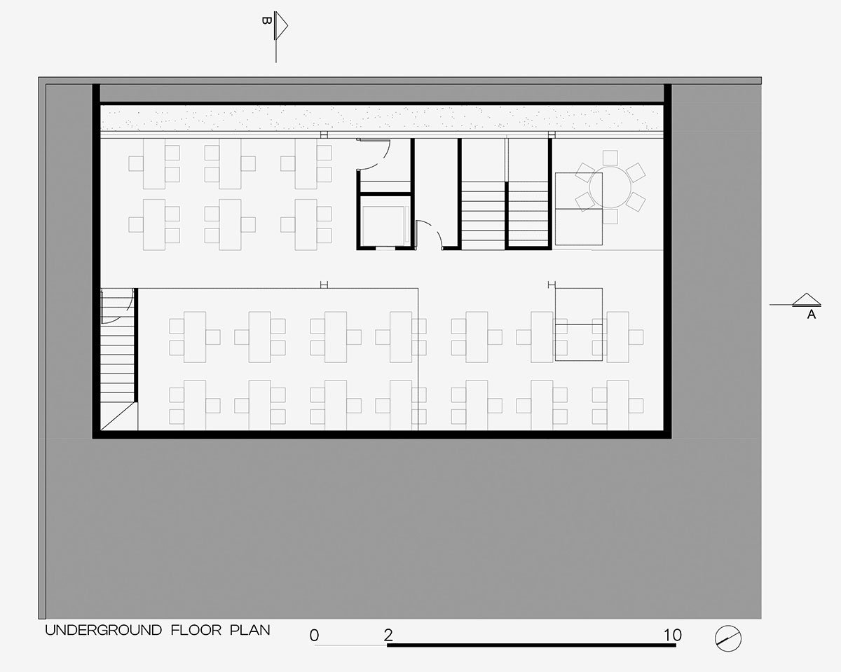 In the underground, with double-legged stretch, the programs of a greater concentration of people were sheltered. The access from the street is the intermediate level, housing the reception and a small real estate financing agency. In the upper, we have the administrative sector.