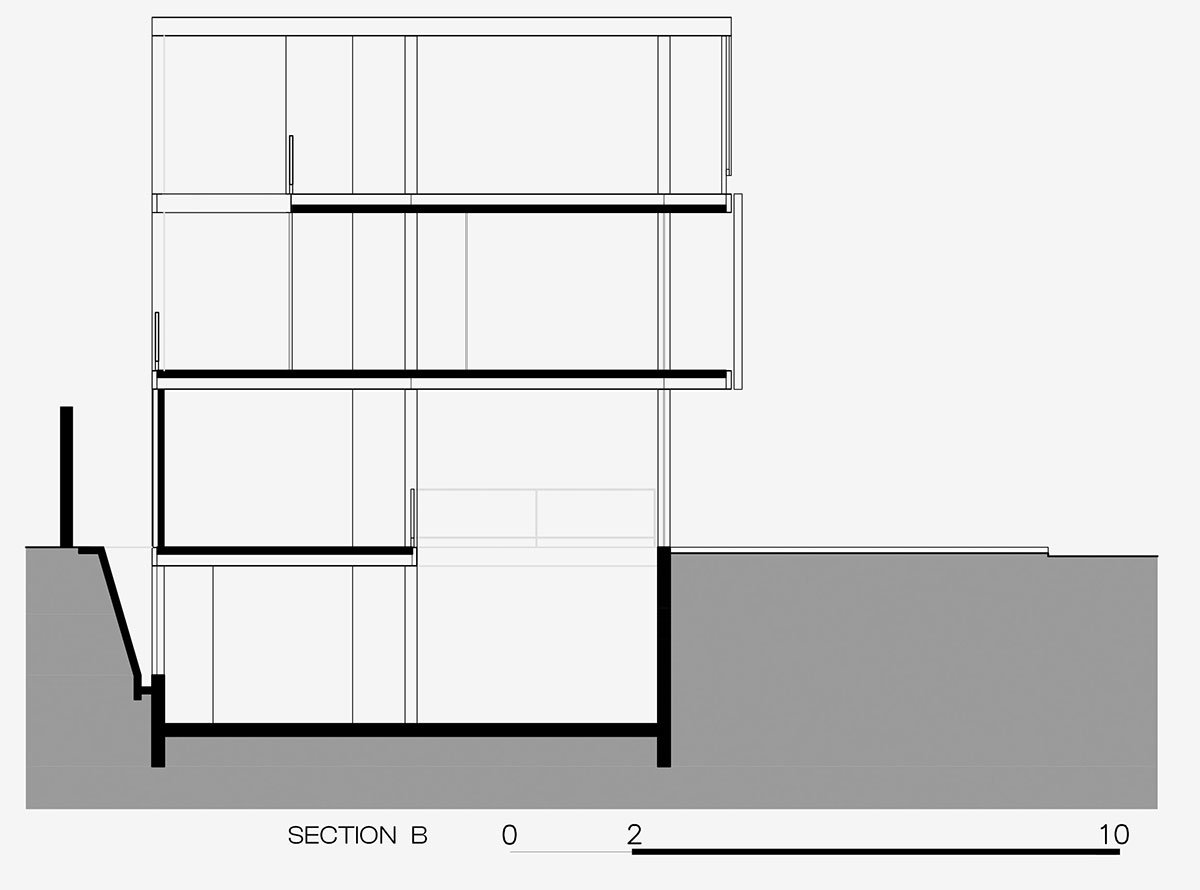 [Text as submitted by architect] Building designed to house a real estate company, with an extensive needs program. The site of 300m2 had limitations of height so we chose the alternative of projecting the building growing down. Access by street level is an intermediate level of the building.