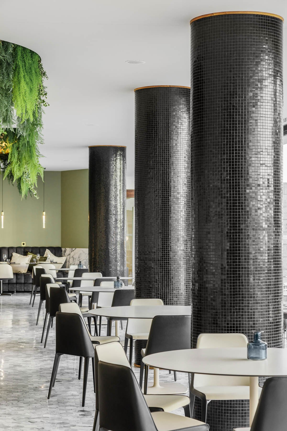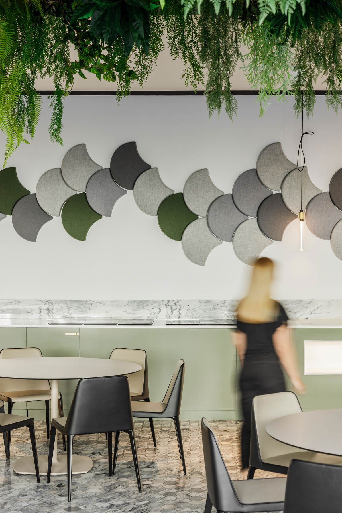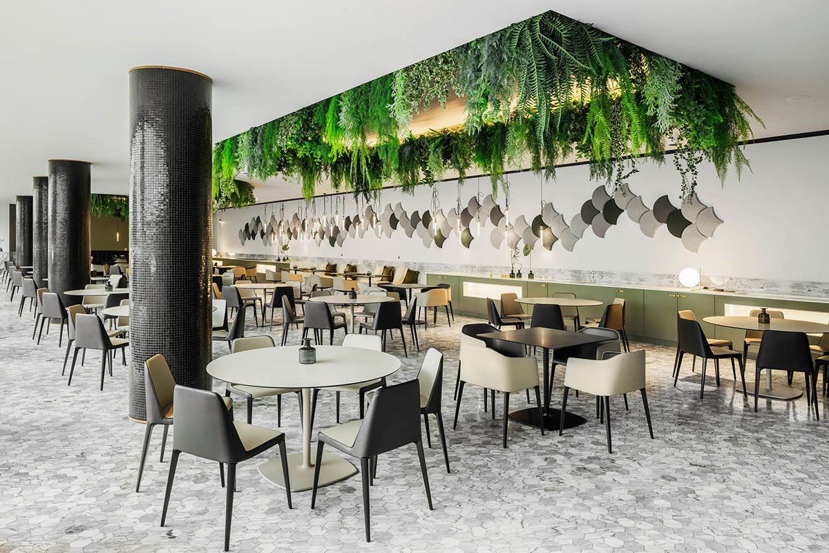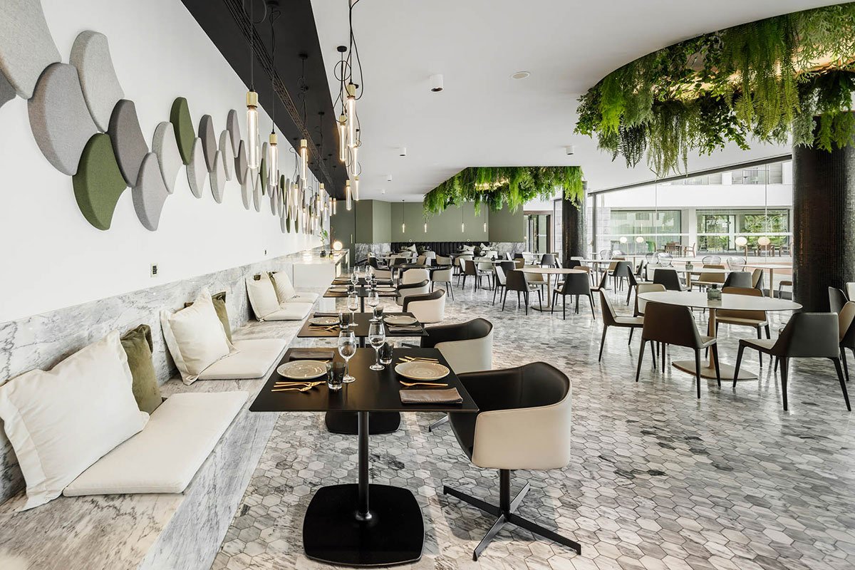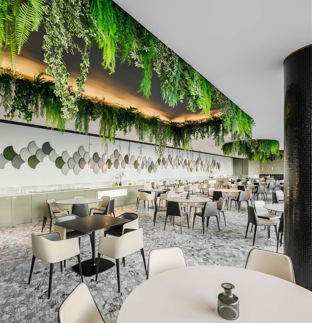 The restaurant is characterized as an interior garden, an integral part of the exterior, mirroring the same symbolism and balance, with the presence of vegetation that flows through the ceilings, in line with the various moments of artificial lighting with scenic effect, and the acoustic panels that, in addition to their primary function, assume the carp form: symbol of prosperity, longevity and fertility.