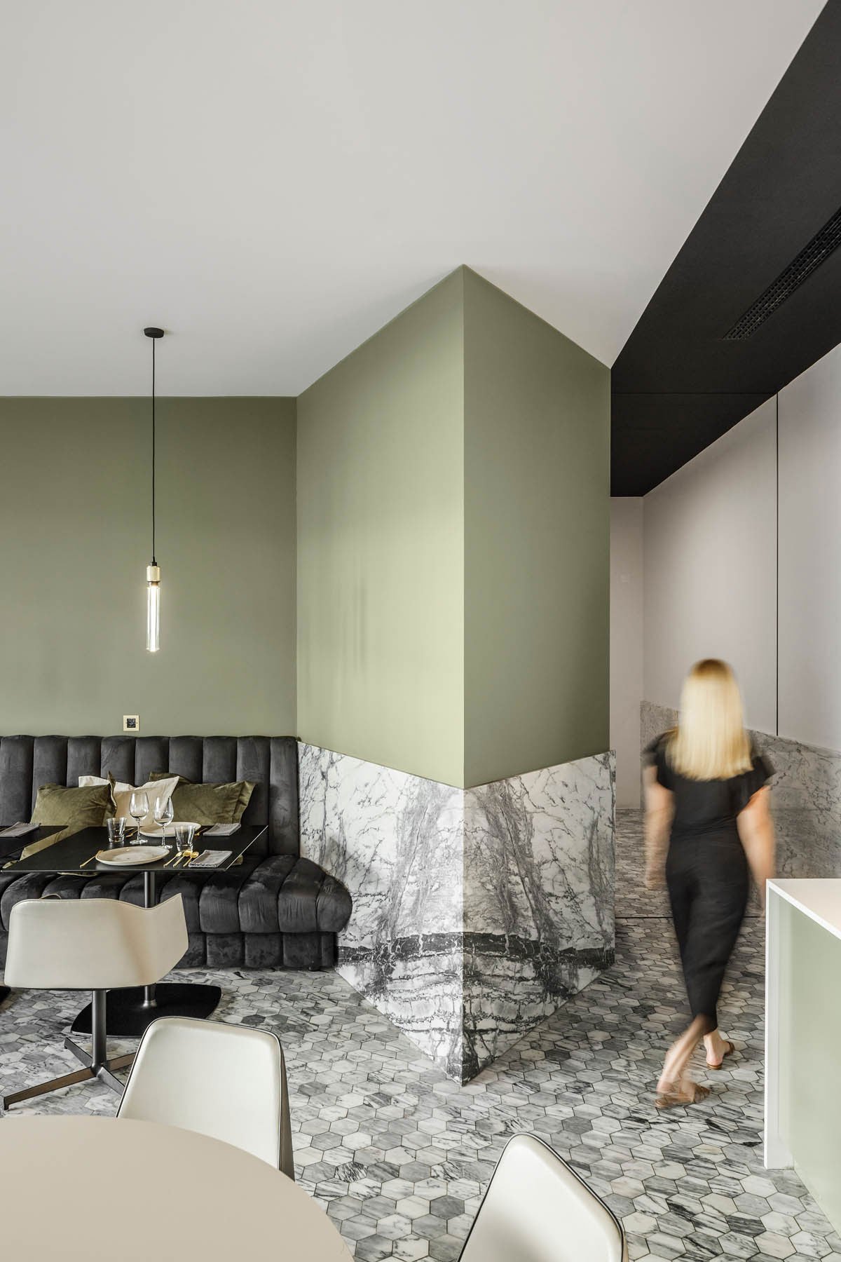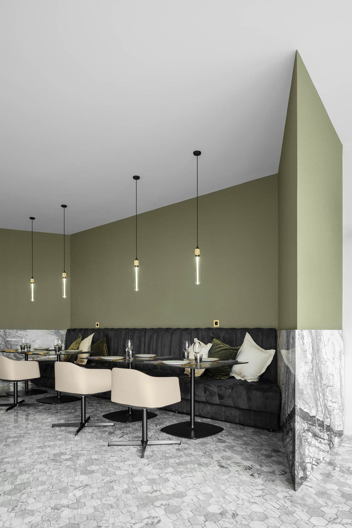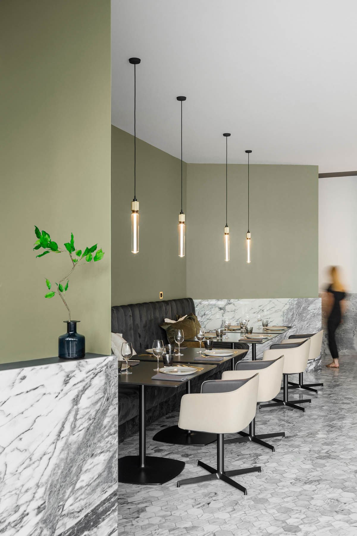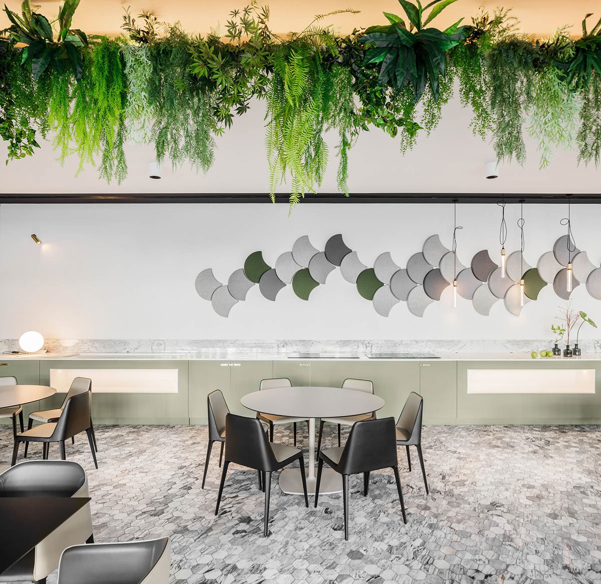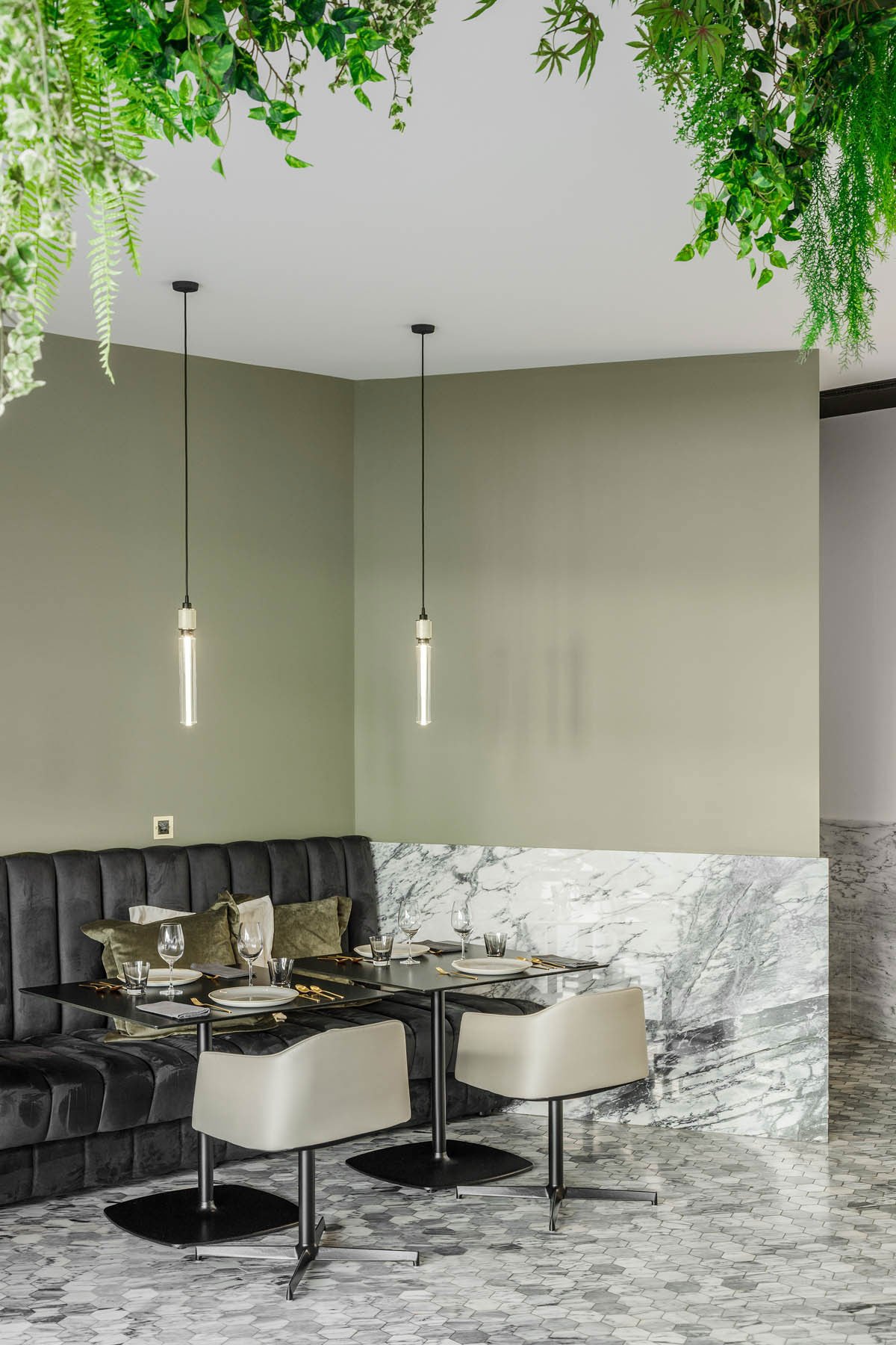 The restaurant is characterized as an interior garden, an integral part of the exterior, mirroring the same symbolism and balance, with the presence of vegetation that flows through the ceilings, in line with the various moments of artificial lighting with scenic effect, and the acoustic panels that, in addition to their primary function, assume the carp form: symbol of prosperity, longevity and fertility.
