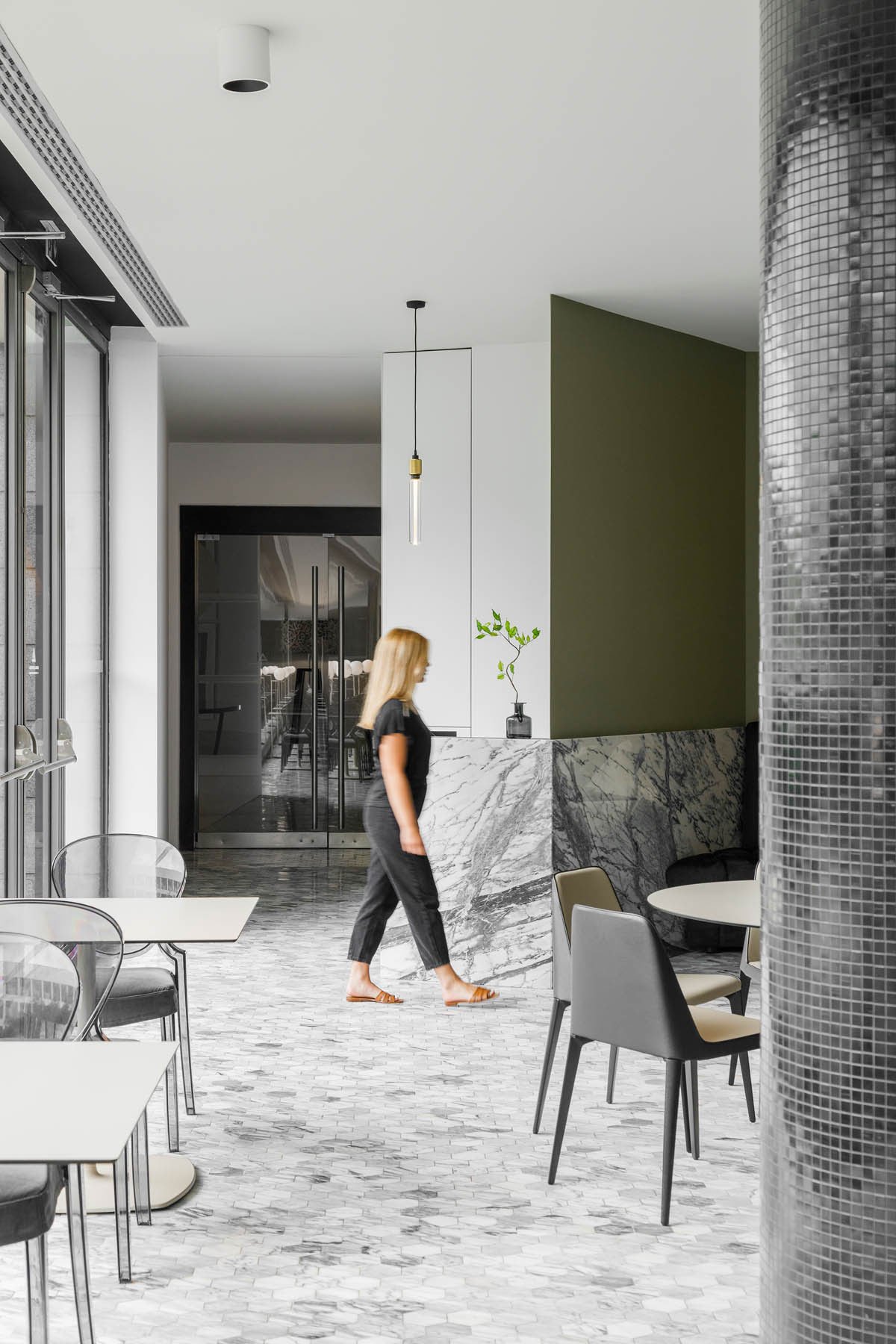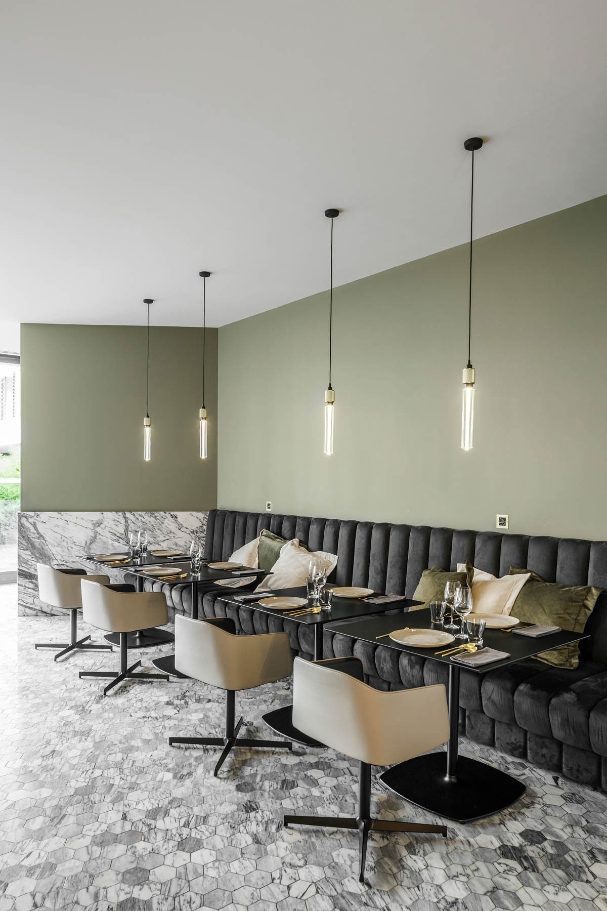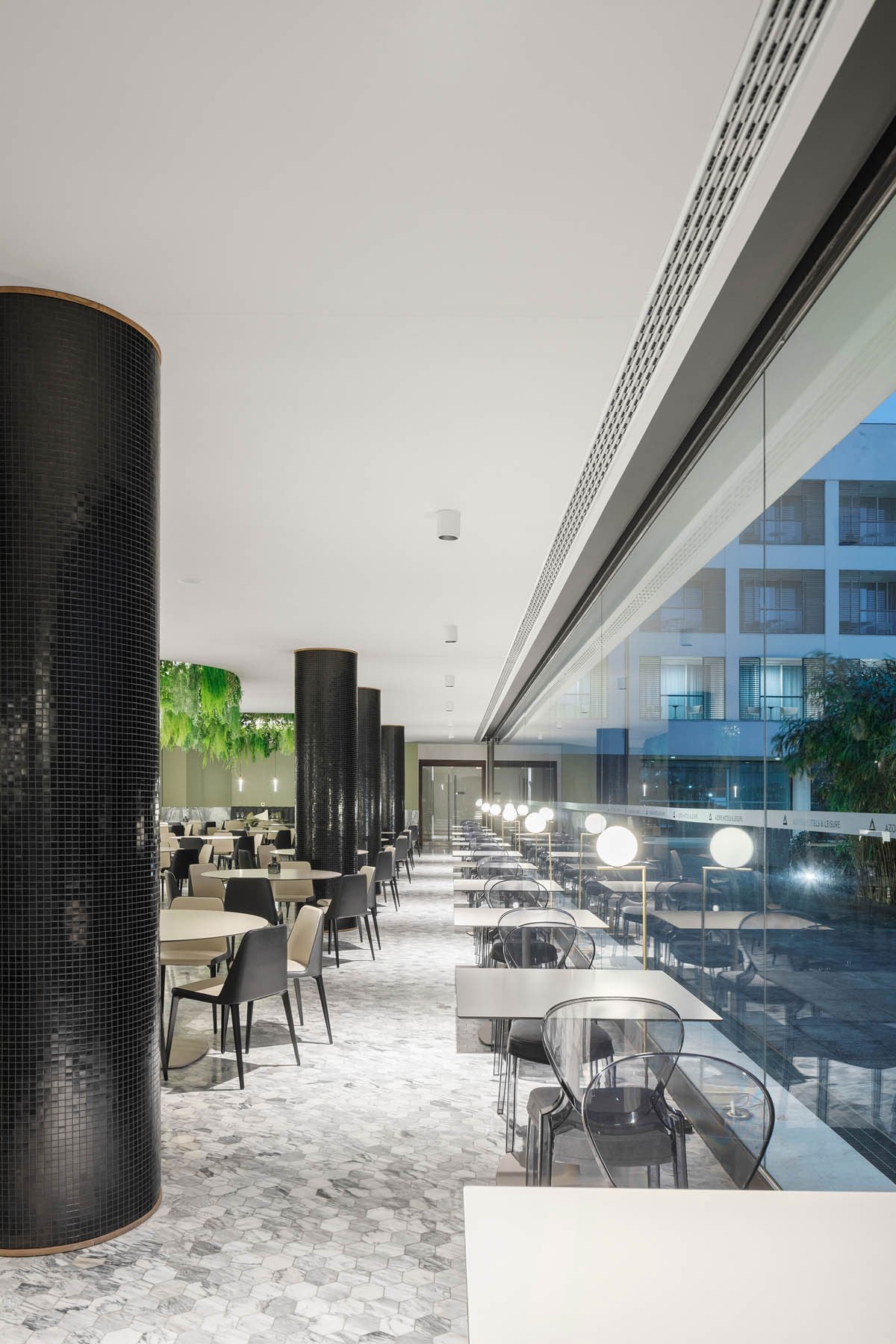 Despite the overall general view of the room, several dining areas are defined, characterized by traditional tables and in more welcoming lounge areas, in order to allow different ways of receiving, so the space can adapt to the various meal times of the day. The materials use choice was based on its nobility and resistance, in order to guarantee easy maintenance without prejudice to comfort.