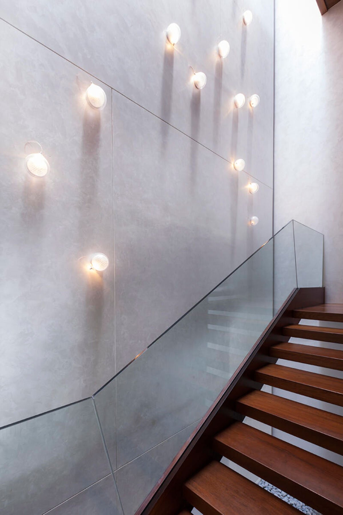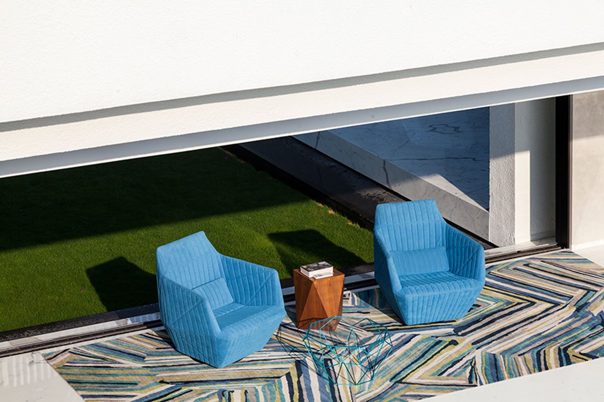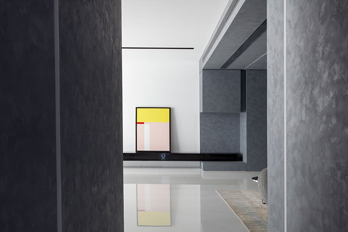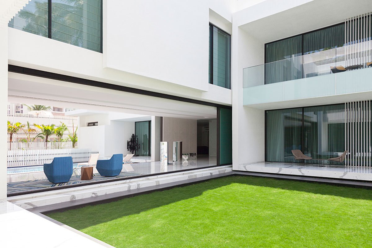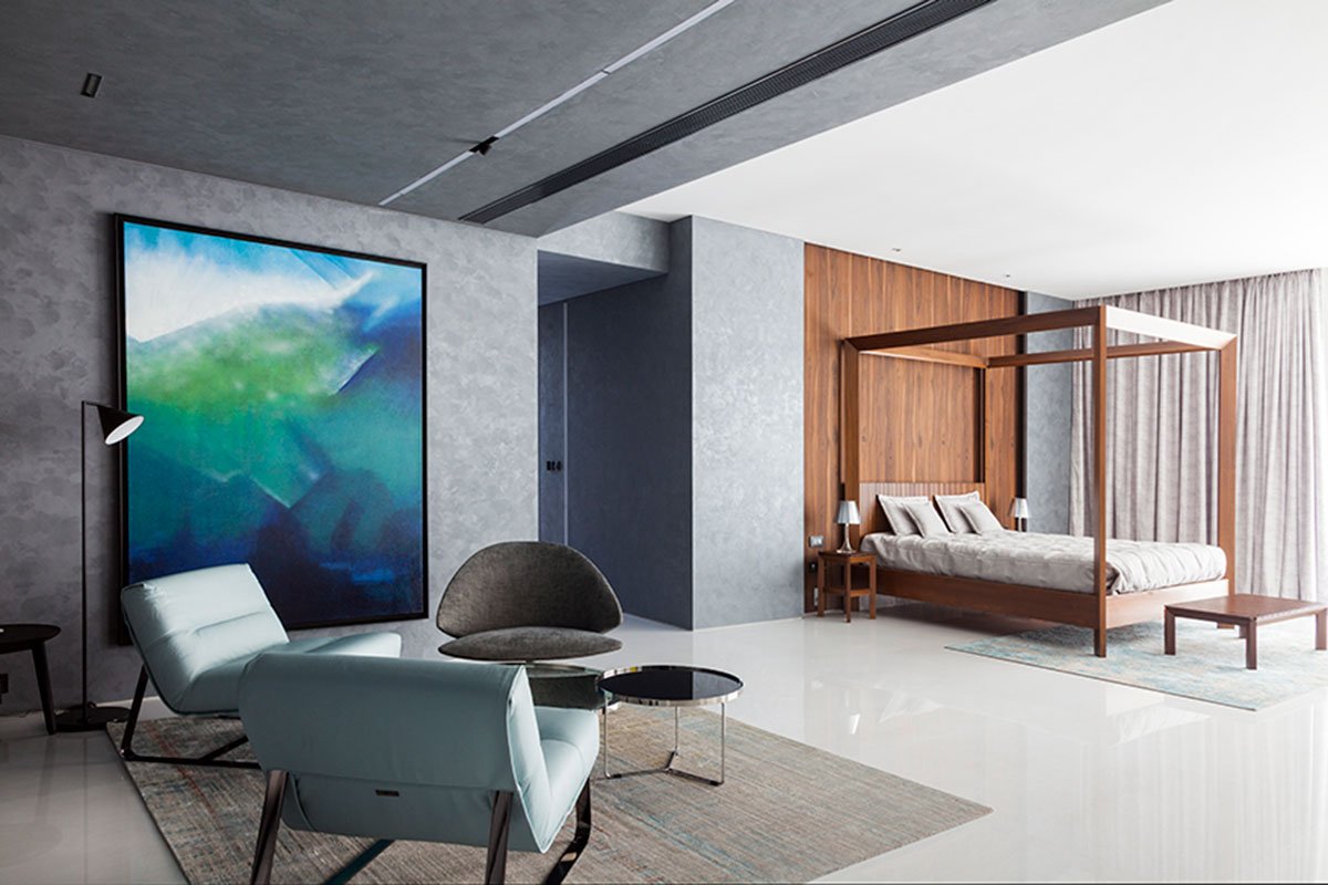 The formal articulation of the house has a minimalistic sensibility to it. Large plane surfaces enclose generous spatial volumes that overlook gardens both internal and external. A syncopated set of louvers along with the deep recesses for the windows help cut the harsh sun but enable picturesque views of the landscape. A similar sensibility flows into the interiors. Just like how museums are conceived in a way to showcase the art work, the house on the inside is imagined to be a mute backdrop to receive all the furniture in varying colors, shapes and textures. The muted backdrop helps create a cohesive feel despite the deluge of colors with the furniture and the art work. Deliberate restraint has been exercised in articulating the form and rendering the same with material.