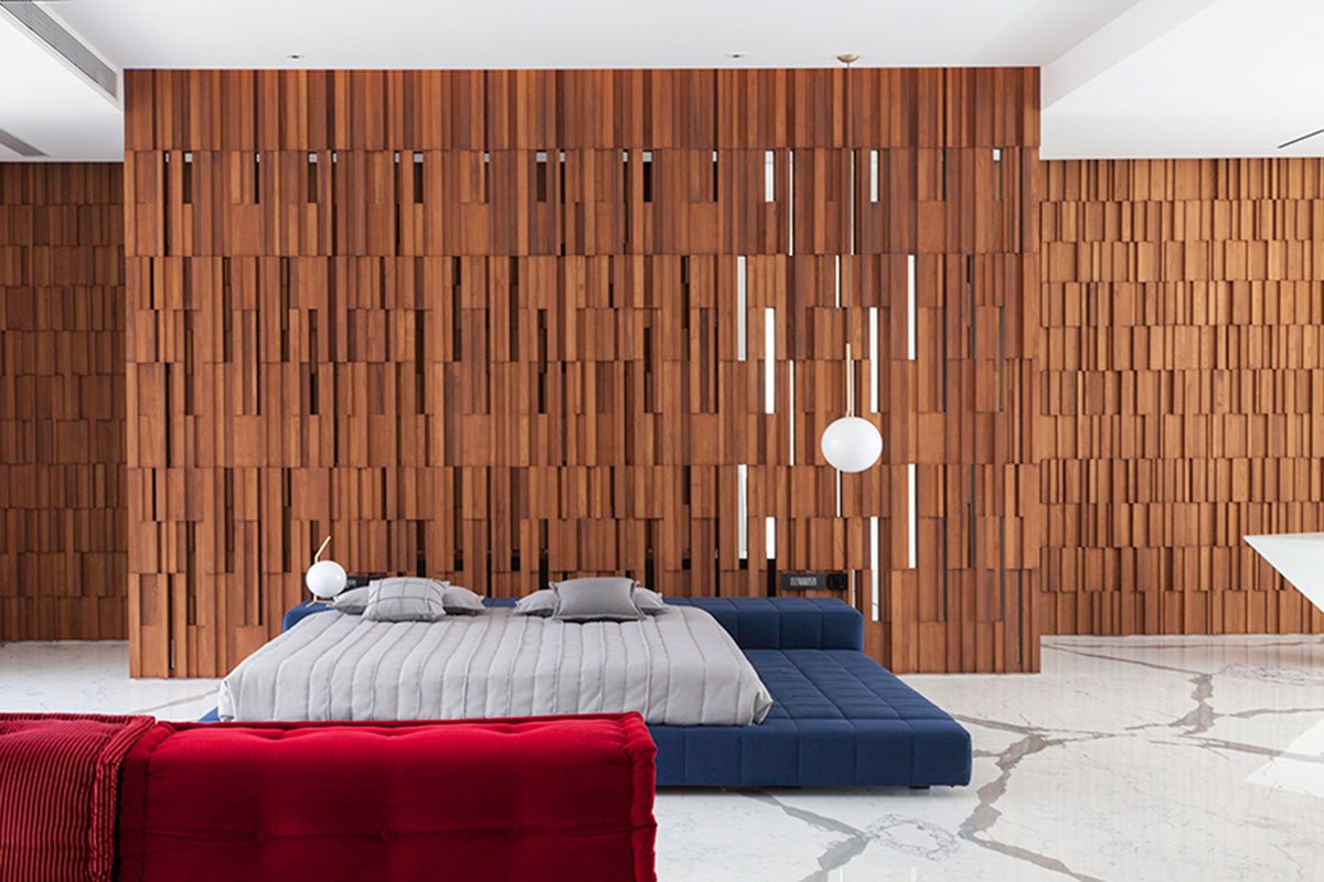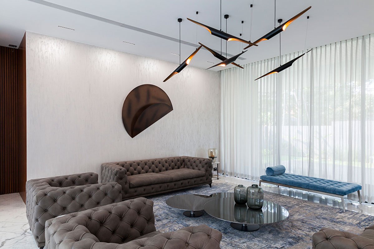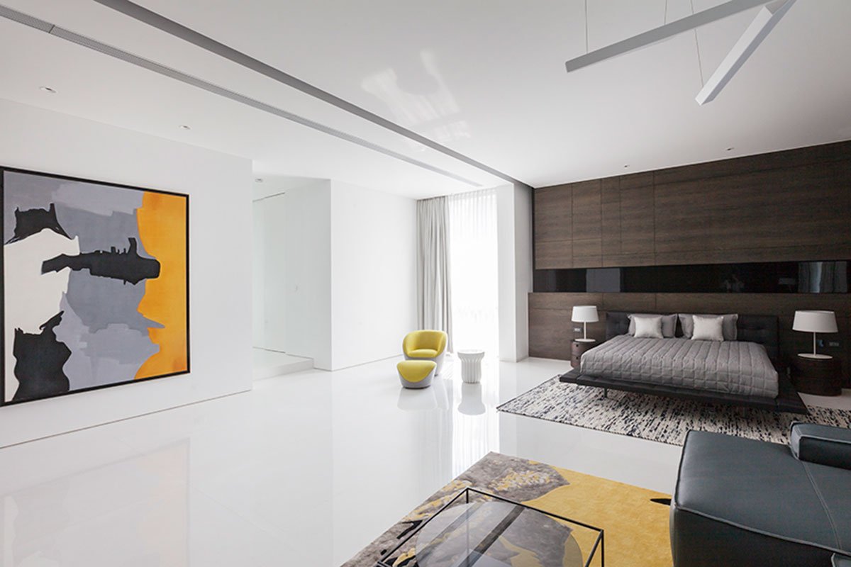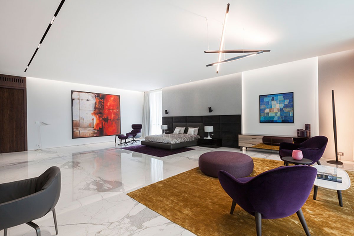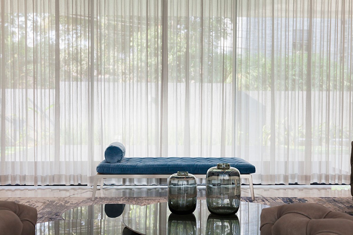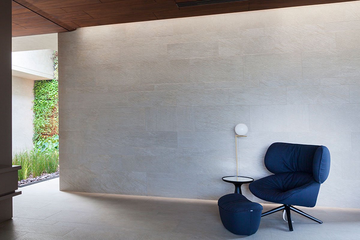 The formal articulation of the house has a minimalistic sensibility to it. Large plane surfaces enclose generous spatial volumes that overlook gardens both internal and external. A syncopated set of louvers along with the deep recesses for the windows help cut the harsh sun but enable picturesque views of the landscape. A similar sensibility flows into the interiors. Just like how museums are conceived in a way to showcase the art work, the house on the inside is imagined to be a mute backdrop to receive all the furniture in varying colors, shapes and textures. The muted backdrop helps create a cohesive feel despite the deluge of colors with the furniture and the art work. Deliberate restraint has been exercised in articulating the form and rendering the same with material.