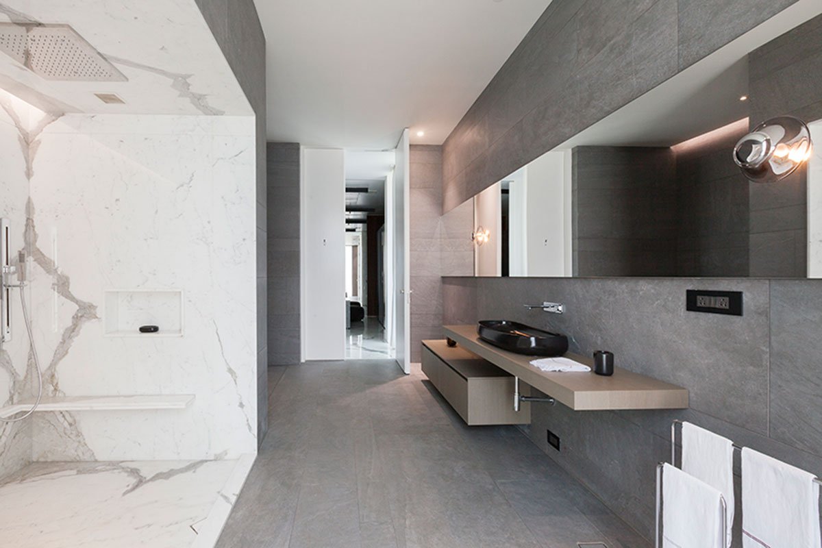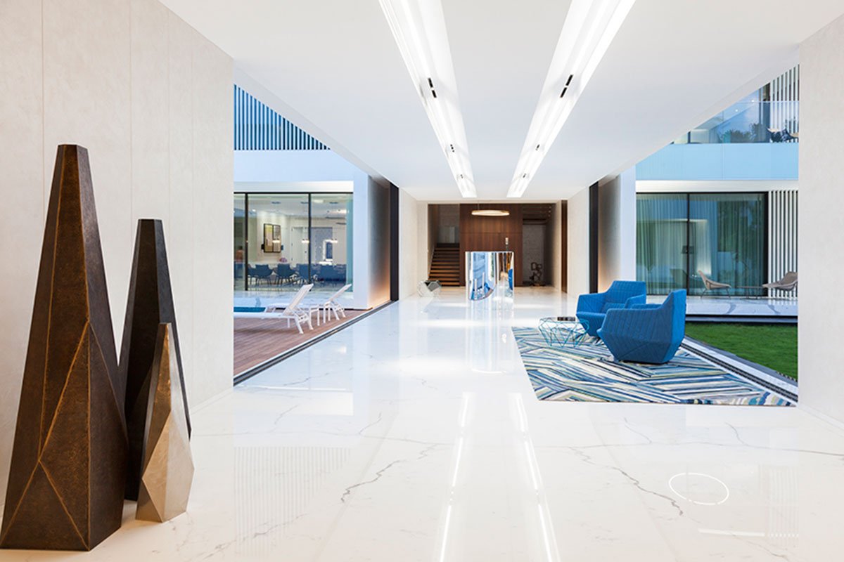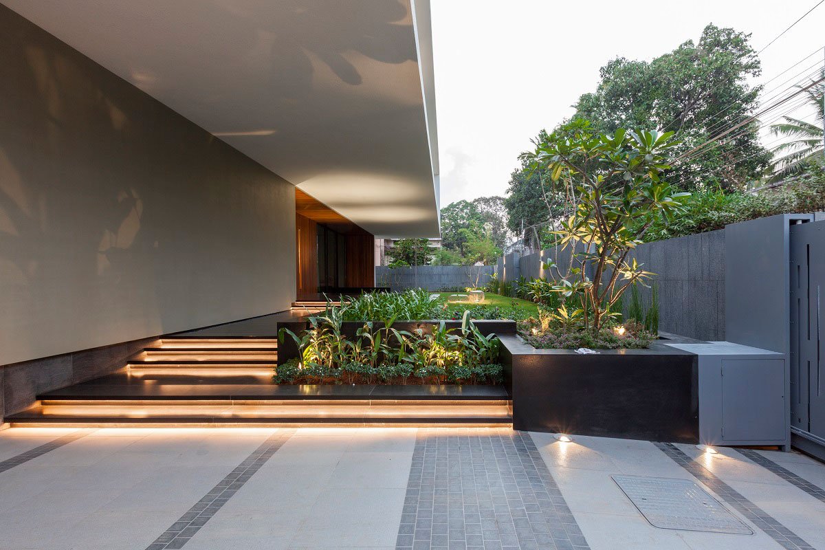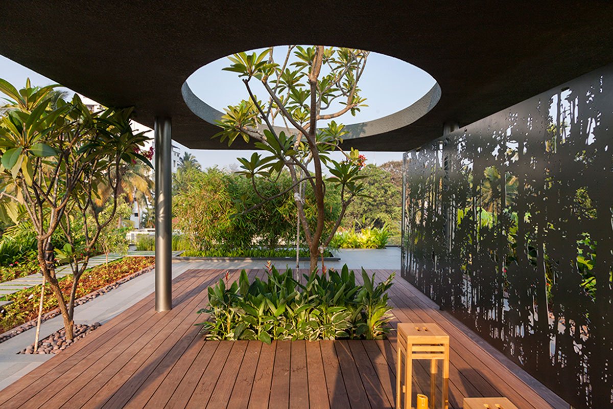 The house has three kinds of gardens/ open spaces. A semi-open garden in the foreground with a large overhang that marks the entry to the house. An eventual central courtyard with pool, sequestered, private and as an extension to the interior spaces. And a culminating open to sky garden with a gazebo on the terrace. The terrace also has gym and spa that overlook the garden.