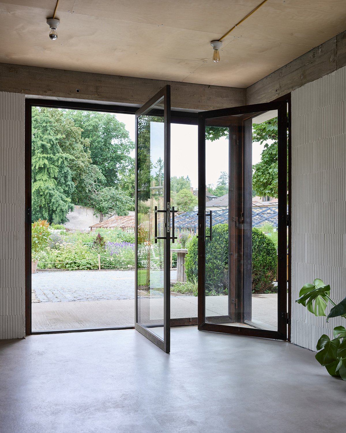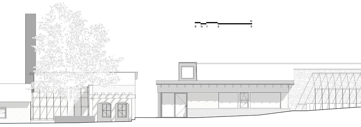 Architectural Interventions (matěj šebek architekti): The architectural adaptations of the site were conceived with an emphasis on opening the garden to the public. A key intervention by matěj šebek architekti takes place on the northeastern edge of the garden. The complex of warehouses and greenhouses from different periods is cut open in the middle, creating a new ramp for direct access to the garden itself. The new extension defines the ramp, replaces the dilapidated buildings, and adjoins the original Baroque enclosure wall. A new garden facility is being created here – a flower shop and a landscape architecture studio. The extension is a low structure that blends naturally into the original greenhouses and, with its green roof, fits into the overall context of the terraced garden.