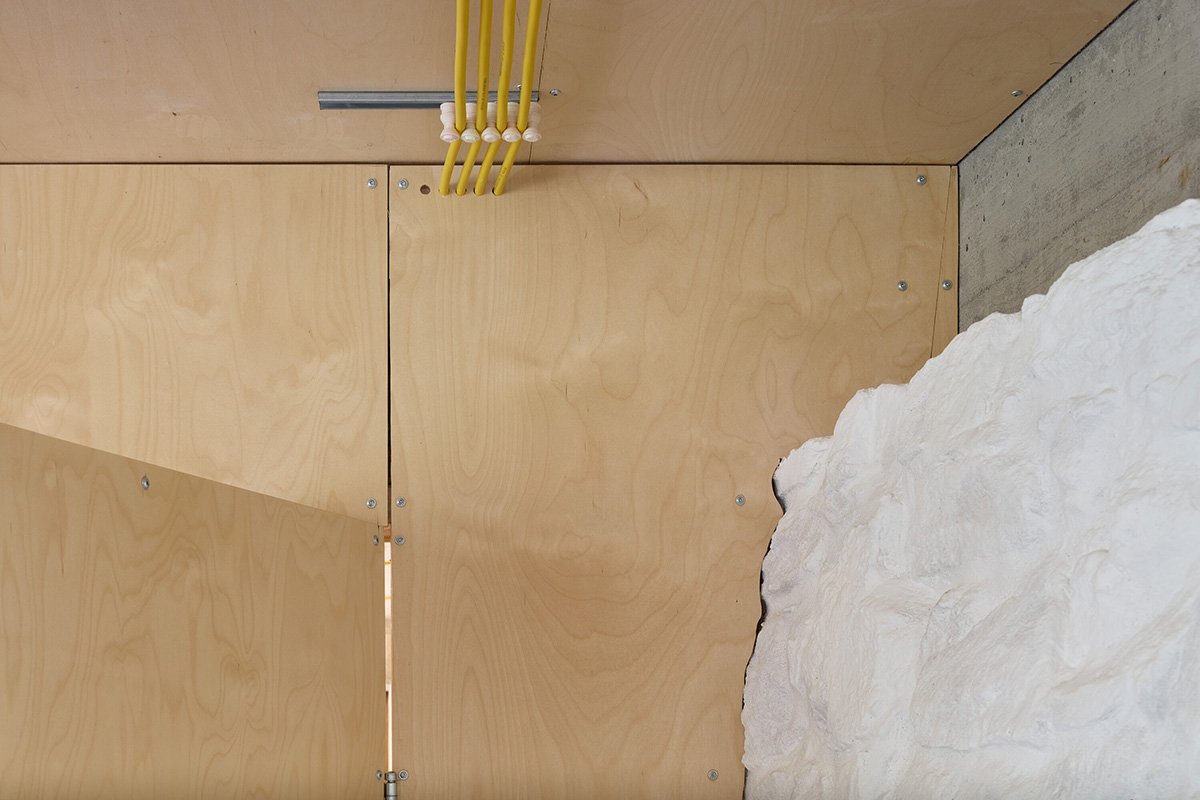 The building is topped with a flat green roof with a significant overhang to the south, which shades the intense summer sun. The dominant features are the exposed ceiling beams and the clearly defined cornice that supports them. The interior is both functional and delicate. The partition wall does not have to be permanent, which is why it is light and made of plywood. All the walls are unplastered, only whitewashed with lime, so the structure of the precise ceramic blocks meets the winding Baroque stone wall under a uniform plywood ceiling.
