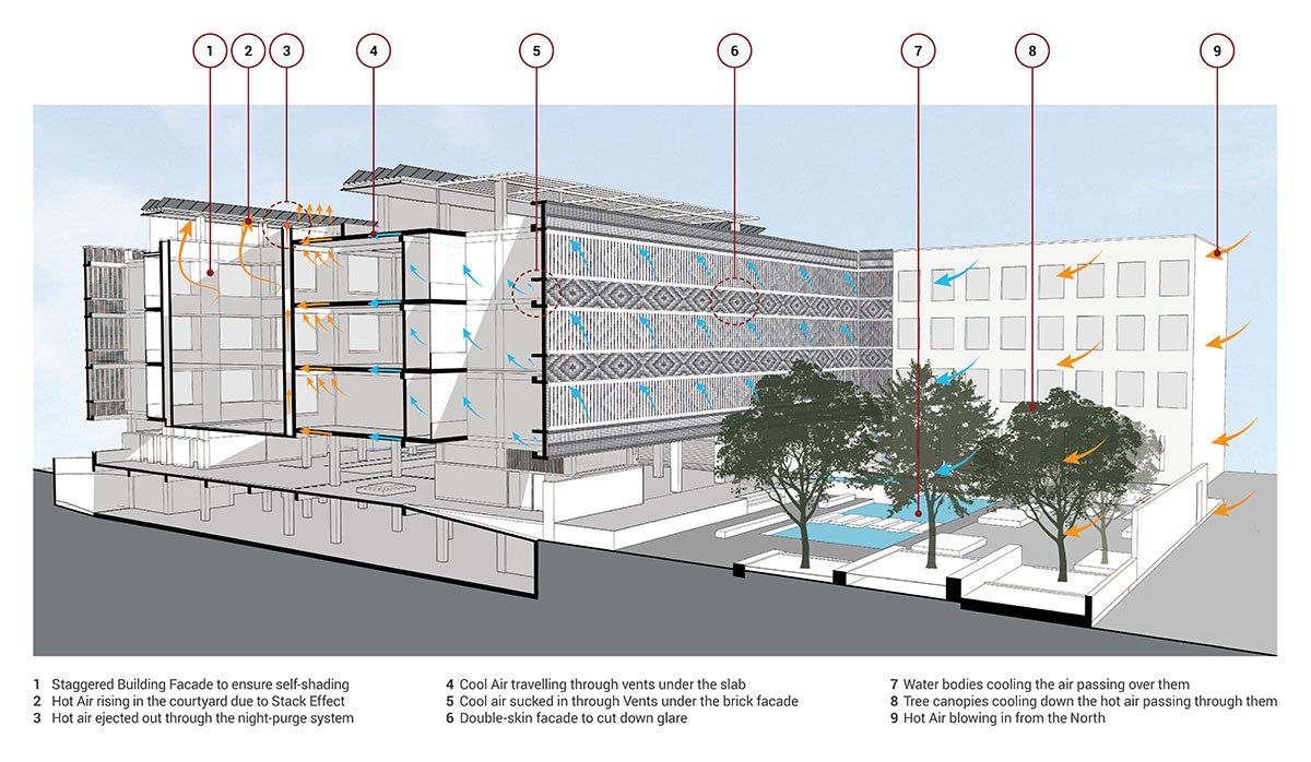 Bhubaneswar experiences significant drops in night temperatures through the year. Taking this into consideration, a simple Night-Purging system has been devised for cooling and ventilation. Through this mechanism, cool air gets pulled into the building through the northern façade when temperatures drop at night, by means of a custom designed ‘low-tech’ damper system. The high thermal mass of the building traps the ‘coolth’ and becomes a ‘coolth’ exchanger with the surrounding air in the day, when outside temperatures are higher. Consequently, the building achieves high thermal comfort for its users while cutting down the need for air-conditioning via HVAC systems to only 20% of the built spaces. Other interventions include solar panels on the terrace, on-site rainwater harvesting and wastewater treatment, and an anaerobic bio-digestive solid waste management system which generates compost and fertigation water for the landscape.