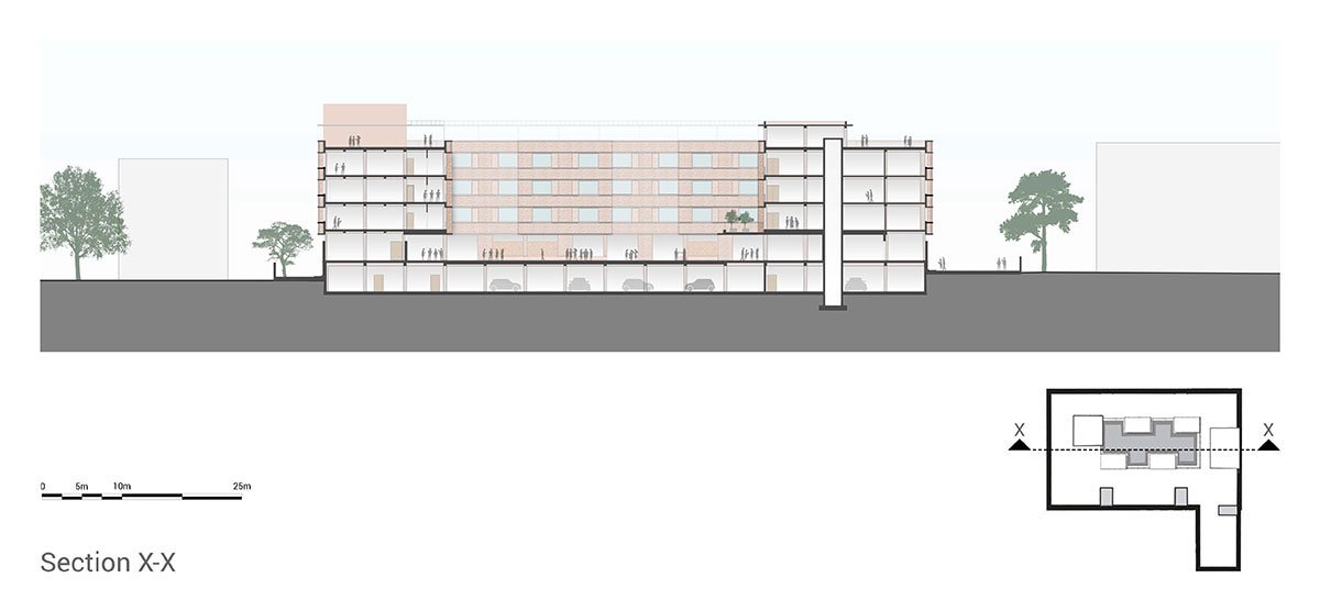 Indigenous passive design strategies contribute to the sustainability parameters of the building. The courtyard morphology and the inclusion of a stilt level aid optimal air circulation through the building, whereas the low window-to-wall ratio and deeply recessed windows and balconies help lower heat gain. The building profile along the Central Court is characterized by staggered masses which enables self-shading and blocks direct glare. The use of locally-sourced materials has also lowered the carbon footprint of the construction process. The façade has been designed to ensure 100% daylit internal spaces. Further, a double-skin facade strategy has been put in place at the complex, which consists of DGU on all external fenestration with louvers and sill projections that act as shading devices – a system that reduces heat gain to 40% by regulating ingress of sunlight.