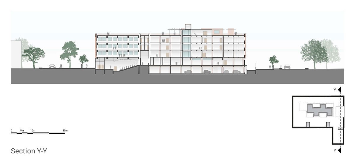 Krushi Bhawan was originally planned as a purely administrative space; Studio Lotus took a cue from Königsberger‘s original vision for Bhubaneswar where he saw the Capitol Complex with a host of government offices becoming “a lively point of public life”. Thus, the architects’ suggestion to include public functions and community spaces to create a building that would add to the city’s social infrastructure was willingly embraced by the Clients. This attempt to include the building into the public domain has been achieved by designing the Ground floor as a free-flowing public space that opens out into a Plaza, which is an extension of the street. Congruent to the project objective, the ground floor comprises of a learning centre, a gallery, an auditorium, a library, and training rooms. Similarly the roof top has been designed to house urban farming exhibits and demonstration of agricultural best practices.
