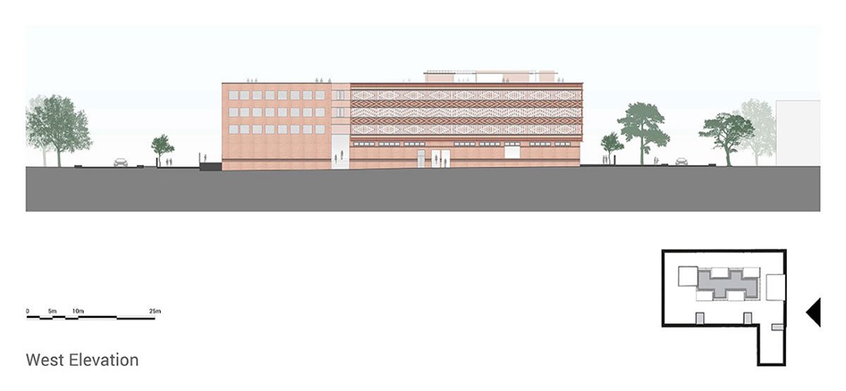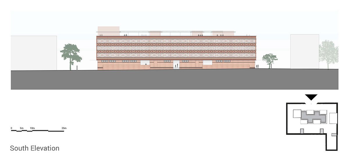 The distinct visual identity of Krushi Bhawan has been derived from regional materials and vernacular narratives, expressed in a manner that is responsive to the local climate. Over 100 highly-skilled artisans have come together to create a vibrant and contemporary narrative of traditional Odia craft depicting agricultural folklore and mythological stories, envisioned at an unprecedented architectural scale. For instance, the tribal craft of dhokra (cast metal craft) has been adapted to make light fixtures that wrap around the ground floor columns, as well as metal screens that line the building corridors. The pedestal level and North Wing use locally-sourced laterite and khondalite stone. Hand-carved khondalite lattices provide a sense of enclosure to the Central Court. Similarly, agricultural motifs have been displayed across the building through a variety of craft techniques – such as the bas-relief carvings in laterite along the Public Plaza, which depict ripe paddy crops illustrated in the Odia Pattachitra (cloth-based scroll paintings) style. In the Central Court, a Crop Calendar has been created on a stone inlay floor, which displays the harvesting cycles for the most prevalent crops in Odia farmlands. The upper floors of Krushi Bhawan feature a distinctive brick façade inspired by Ikat patterns of Odisha handlooms, created using clay in three different colours that represent the geographical diversity of the region. This brick-louvered screen wraps around the building like a second skin.
