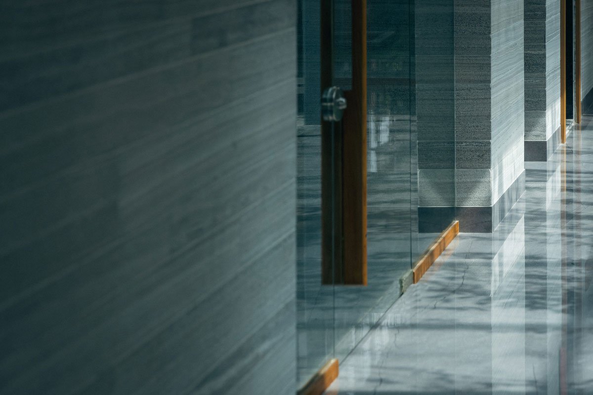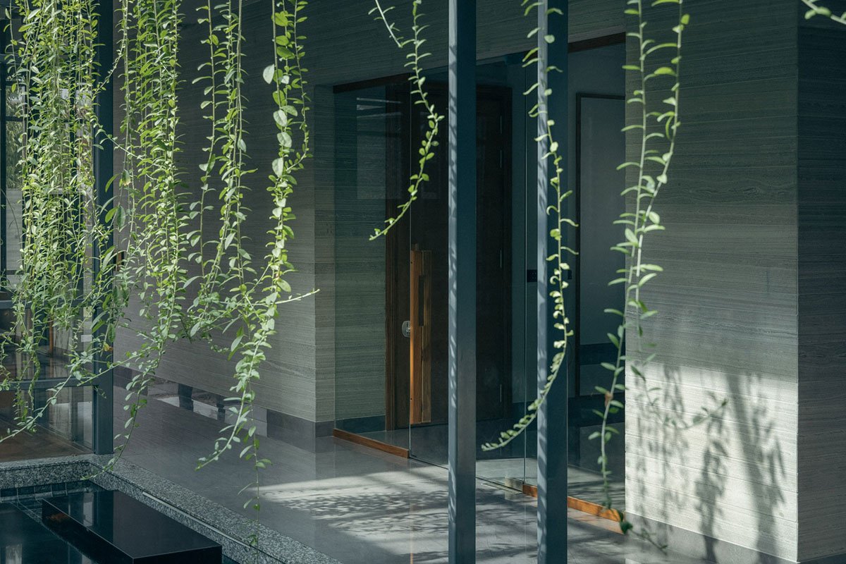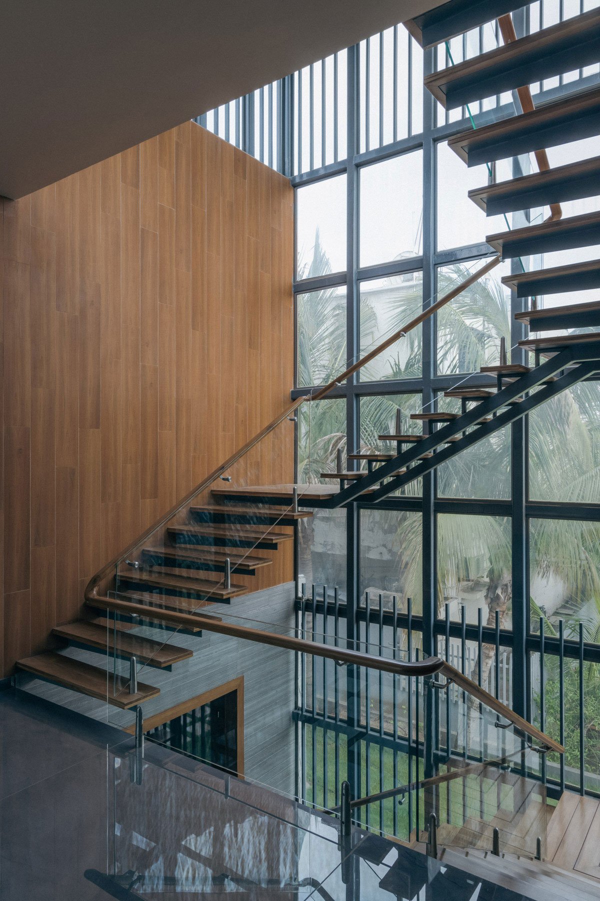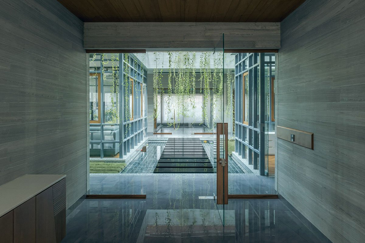 Instead of being a rectangular plan with a void in the middle, the volume of the house is detailed as being made of two L-shaped masses which connect each other through small bridges, hence forming the loop. All the spaces between the two L shaped masses are made through a metal grid which changes the feel of the space, helping in perceiving the transition from one to another.