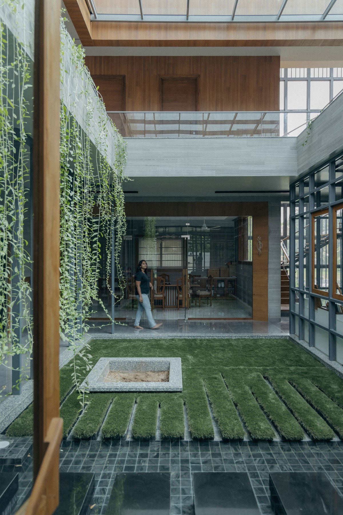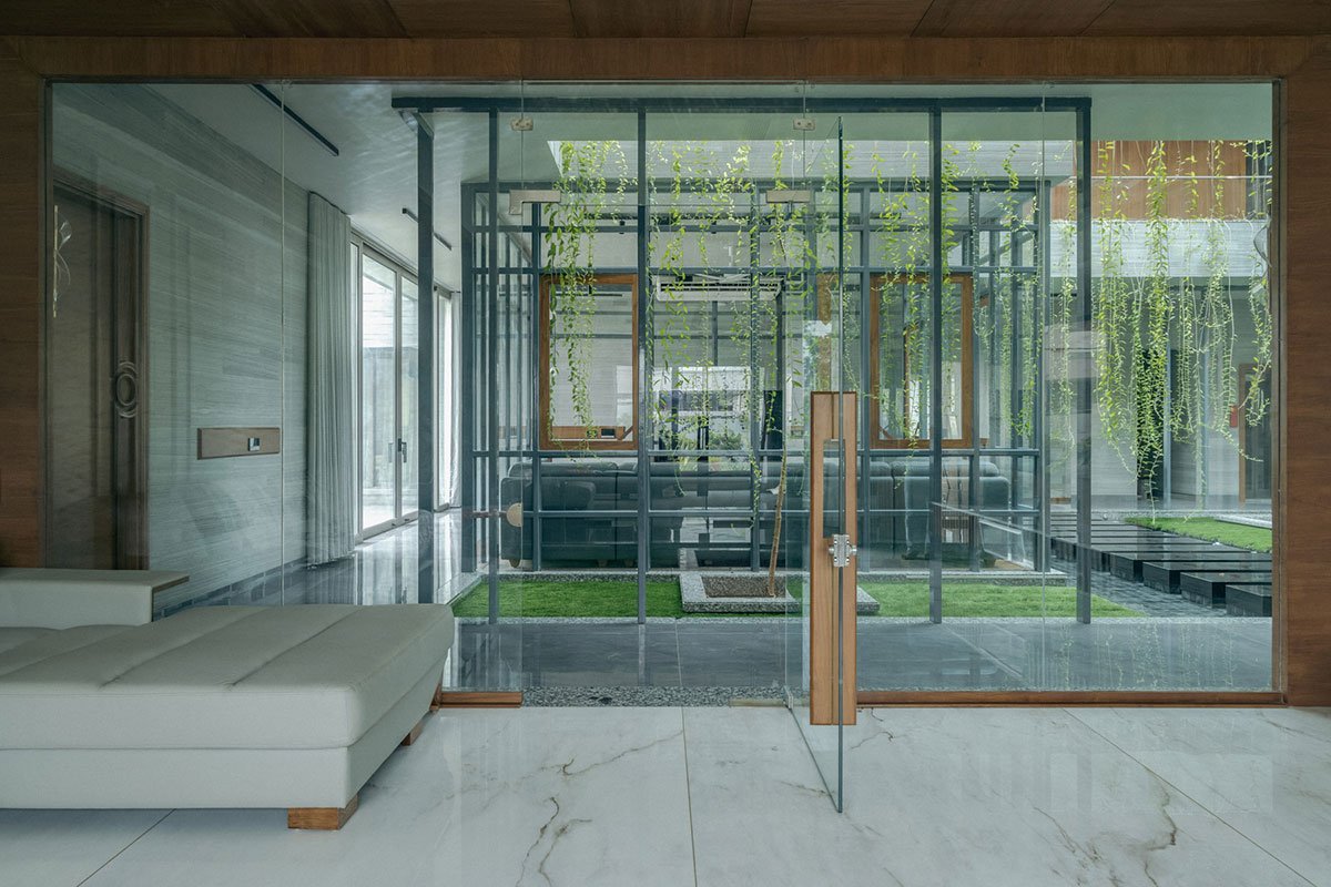 Excerpt: Saransh’s KSH House is a residential project centred around a courtyard that serves as the main attraction for all of the spaces. Two L-shaped masses that are connected to one another by small bridges form the house’s detailed volume, resulting in a loop. This house’s focal point features a metal grid that changes the atmosphere by serving as a transitional element between the spaces formed by the two masses.