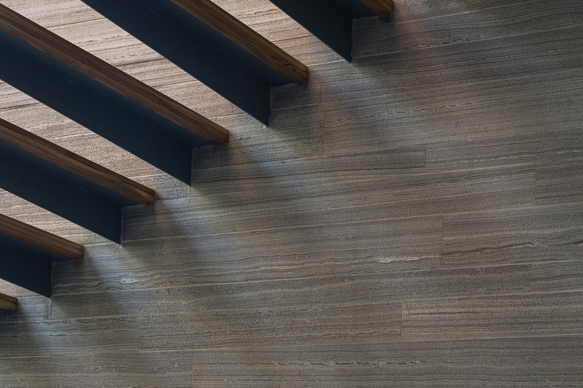 The base being a strong stone one while the first floor being made out of a much lighter looking wooden facade. A flat white mass is inserted to highlight the entrance in an otherwise strongly textured and earthen elevation. All the fenestrations are made with MS overhangs with wooden shutters.