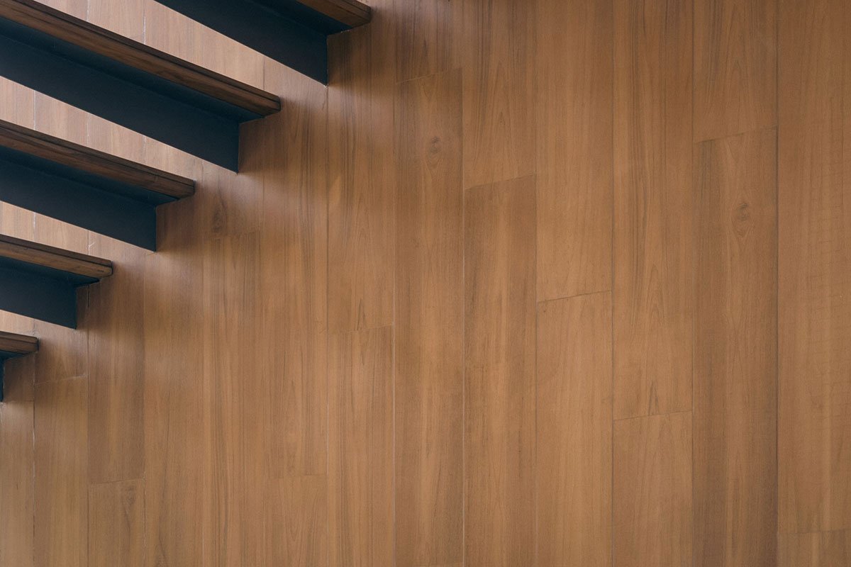 To reduce the bulkiness of the otherwise huge volume, both the floors of the house are differentiated through the facade by creating a small recess and at the same time changing the materiality.