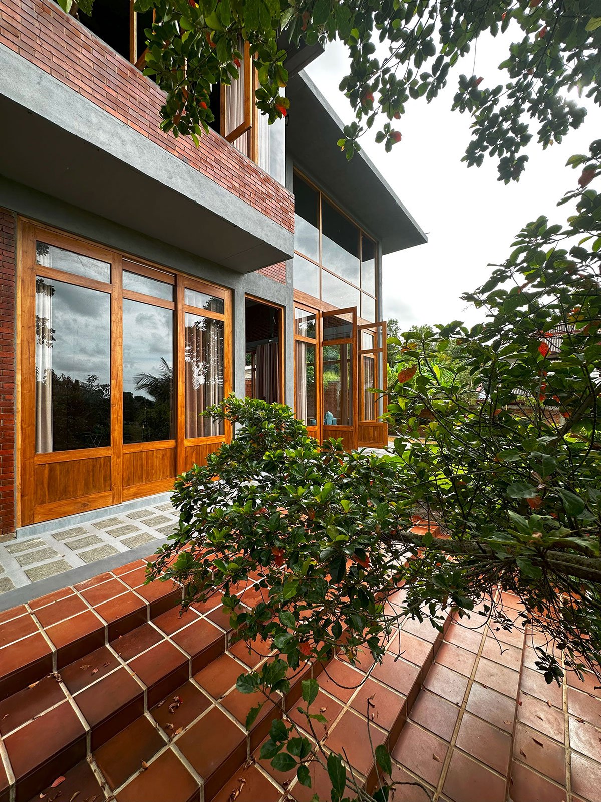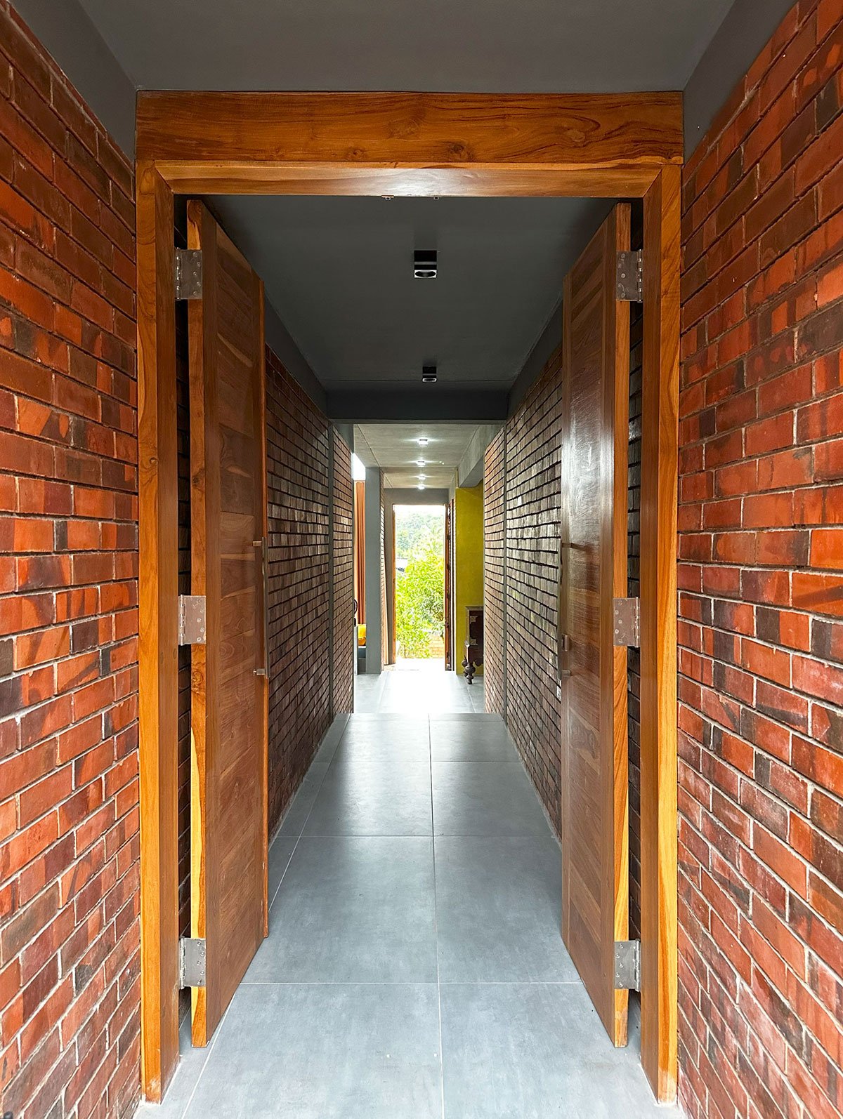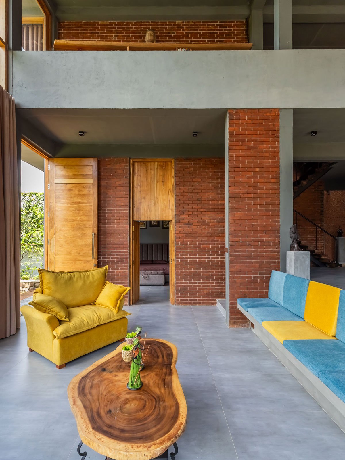 Material expression is a defining feature of the villa’s aesthetic. Natural teak timber is seamlessly integrated into doors and windows, establishing a harmonious dialogue with the rugged brick textures. This interplay between materials creates a robust yet elegant design, celebrating the warmth and grandeur of natural elements. Rooted in local craftsmanship and materiality, the villa’s palette emphasizes contextual relevance while remaining timeless in its execution.