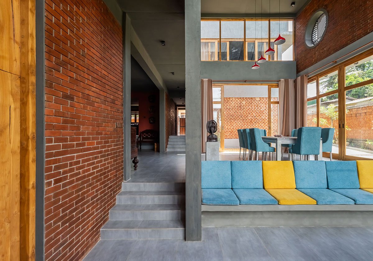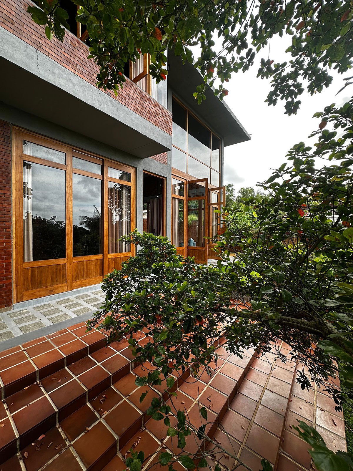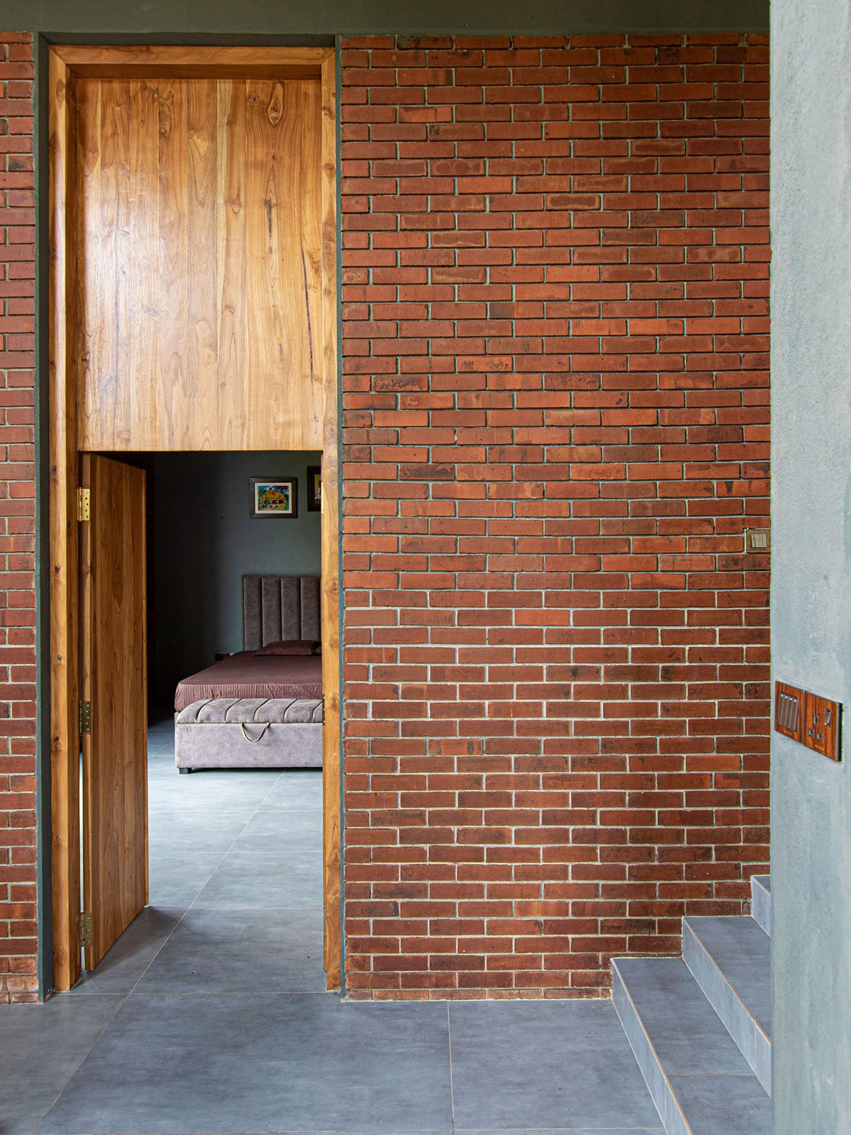 Material expression is a defining feature of the villa’s aesthetic. Natural teak timber is seamlessly integrated into doors and windows, establishing a harmonious dialogue with the rugged brick textures. This interplay between materials creates a robust yet elegant design, celebrating the warmth and grandeur of natural elements. Rooted in local craftsmanship and materiality, the villa’s palette emphasizes contextual relevance while remaining timeless in its execution.