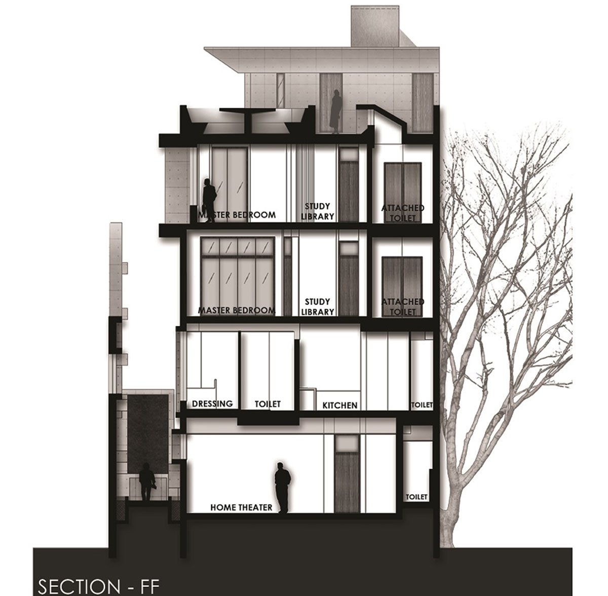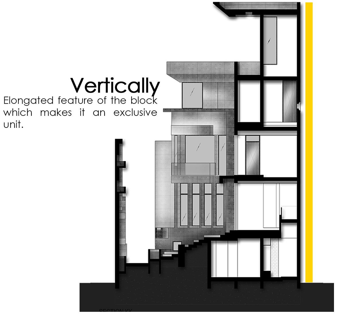 Due to the linear shape of the site we have a building which is elongated on one side and is proportionately shorter on another. Thus the end product is linear both in plan and in elevation. The linearity in elevation indicates multiple levels and sections which are divided cause of different of functions and necessities.
