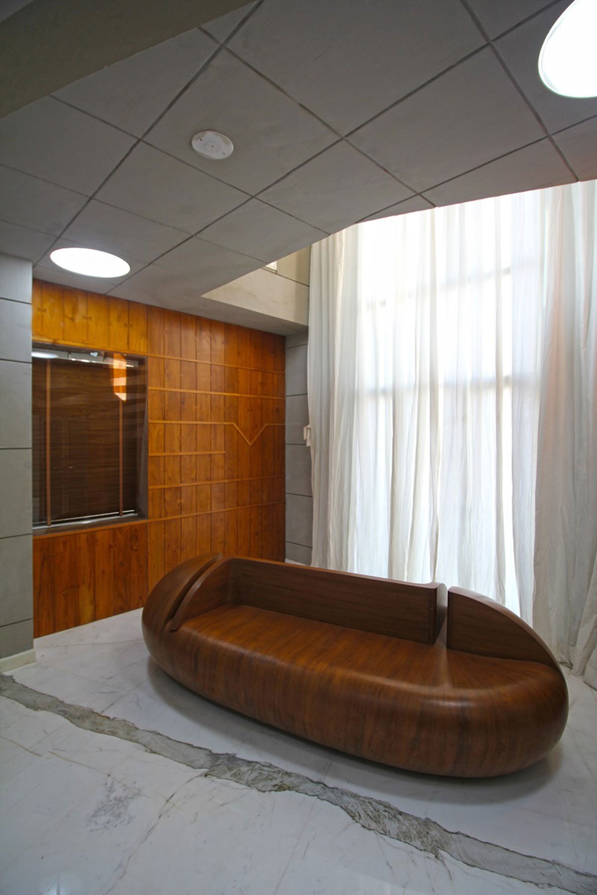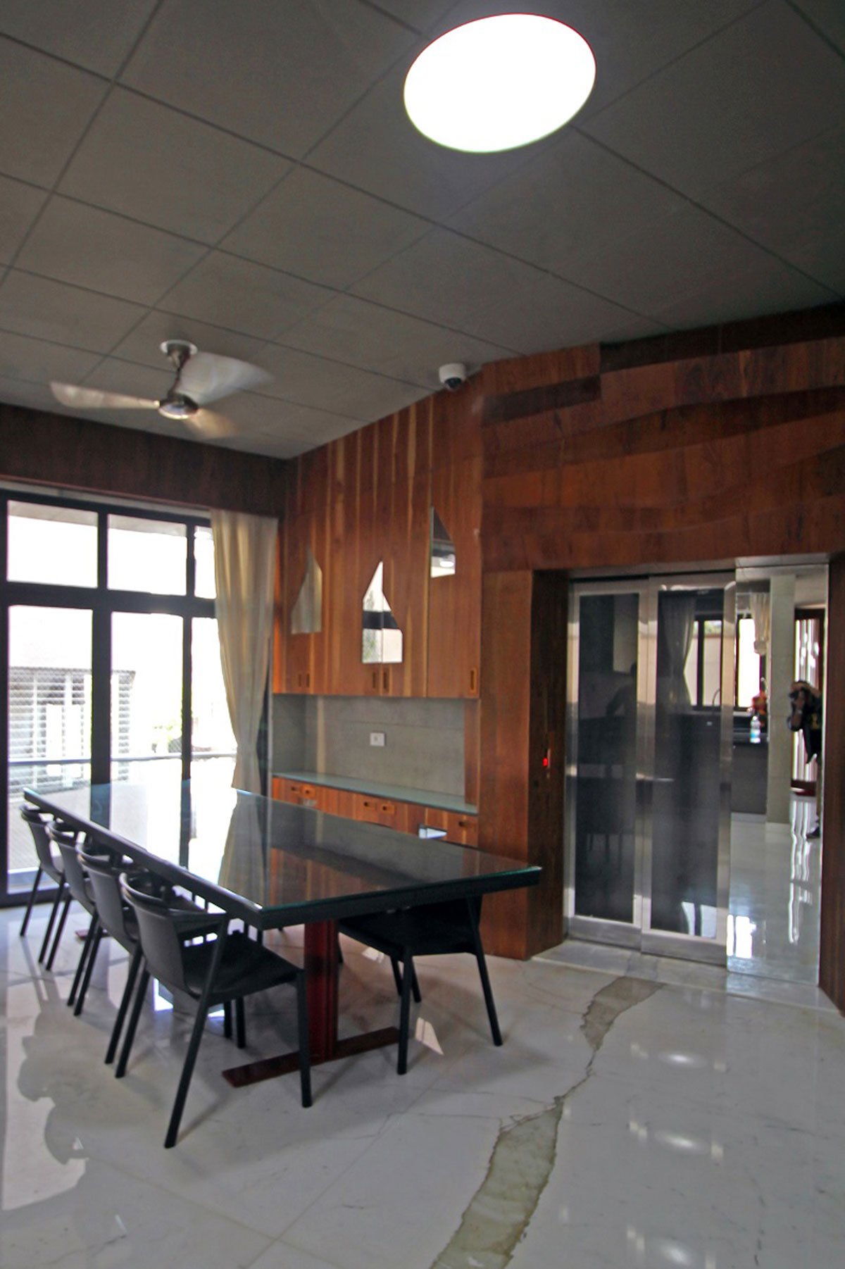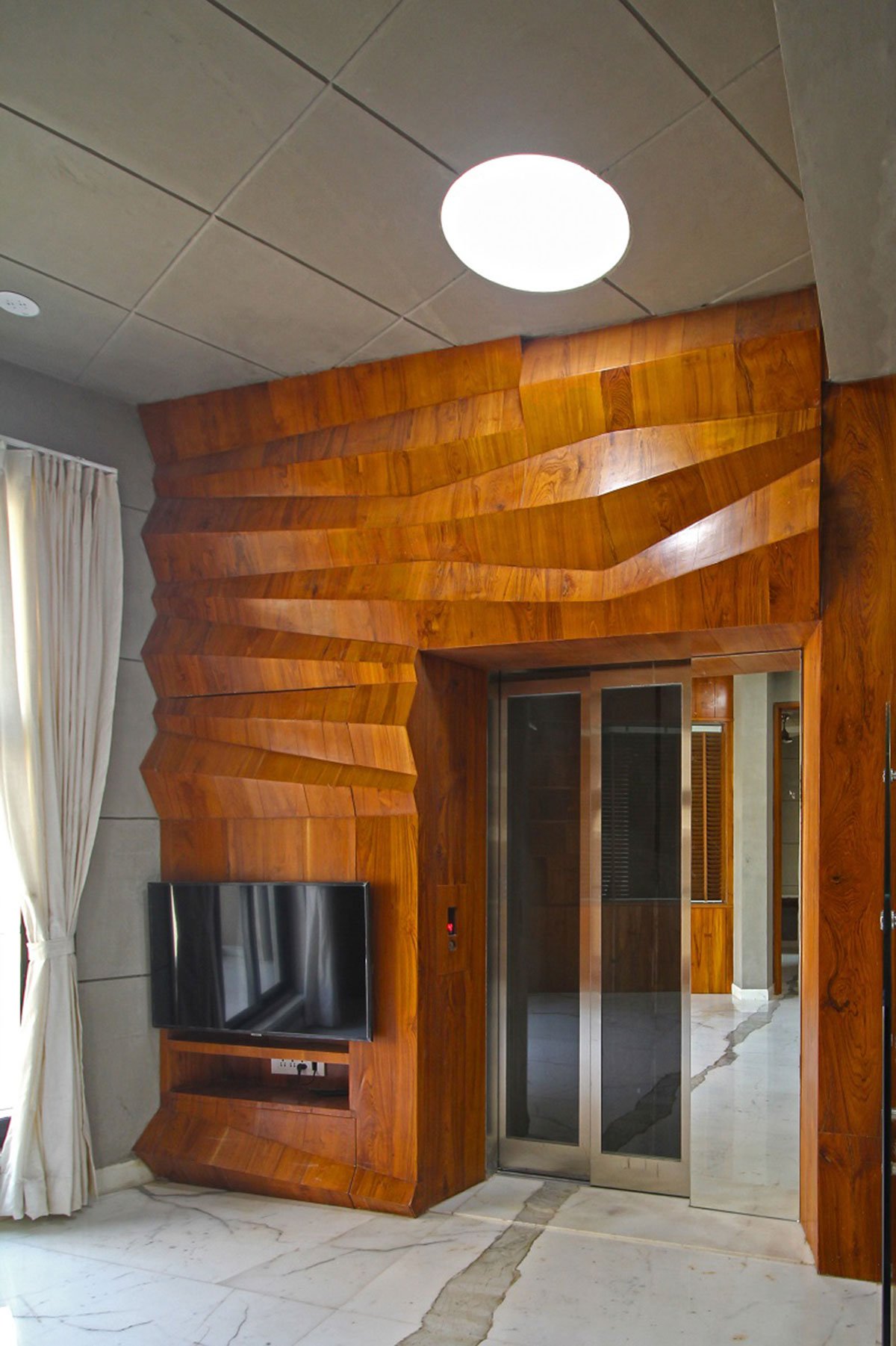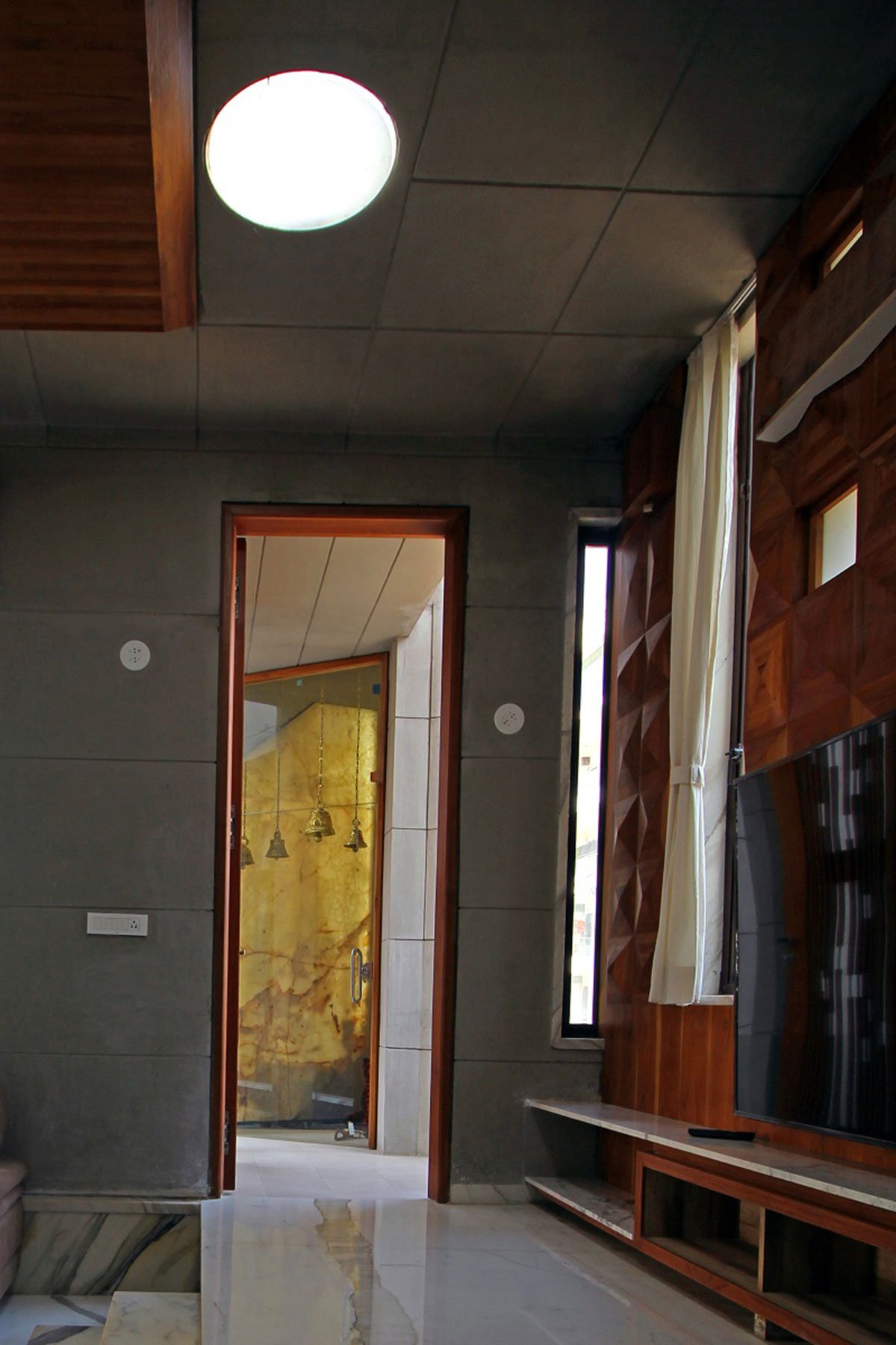 Due to the site constraints of orientation the amount of light received by us is not entirely sufficient. Therefore to maximize this feature we have adopted simple measures such as multiple open spaces, cut outs, punctures, skylights, and most importantly the flooring- which is natural starch white stone tiles which has a prominent natural vein and this reflects and brightens even the tiniest ray of light which falls within. Making you believe that there is ample amount of light falling within and it’s always bright.