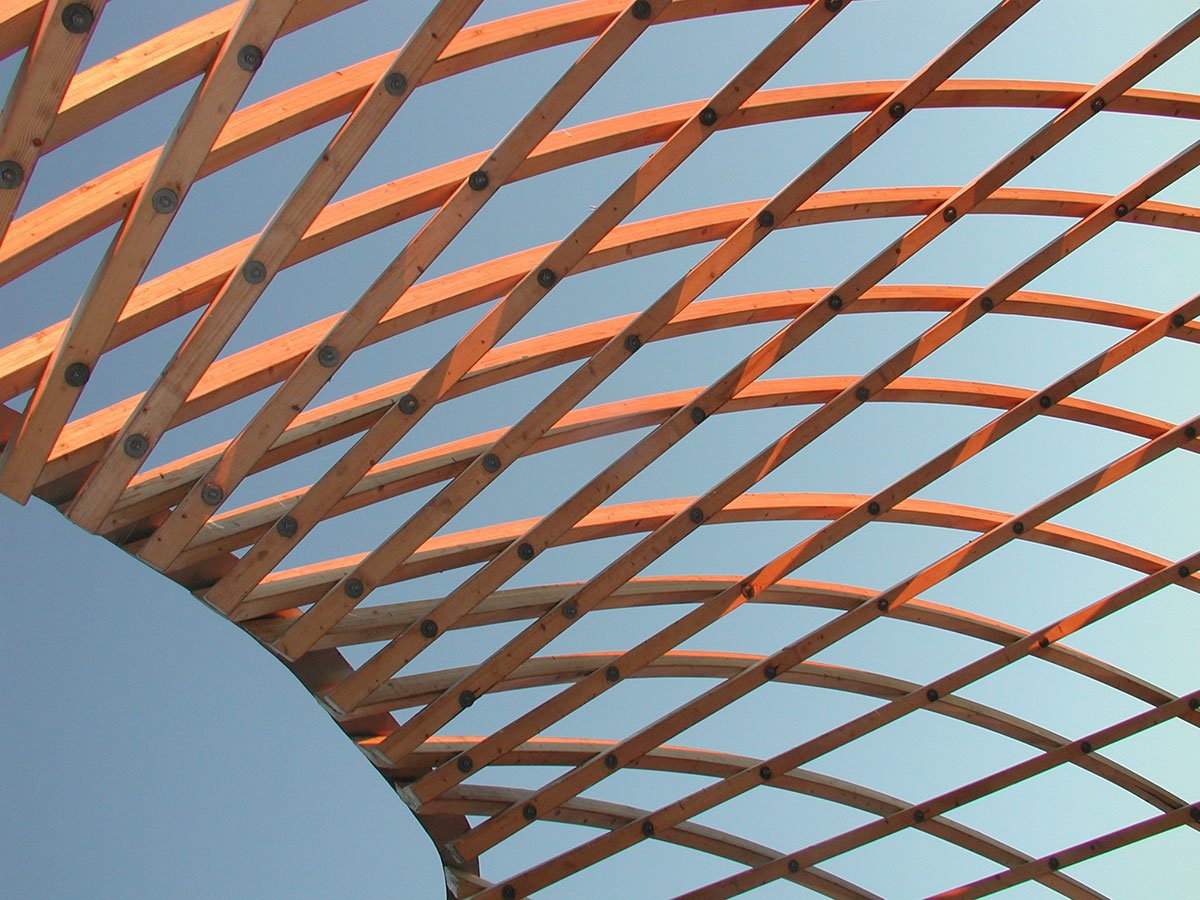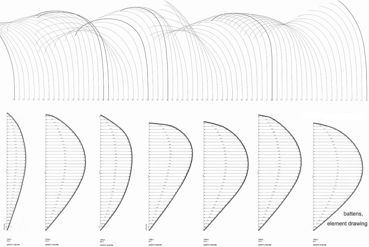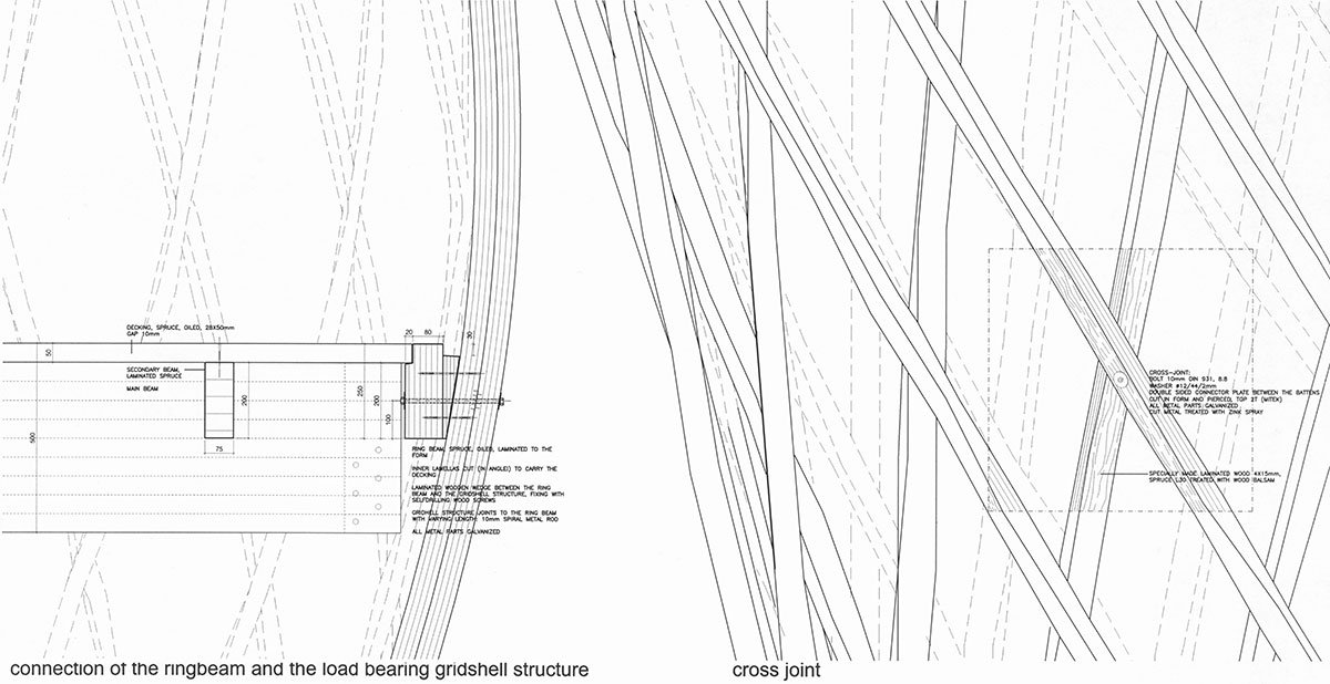 After the workshop, the architects laminated full-scale test pieces of battens, which form the basket-like gridshell. They studied whether the pre-bent battens tolerate bending and twisting to a sufficient degree as to allow their use in a construction of this type. When the laminated timber resisted twisting they resorted to steaming, a traditional method in boatbuilding. The effect of surface treatment with linen oil-based wood balm on moisture content was determined by moisture tests and the durability of the joints was proved by tension tests.