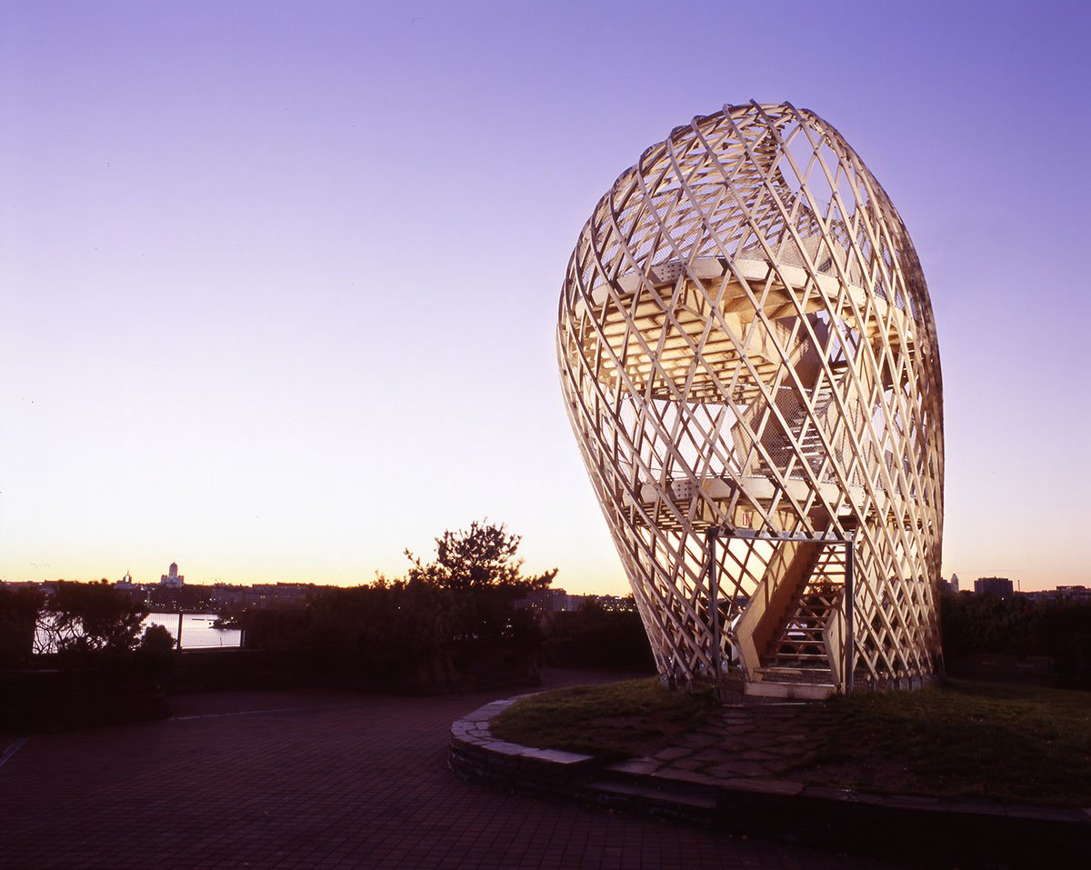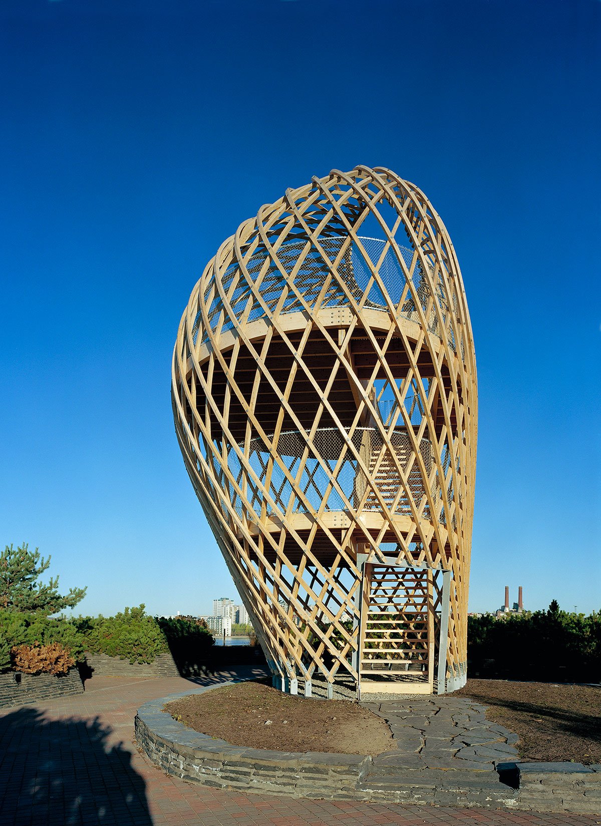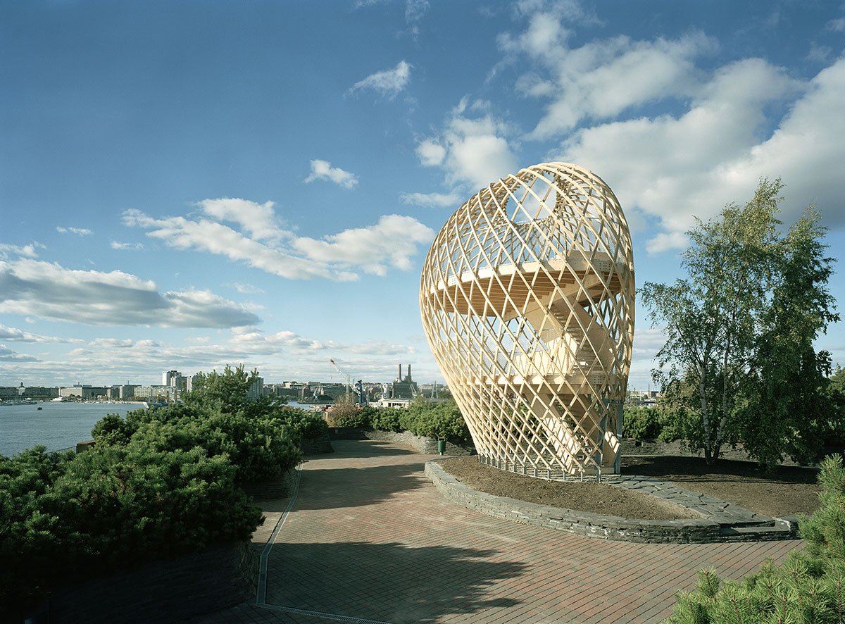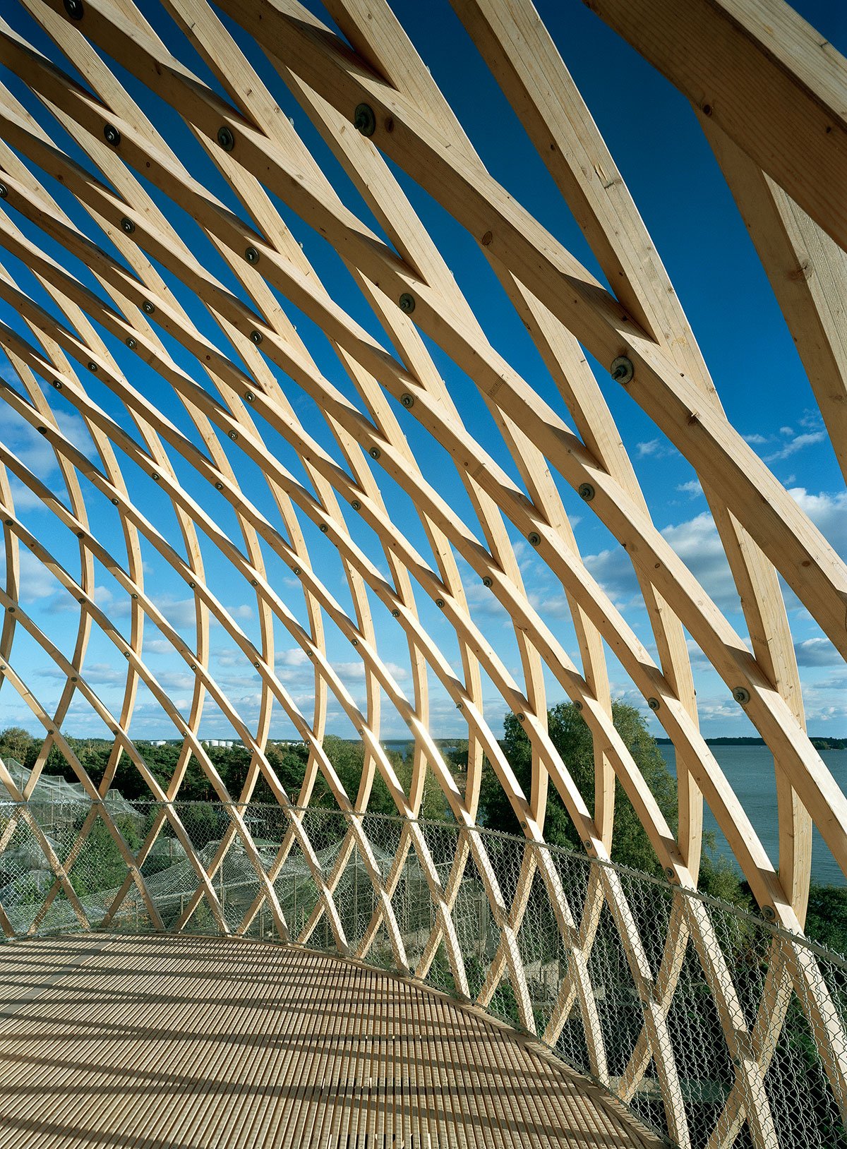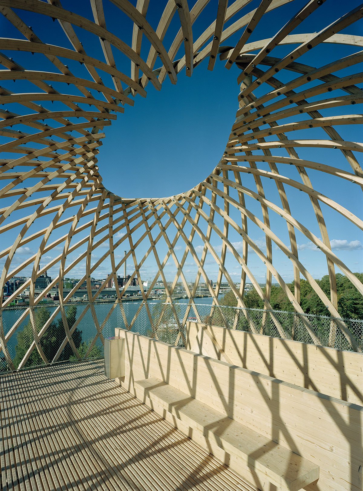 The site is eighteen metres above sea level and the tower is very visible in the Helsinki sea line. A wonderful view of the sea and the city centre opens up from the ten-metre-high two-storey tower. The structure behaves like an eggshell; even when the gridshell, which consists of over 600 joints, is punctured it withstands the load. The load bearing structure consists of 72 long battens with a section of 60 mm x 60 mm that are bent and twisted on the site from seven pre-bent types. As the tower has no structural protection against weathering, it is treated with a linen oil-based wood balm with UV-protection.