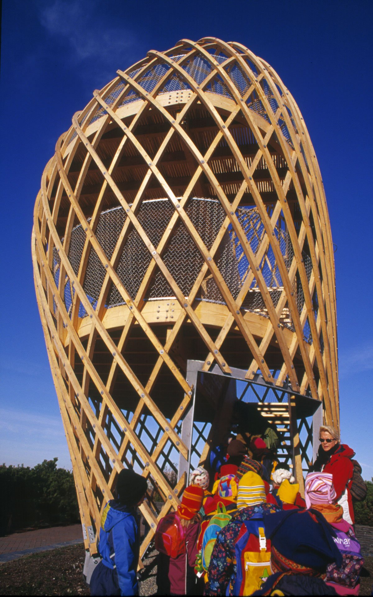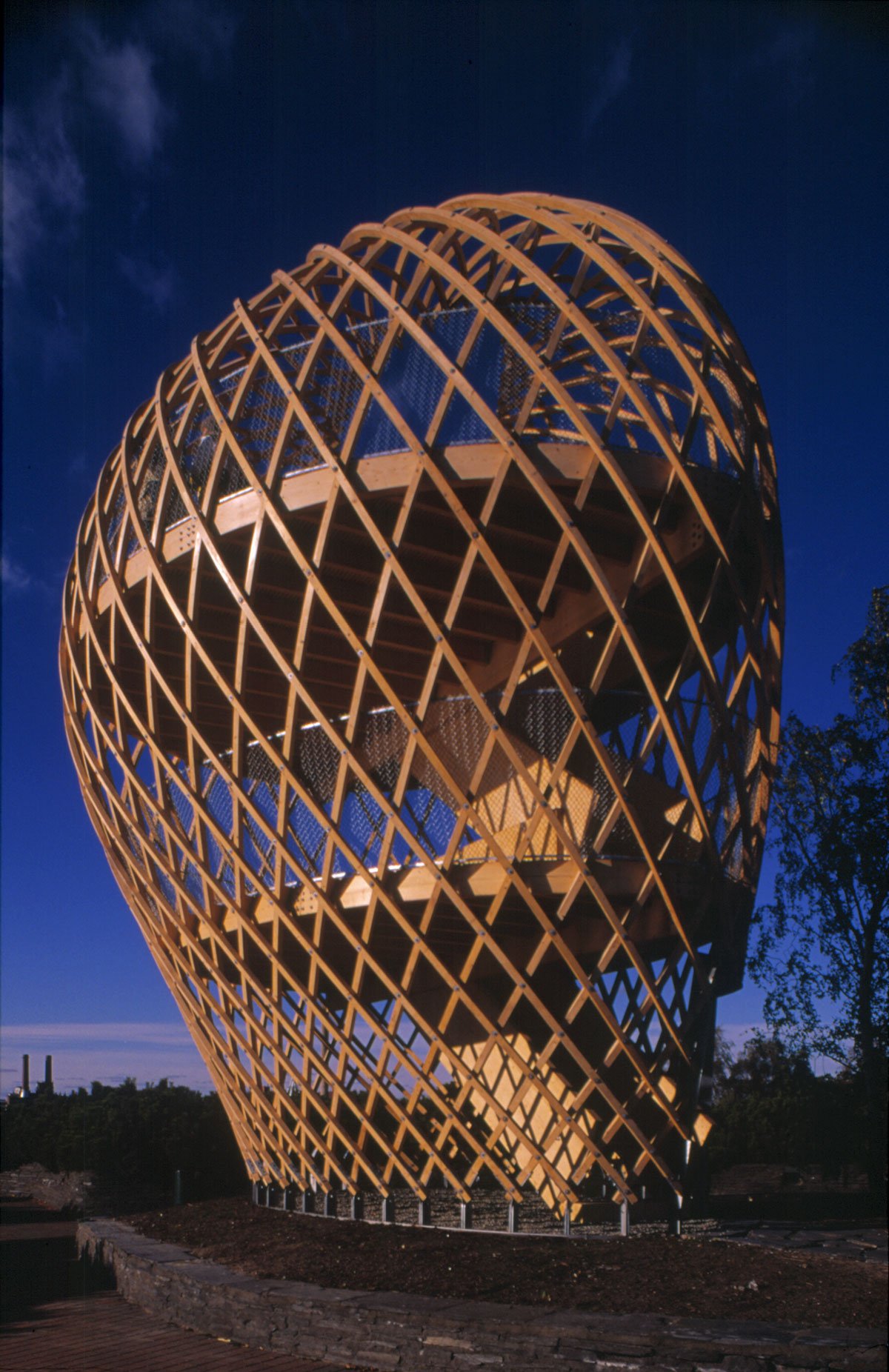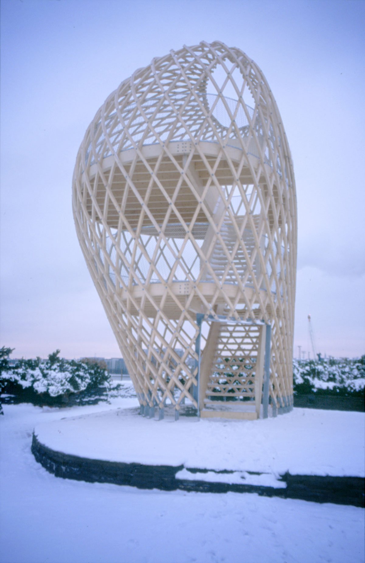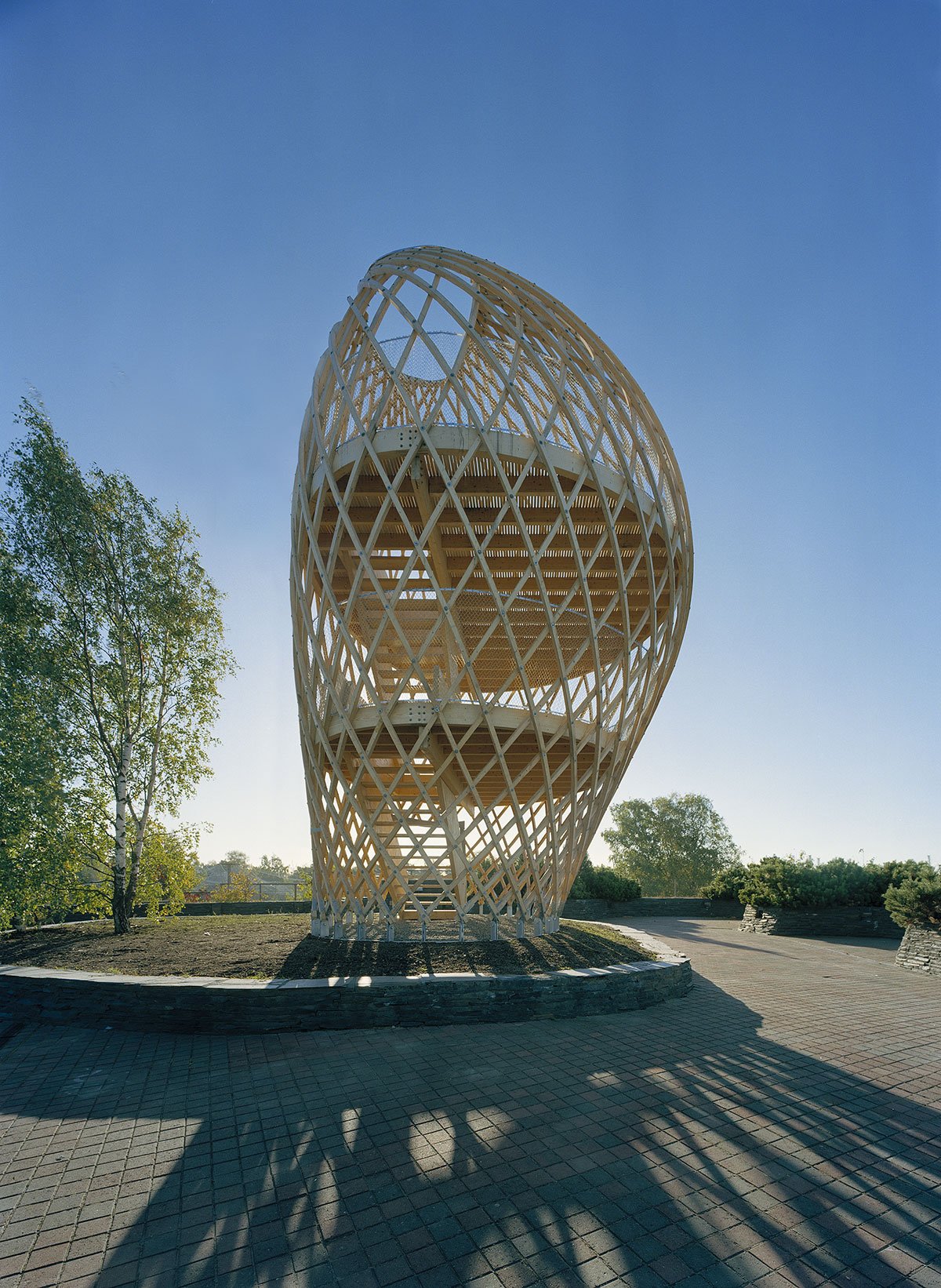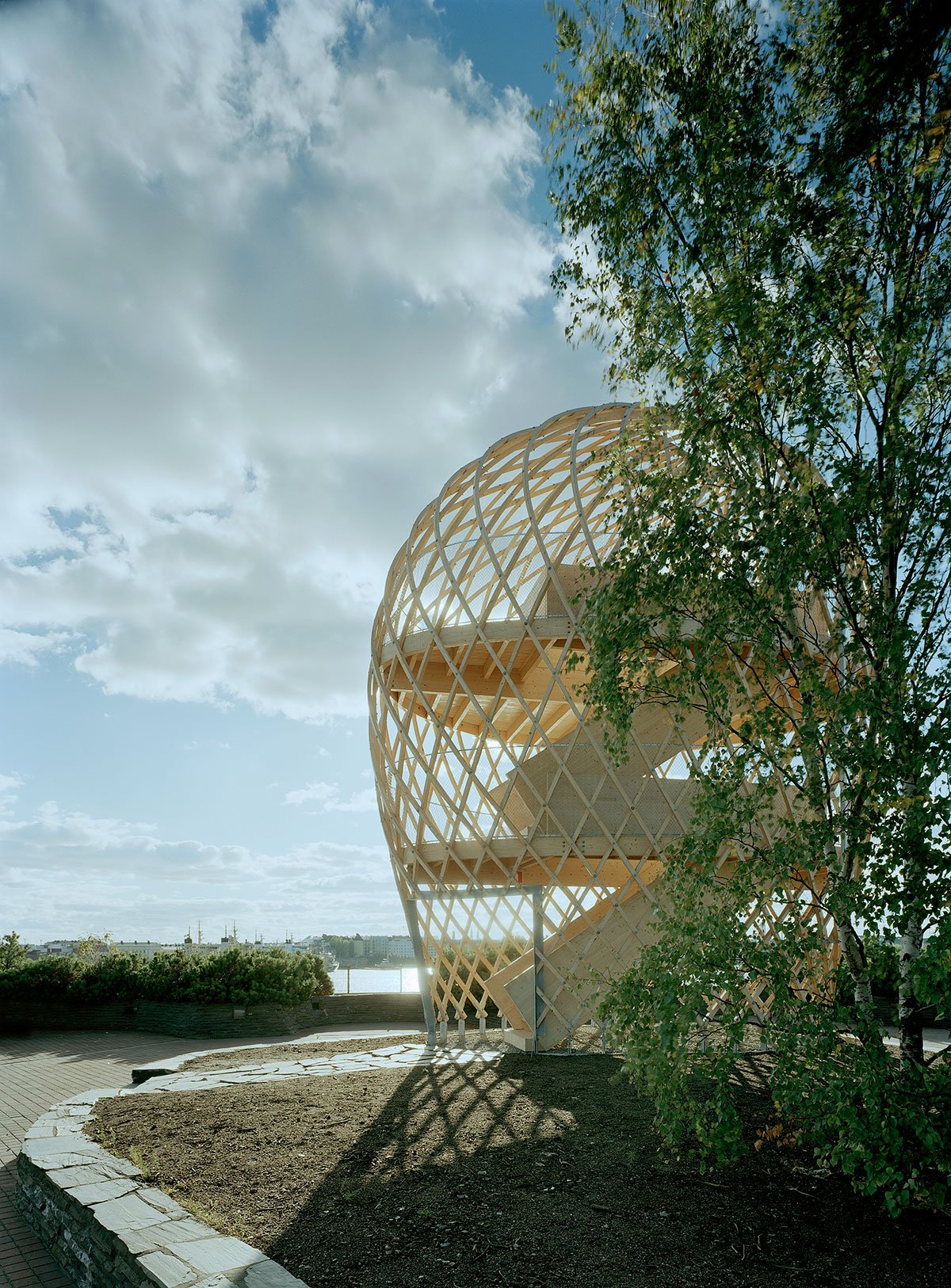 The site is eighteen metres above sea level and the tower is very visible in the Helsinki sea line. A wonderful view of the sea and the city centre opens up from the ten-metre-high two-storey tower. The structure behaves like an eggshell; even when the gridshell, which consists of over 600 joints, is punctured it withstands the load. The load bearing structure consists of 72 long battens with a section of 60 mm x 60 mm that are bent and twisted on the site from seven pre-bent types. As the tower has no structural protection against weathering, it is treated with a linen oil-based wood balm with UV-protection.