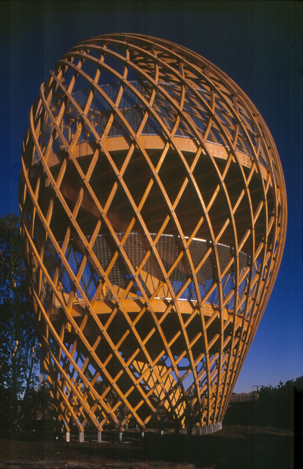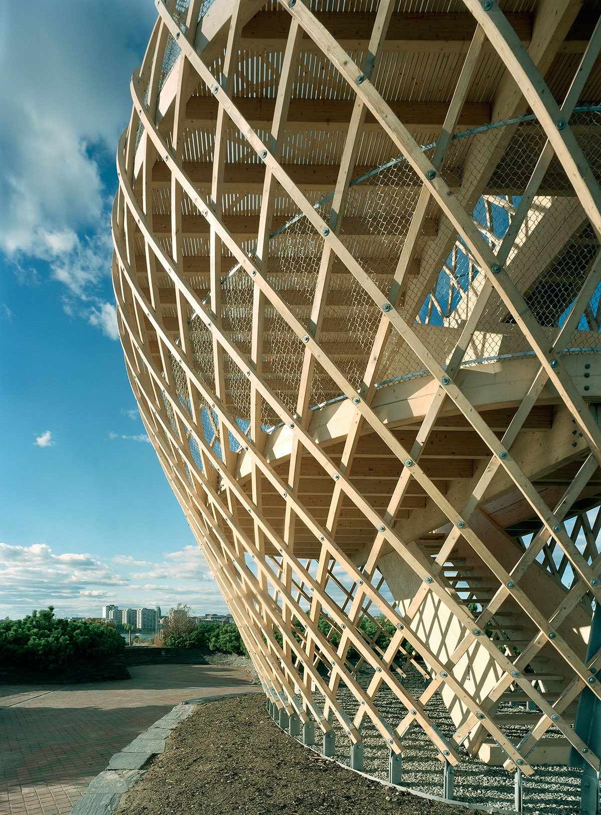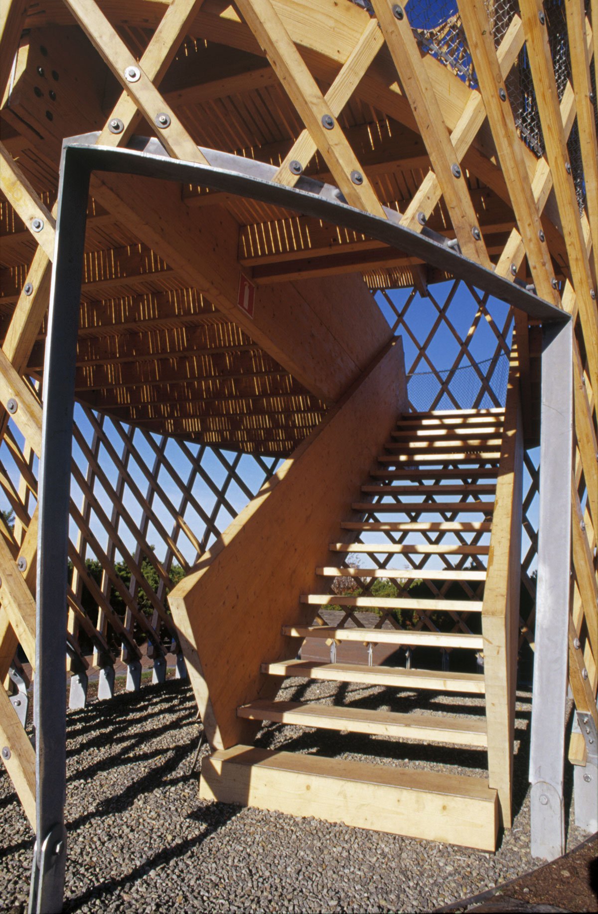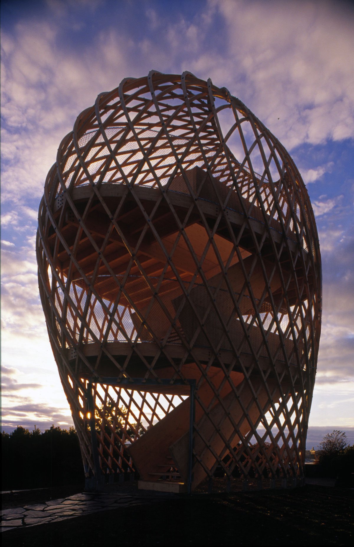 The site is eighteen metres above sea level and the tower is very visible in the Helsinki sea line. A wonderful view of the sea and the city centre opens up from the ten-metre-high two-storey tower. The structure behaves like an eggshell; even when the gridshell, which consists of over 600 joints, is punctured it withstands the load. The load bearing structure consists of 72 long battens with a section of 60 mm x 60 mm that are bent and twisted on the site from seven pre-bent types. As the tower has no structural protection against weathering, it is treated with a linen oil-based wood balm with UV-protection.