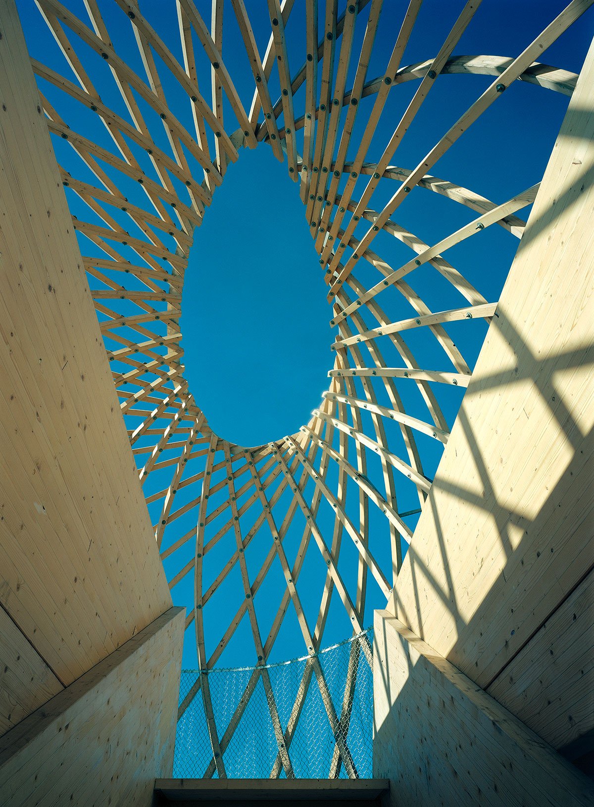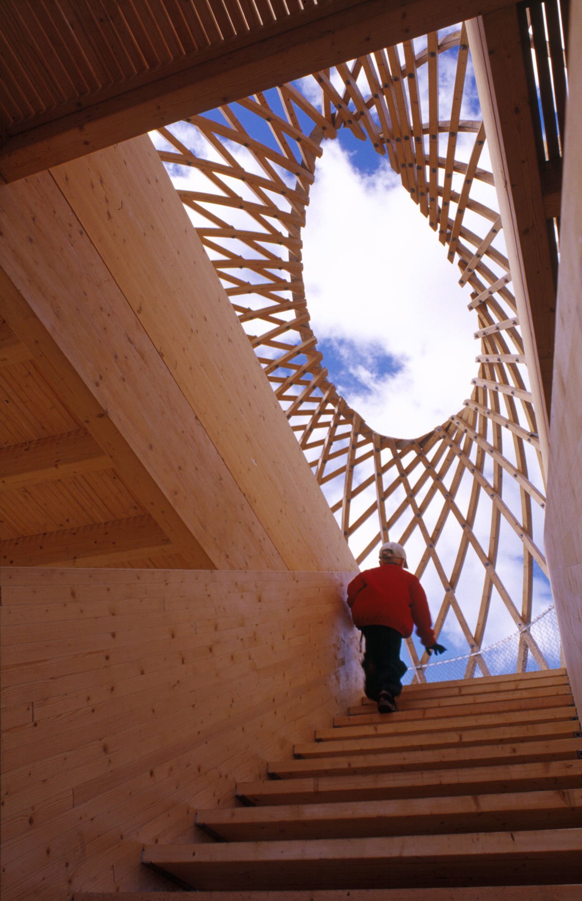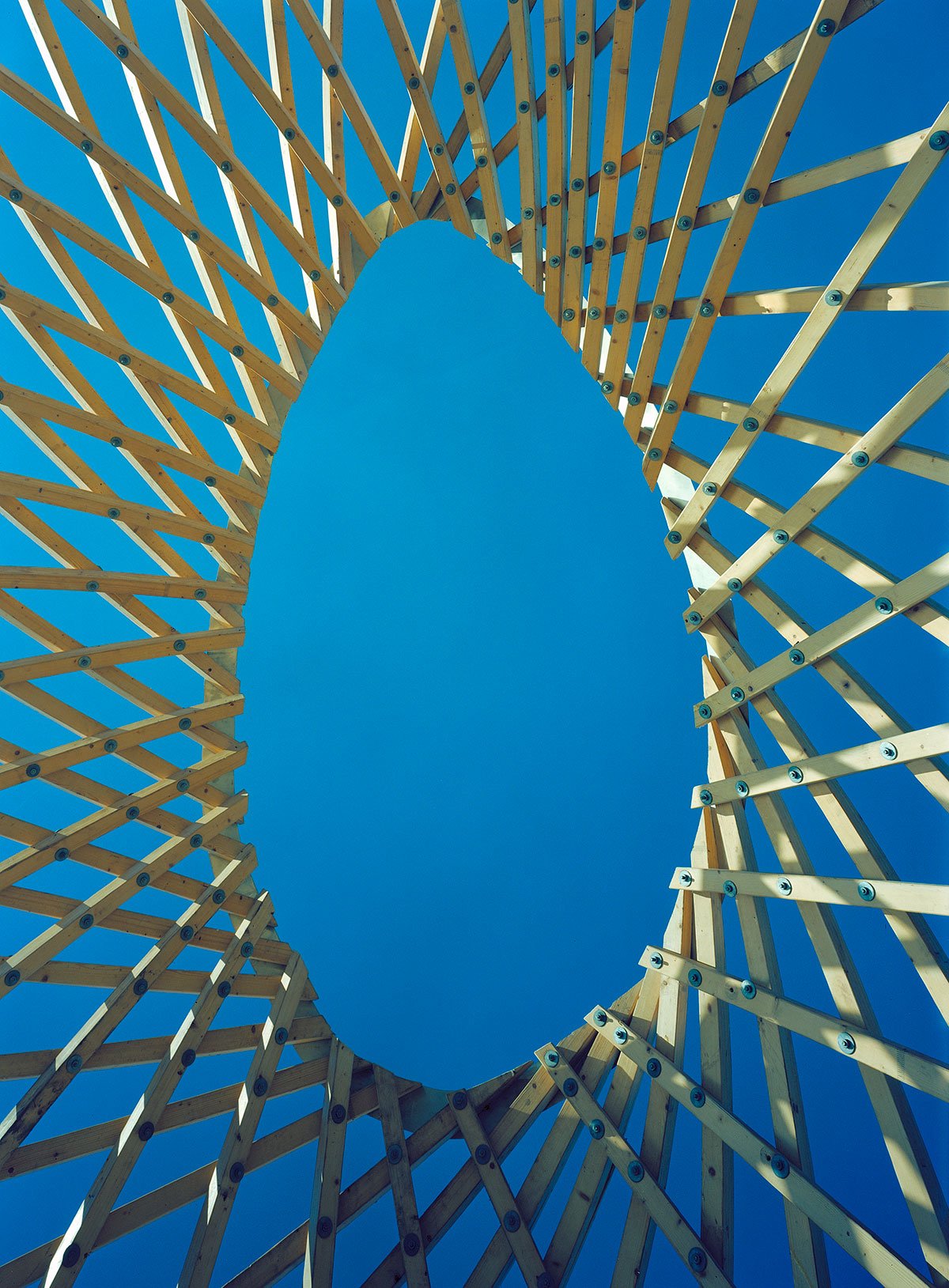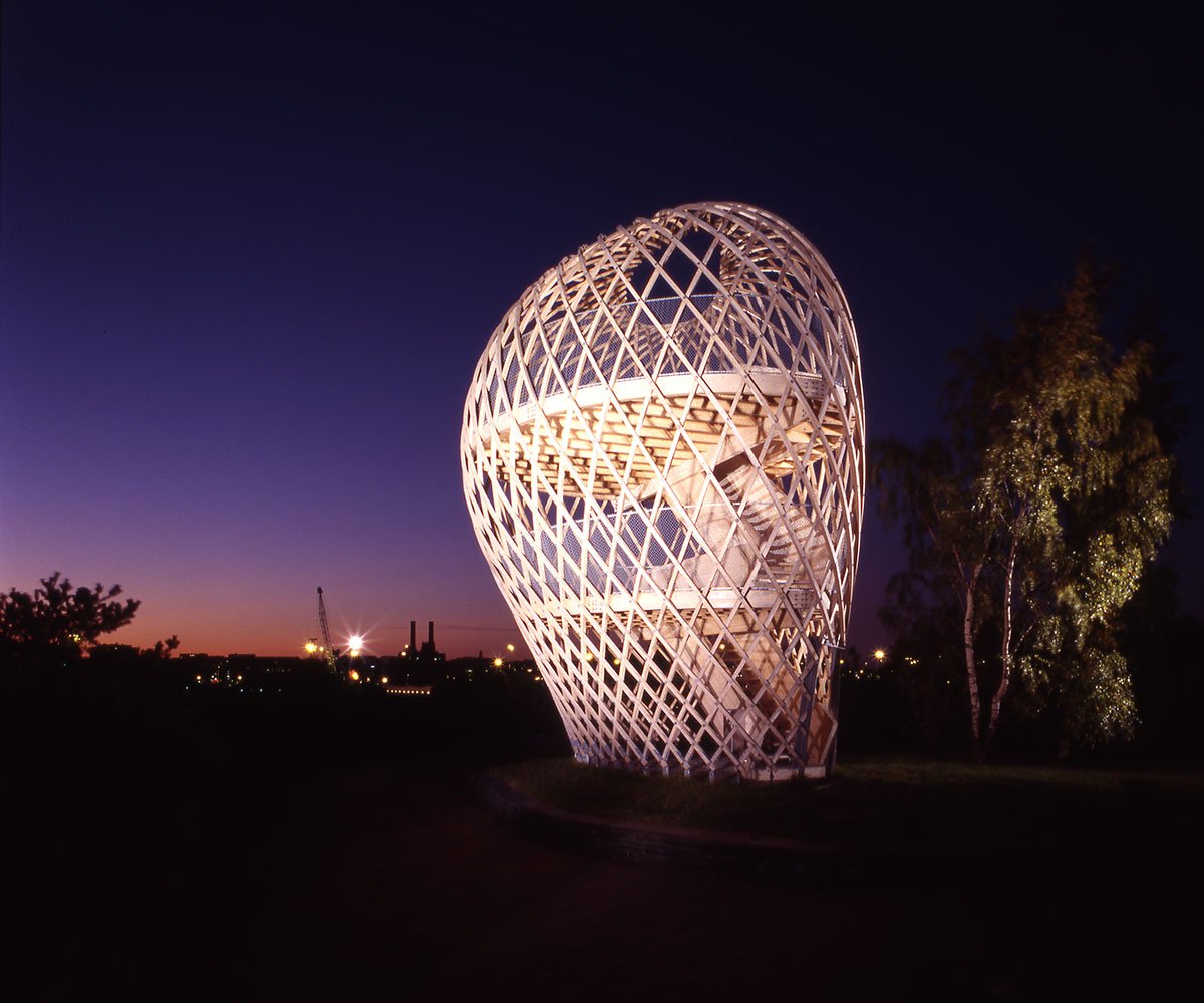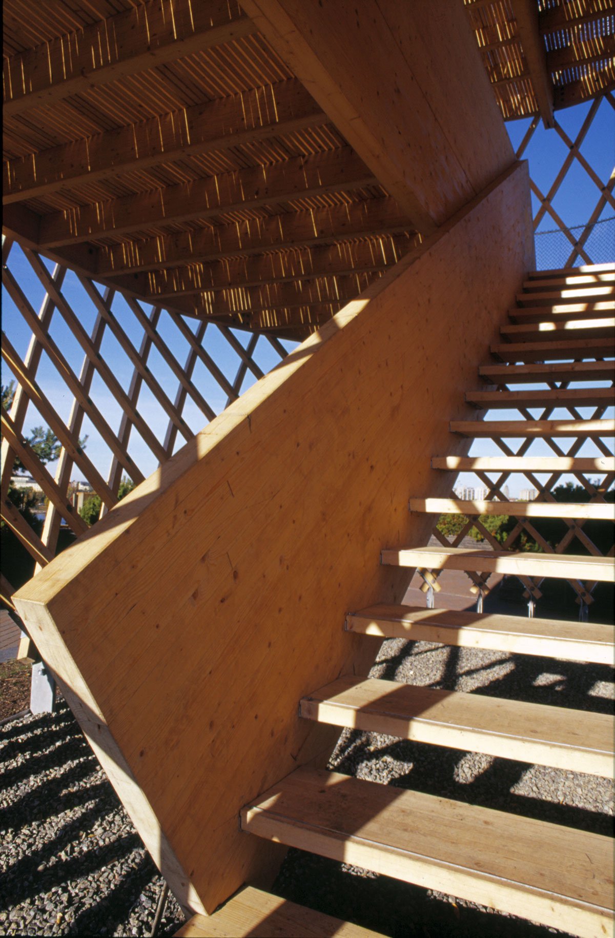 The site is eighteen metres above sea level and the tower is very visible in the Helsinki sea line. A wonderful view of the sea and the city centre opens up from the ten-metre-high two-storey tower. The structure behaves like an eggshell; even when the gridshell, which consists of over 600 joints, is punctured it withstands the load. The load bearing structure consists of 72 long battens with a section of 60 mm x 60 mm that are bent and twisted on the site from seven pre-bent types. As the tower has no structural protection against weathering, it is treated with a linen oil-based wood balm with UV-protection.