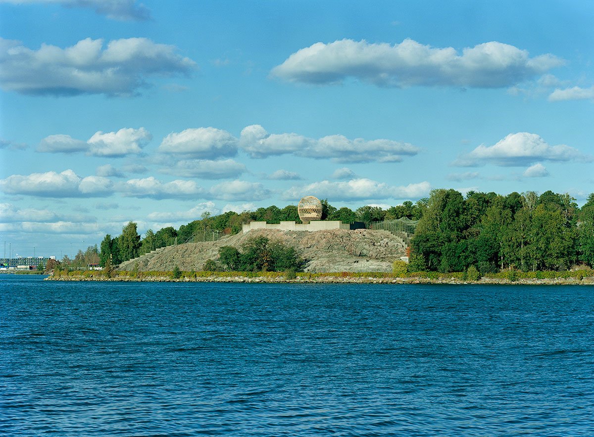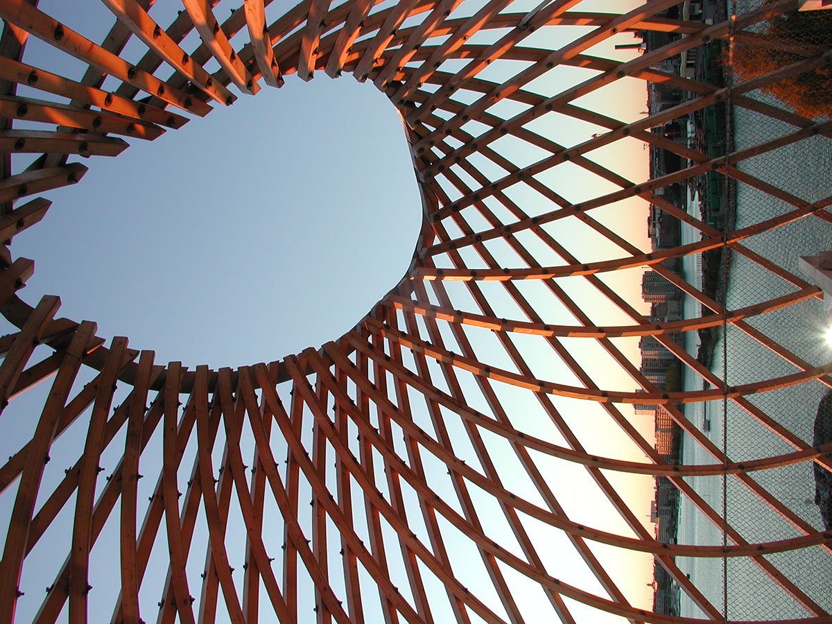 Finally in June-August 2002 the tower was erected by an international group of eight students of architecture. The hot, sunny summer dried up the timber, and the duct pipes that were used for steaming proved useful. It took them three months to complete the job; now the bubble is a delicately transparent landmark of Korkeasaari Island.