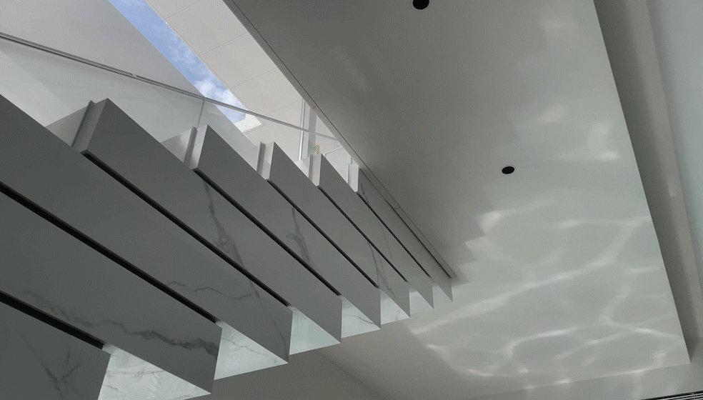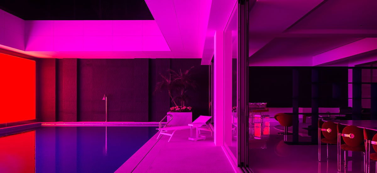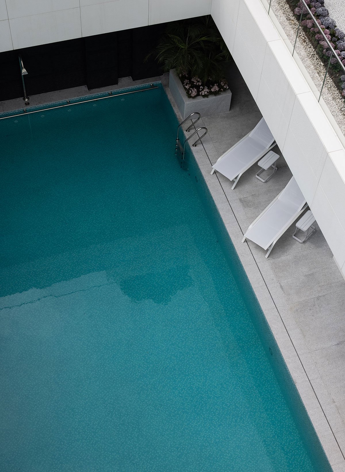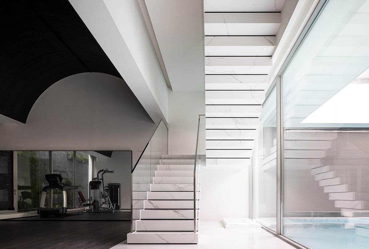 Natural flow outside: The basement of the villa should not be black, which is our attitude towards the exterior space of the building. We inserted a swimming pool with an atrium above it to bring sunlight and air from the outside to the reception space on the basement floor. The flowing water, light, and wind create a natural sense of fluidity and an open, transparent space experience.