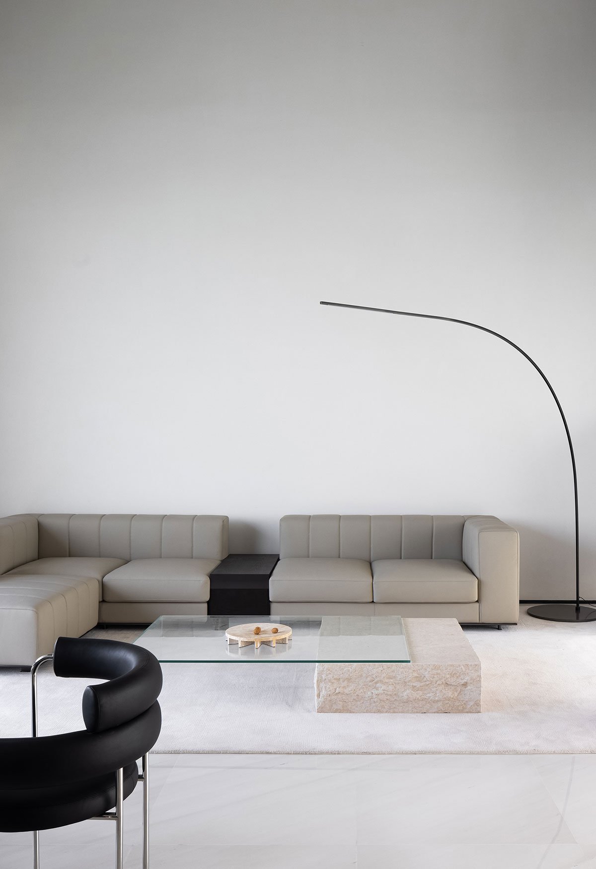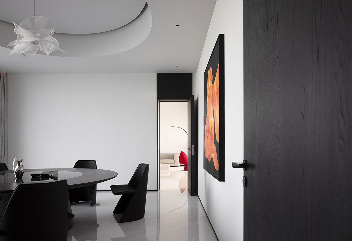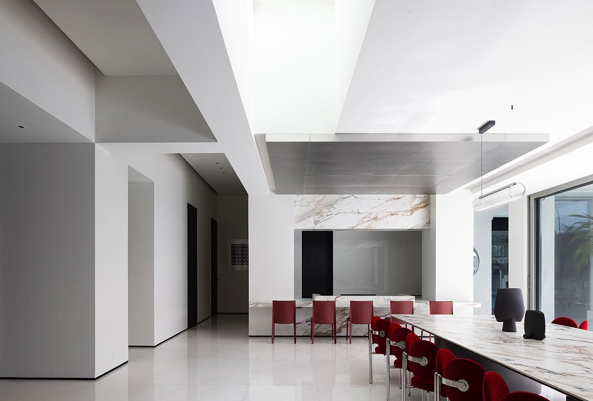 The pure white achieves a silent and pure relationship between the living and reception areas in a single architectural space.