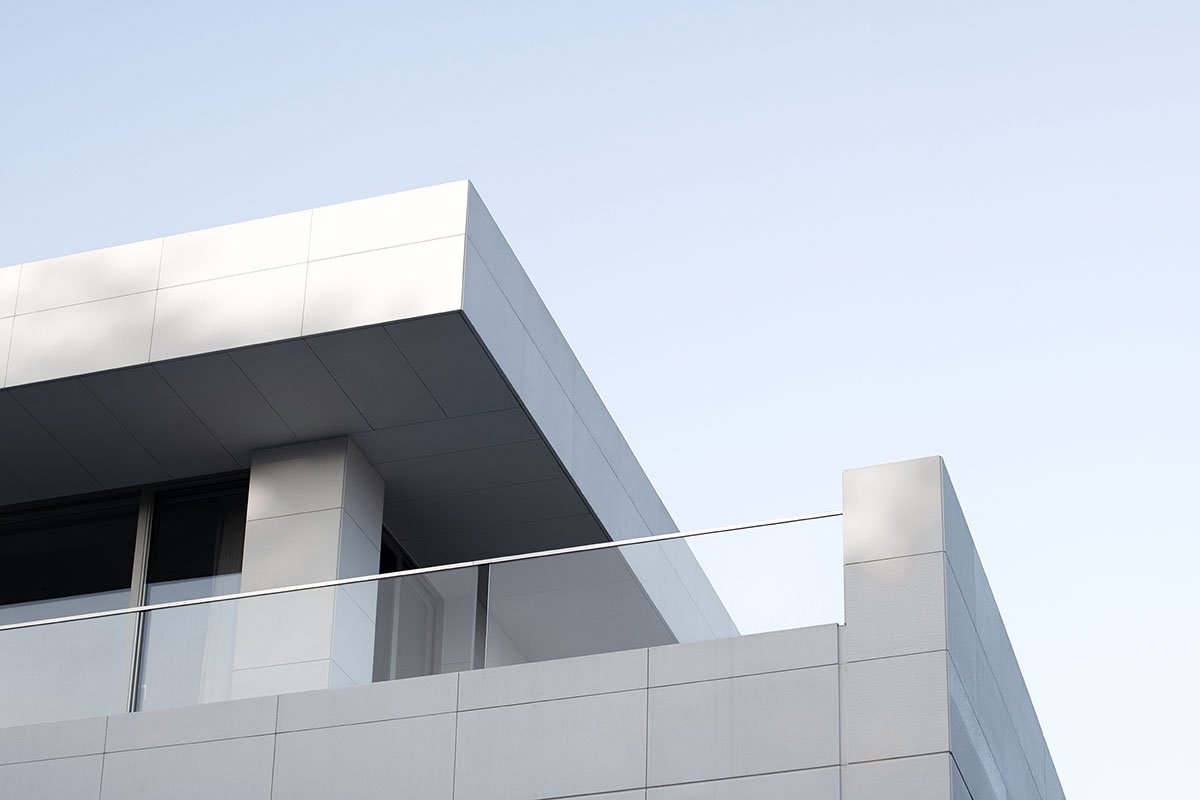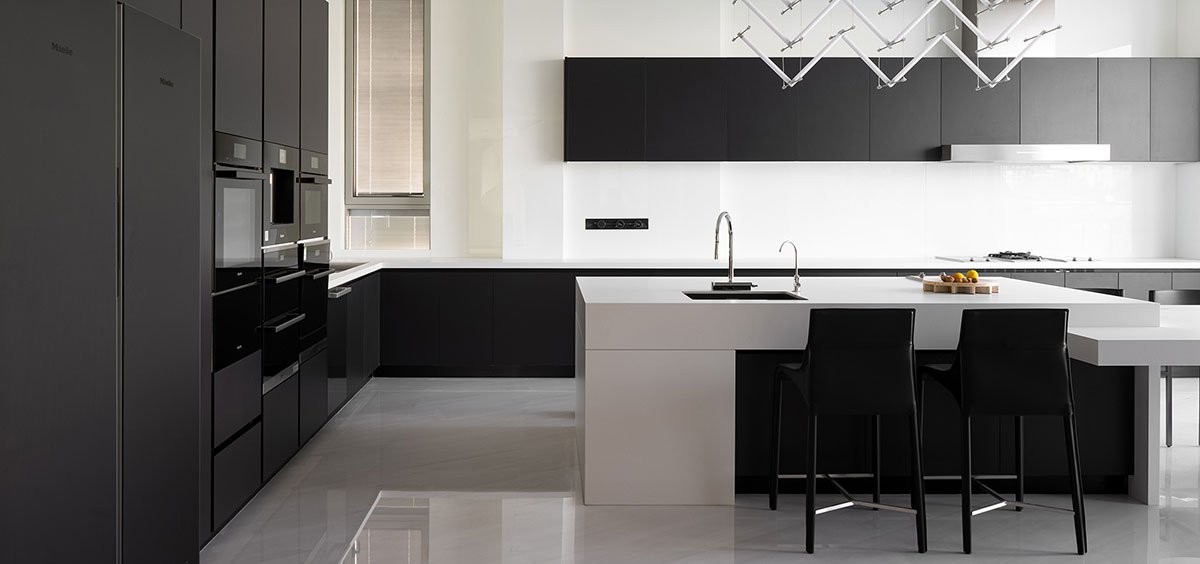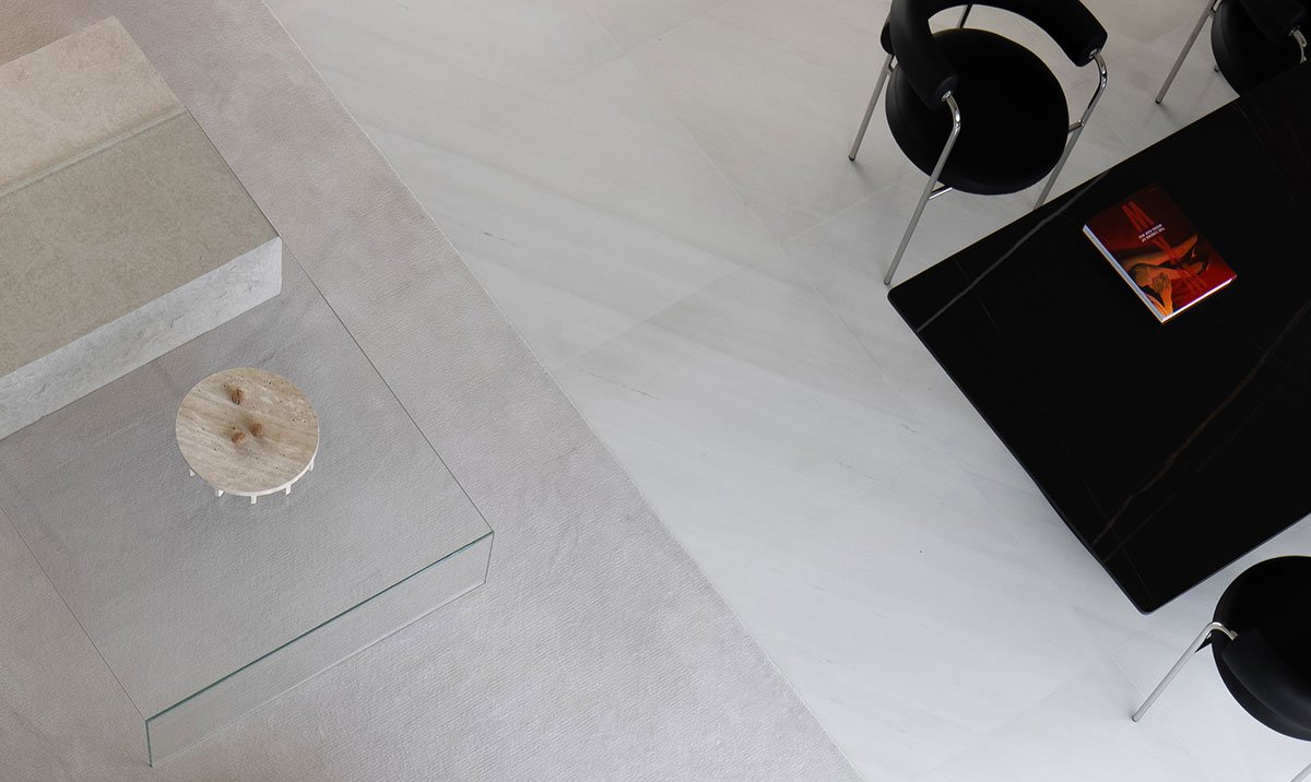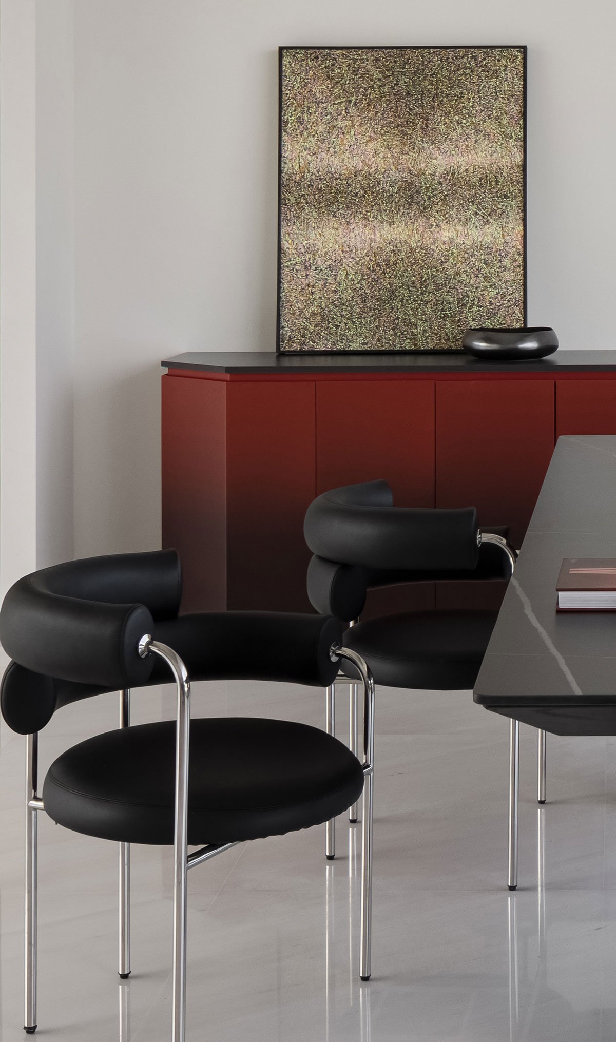 The pure white achieves a silent and pure relationship between the living and reception areas in a single architectural space.