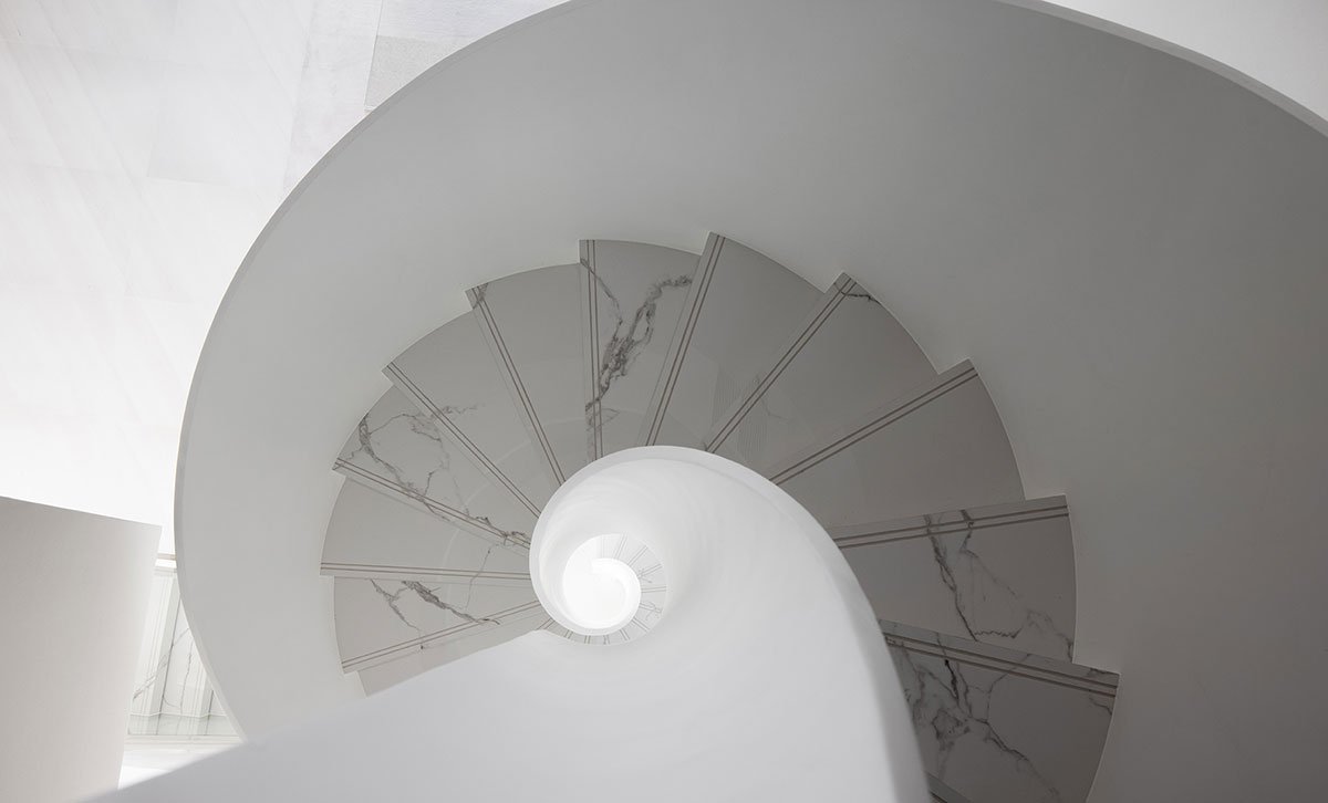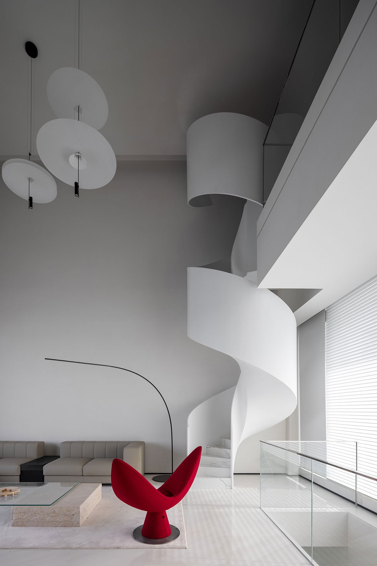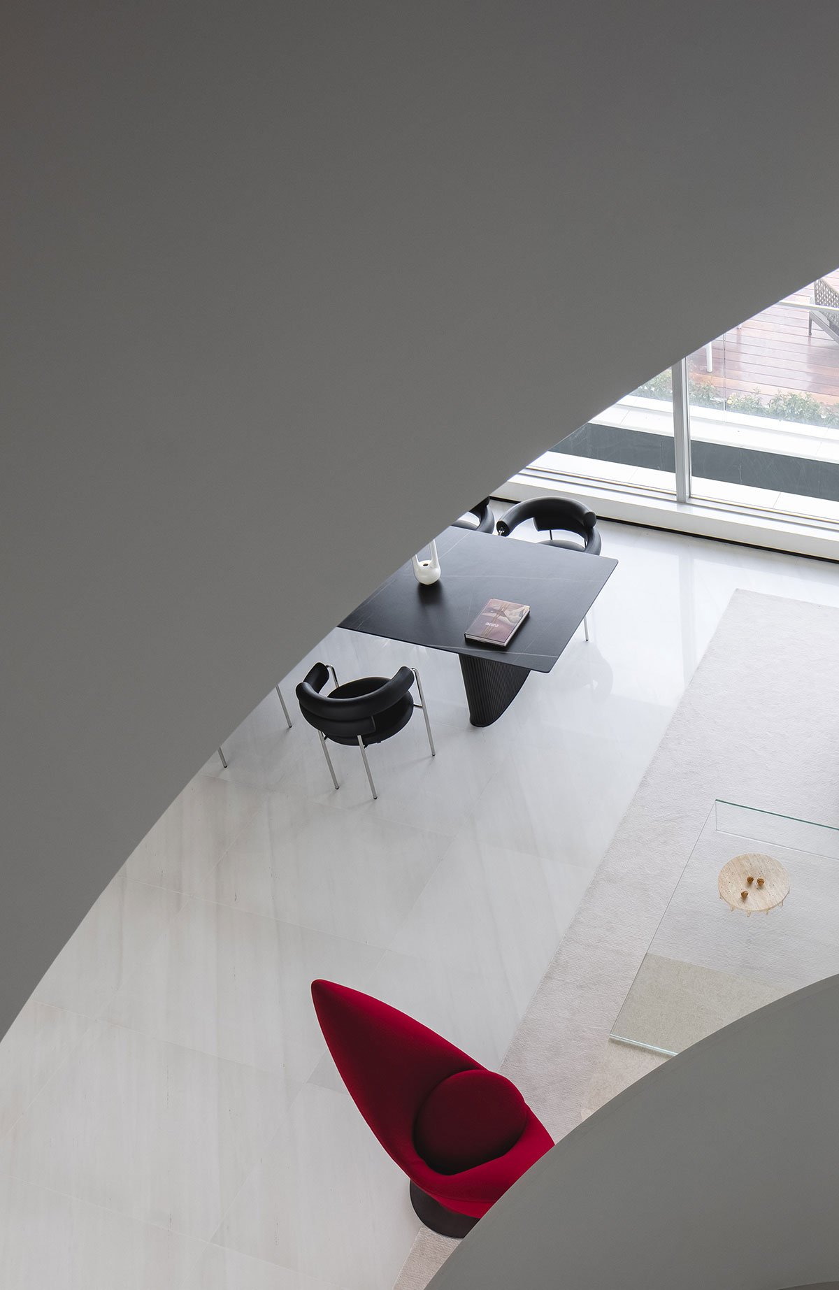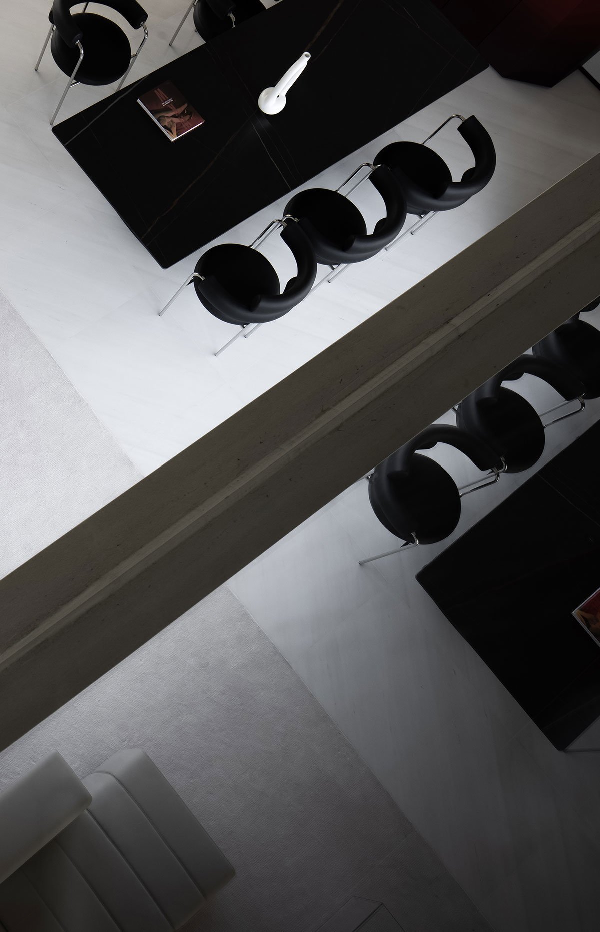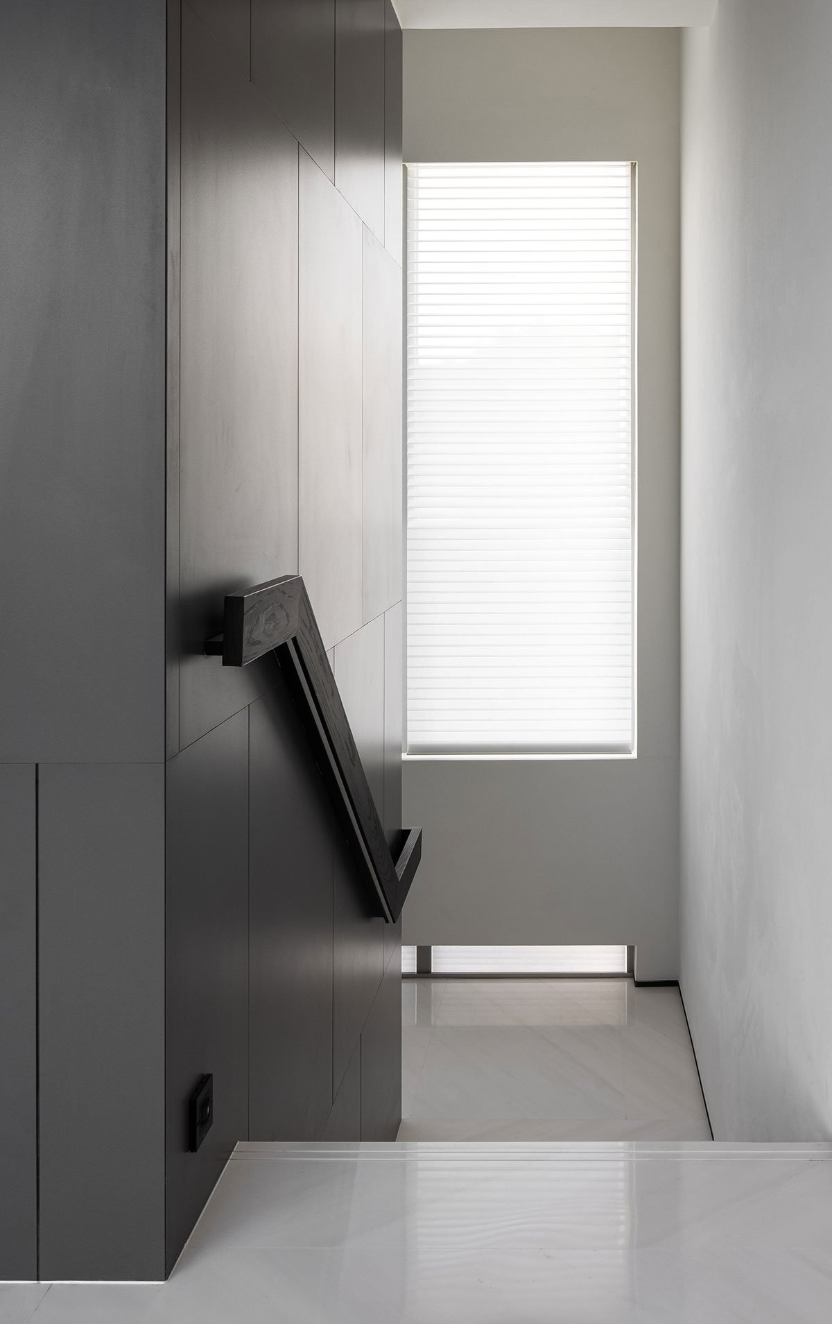Generation of function: Stairs are the circulation route that runs through the overall space, as well as the emotional transition from the open and extroverted to the private and introverted. With the living room on the ground floor as the space center, the two staircases upward connect to form the living room on the second and third floors, and the stairs downward directly link the ground floor living room to the reception space on the basement floor.