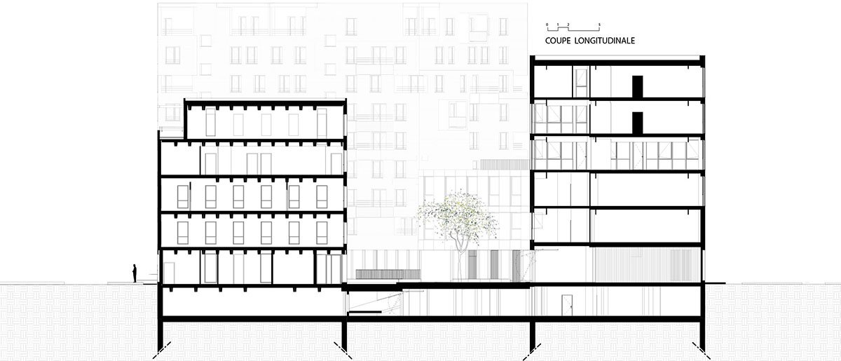 “L’Eclat” is a new office building located facing the collector road at the south corner of parcel 1.3. The main portion of the building reaches six stories, while a wing that abuts on the adjacent residential building is lowered to three stories to allow sunlight to reach the central courtyard.