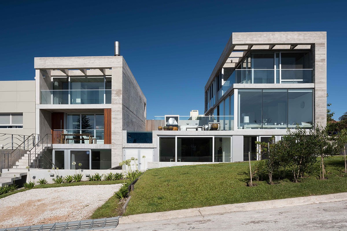 [Text as submitted by architect] This project consists of two independent houses, one for the owners to use, and the other for renting out. Both exposed reinforced concrete structures, cast with brushed pine board shutters, articulate a courtyard with barbecue and swimming pool for the exclusive use by the owners of the house. The rental home has a swimming pool on the terrace with a seating area and a great view.
