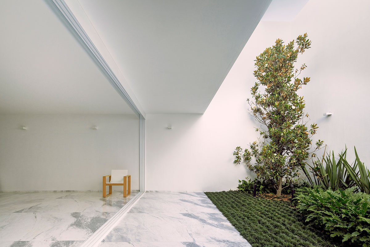 In the central patio, a large ficus pandurata tree is planted, which grows filling the void whose crown extends and emerges in the living room-kitchen area, providing a piece of exterior nature to the interior of the house.