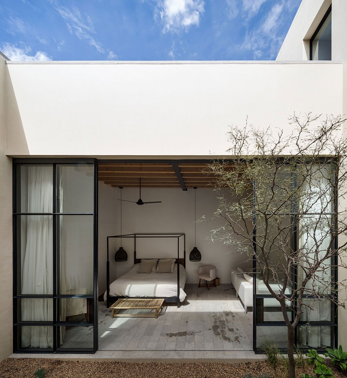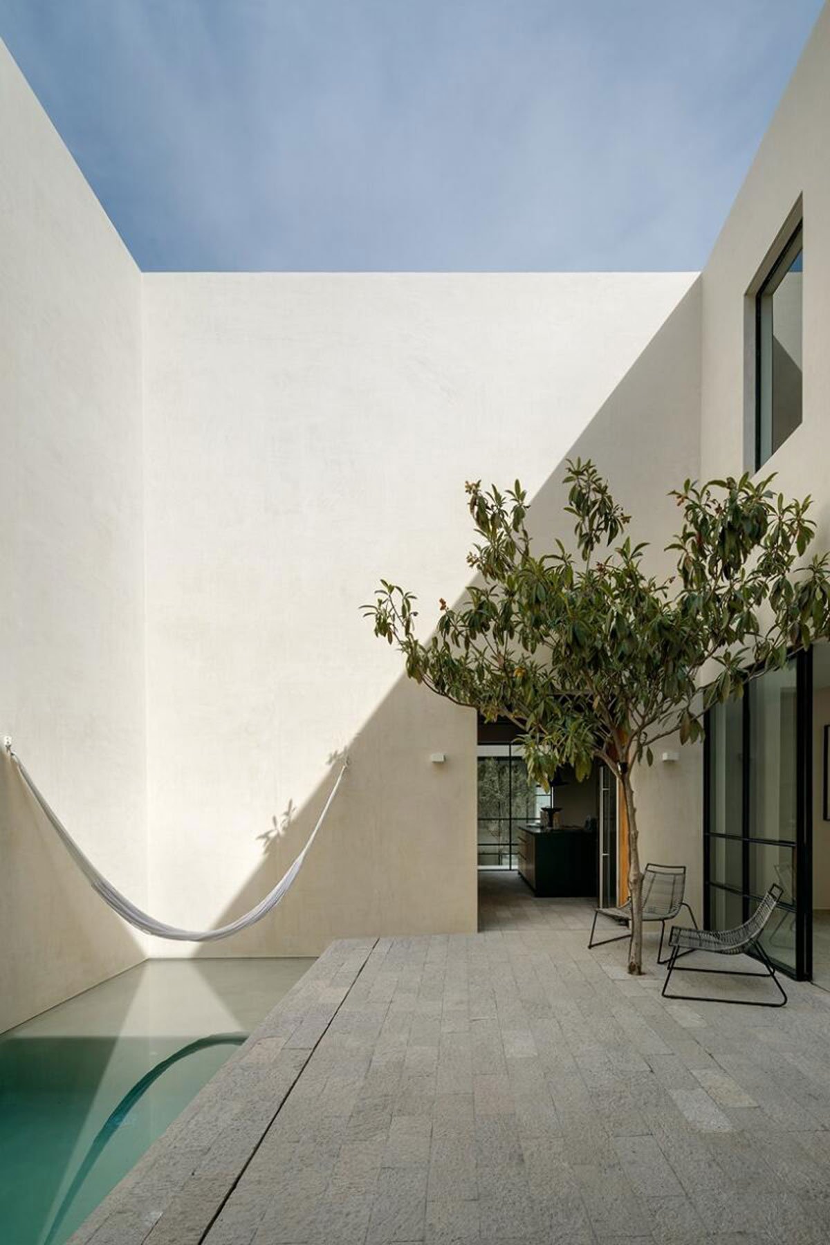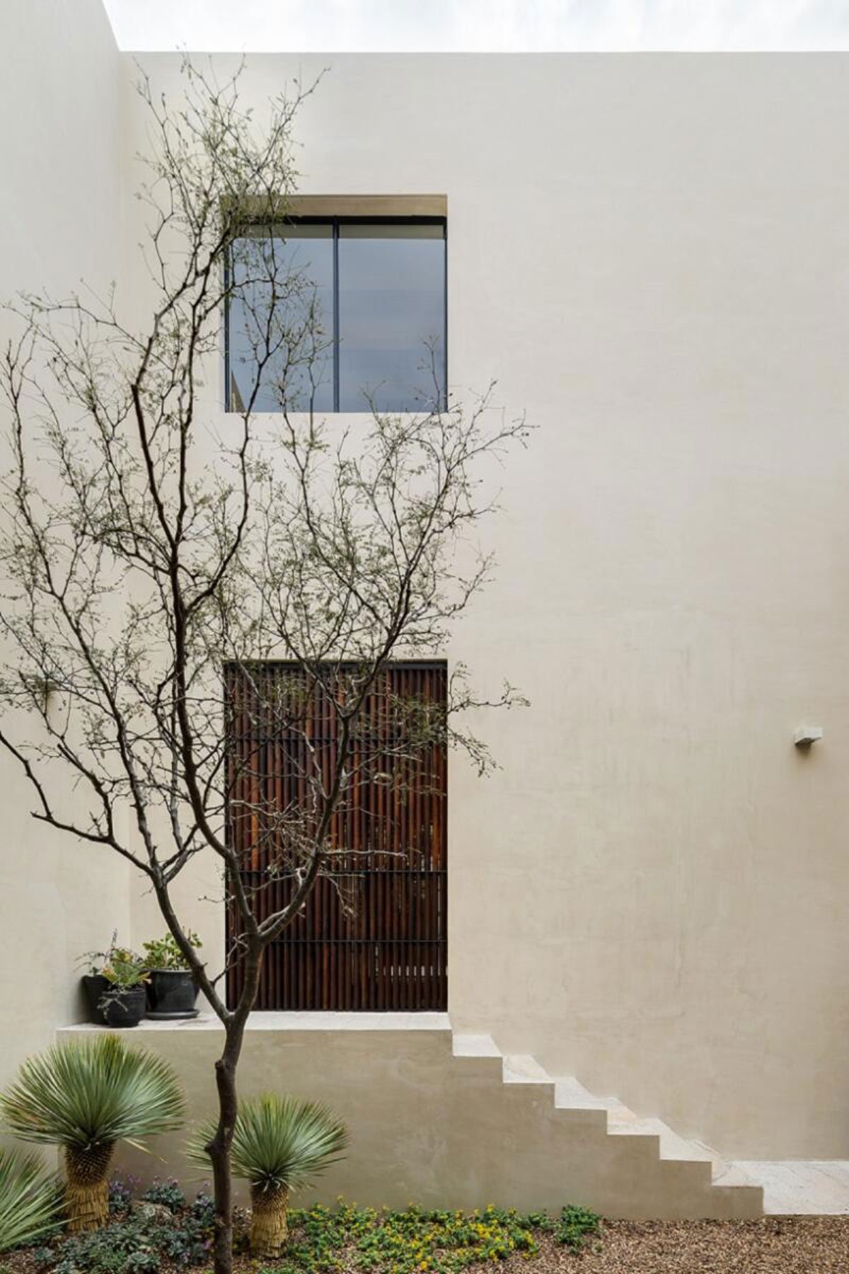 Excerpt: LA QUINTA, designed by PPAA Pérez Palacios Arquitectos Asociados, is a weekend house that respects the place’s identity, built context, and height of the neighboring pre-existent walls. These existing walls played an important role and set the limits that would define the space contained in the house. Three voids were proposed in the form of patios for a plan that works all the restrictions inwards and has no views of the landscape.