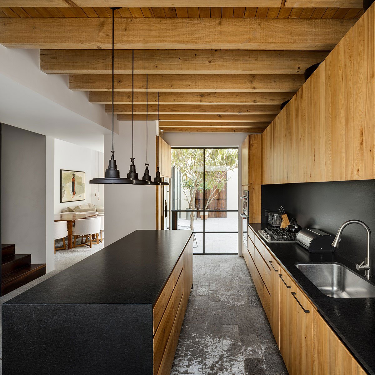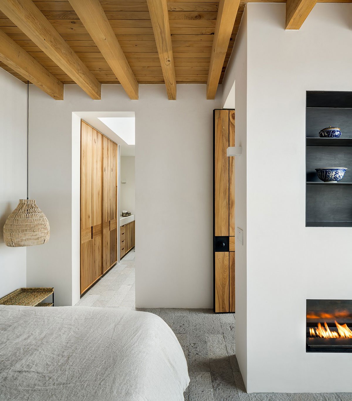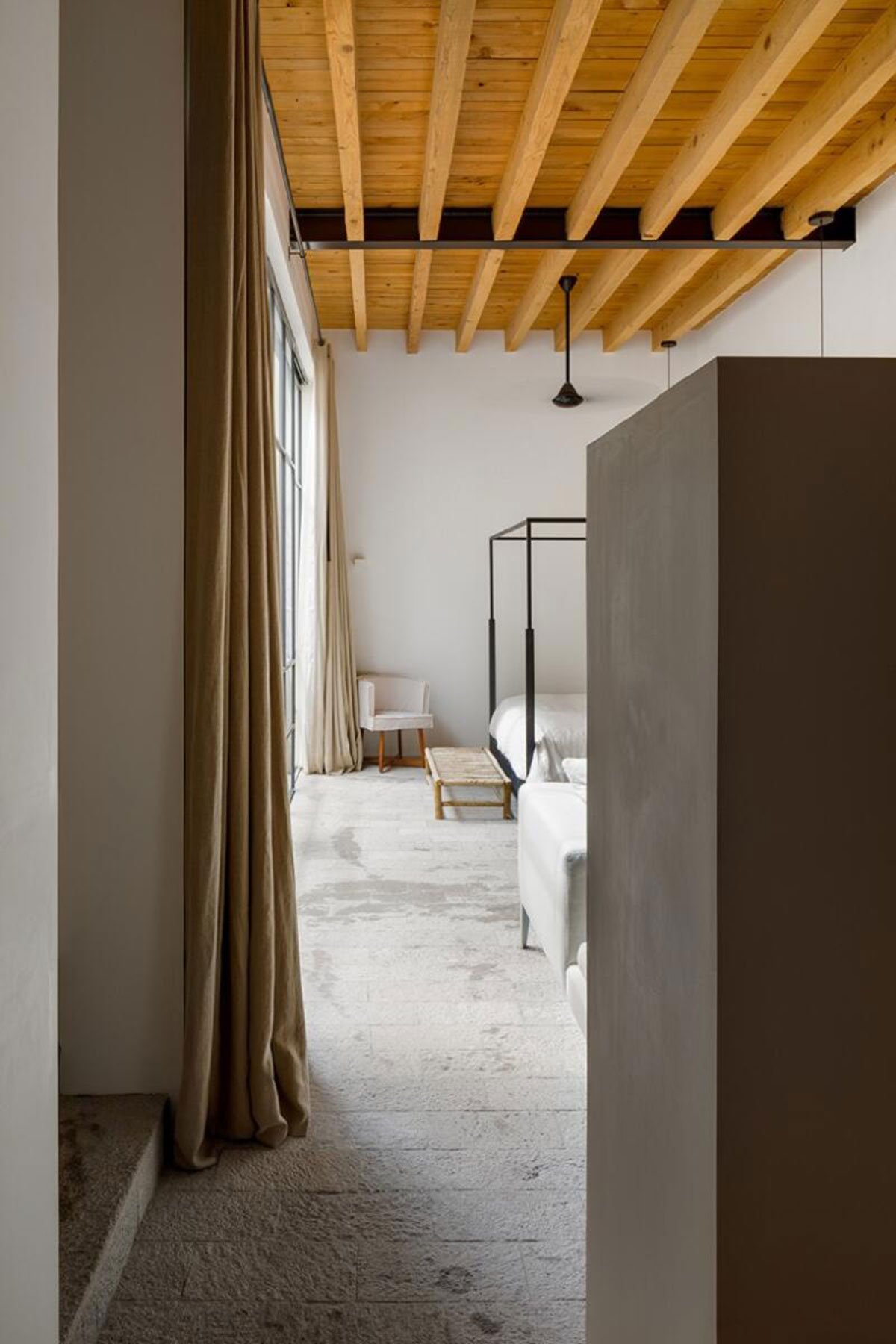 Excerpt: LA QUINTA, designed by PPAA Pérez Palacios Arquitectos Asociados, is a weekend house that respects the place’s identity, built context, and height of the neighboring pre-existent walls. These existing walls played an important role and set the limits that would define the space contained in the house. Three voids were proposed in the form of patios for a plan that works all the restrictions inwards and has no views of the landscape.