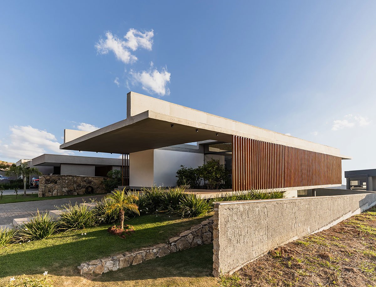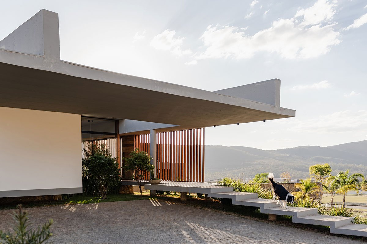 The land, which is located in a condominium in Nova Lima/MG, does not have any large vegetation and has a spectacular view of a lake, the mountains and the sunset. In this situation, the biggest challenge was to create mechanisms not only to enhance and explore the view, but to also promote the necessary protection from direct sunlight on openings facing West.