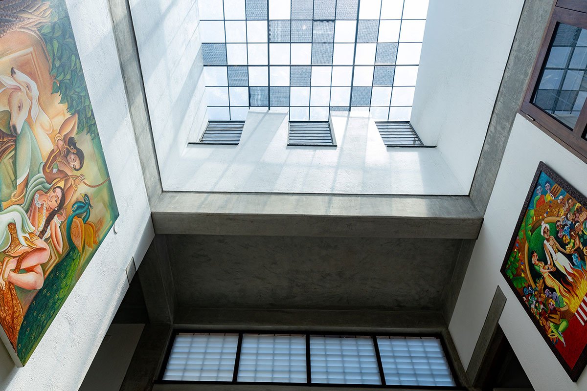 The terrace area has the central courtyard’s raised openings. The rest of the terrace is finished with cool roof tiles and will be used as a classroom for art students in the future.