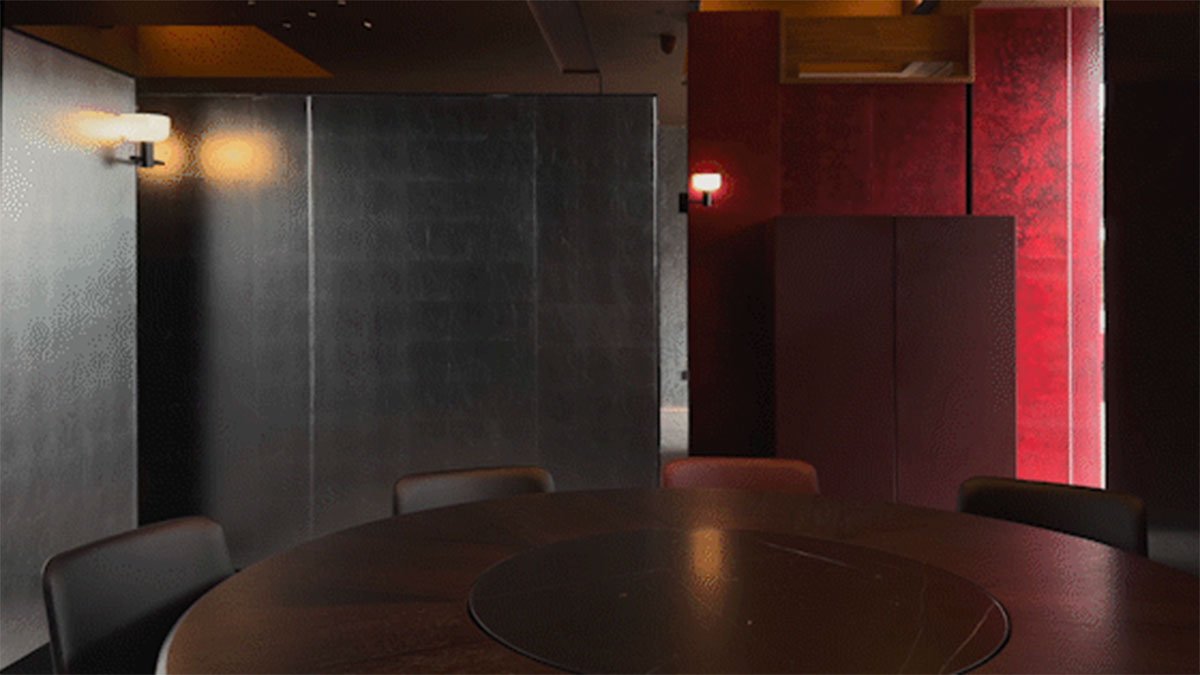 The overall space is highlighted by screen partitions clad in gold and silver foil, which give the space a traditional luxury aesthetic as well as a simplistic yet exquisite touch. Each scene in the space is based on meticulous consideration of the combination of points, lines and planes. Appearing like a maze, the space breaks the conventional layout and settings. Elegant red cabinets, pottery pots and pretty wall lamps reveal classical aesthetics, romance, elegance and warmth.