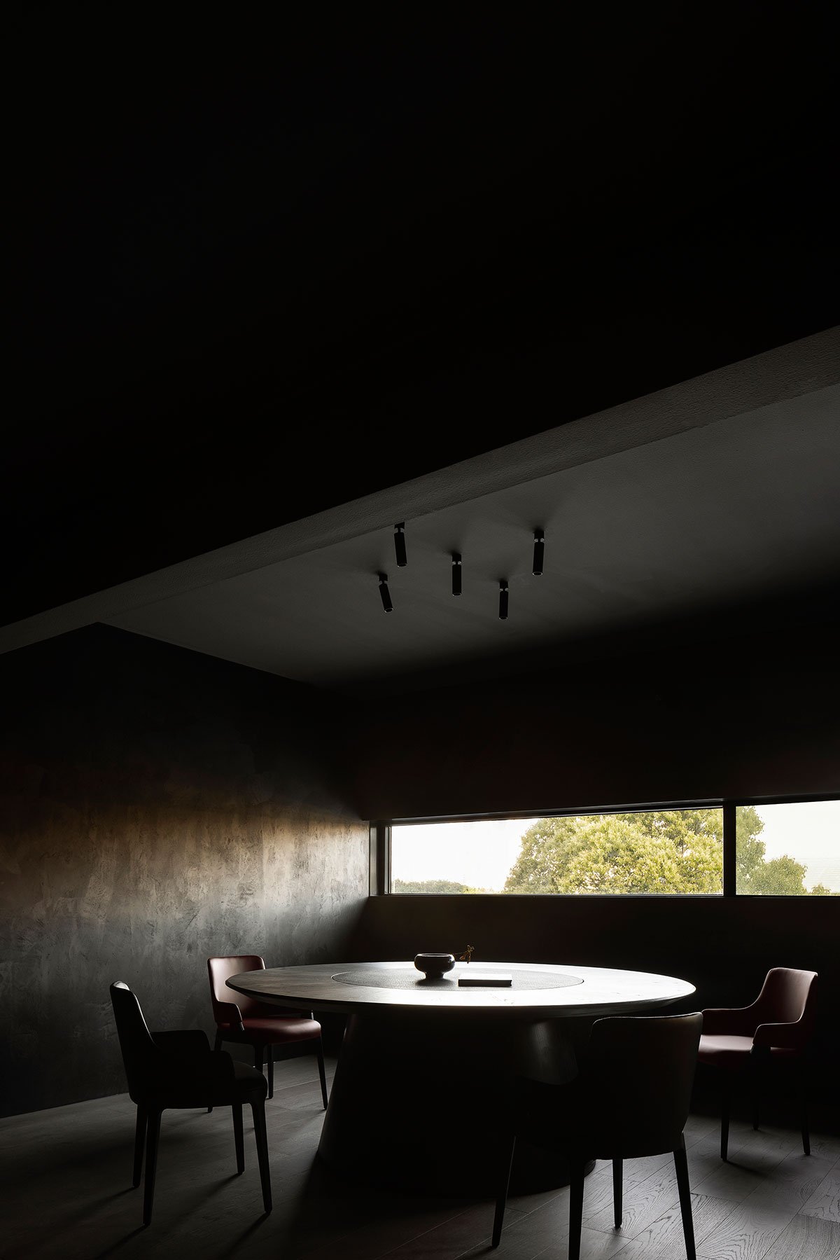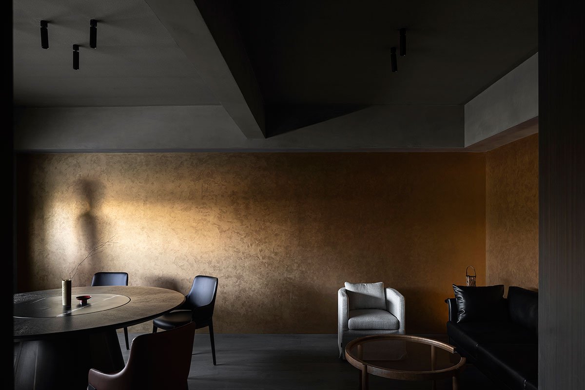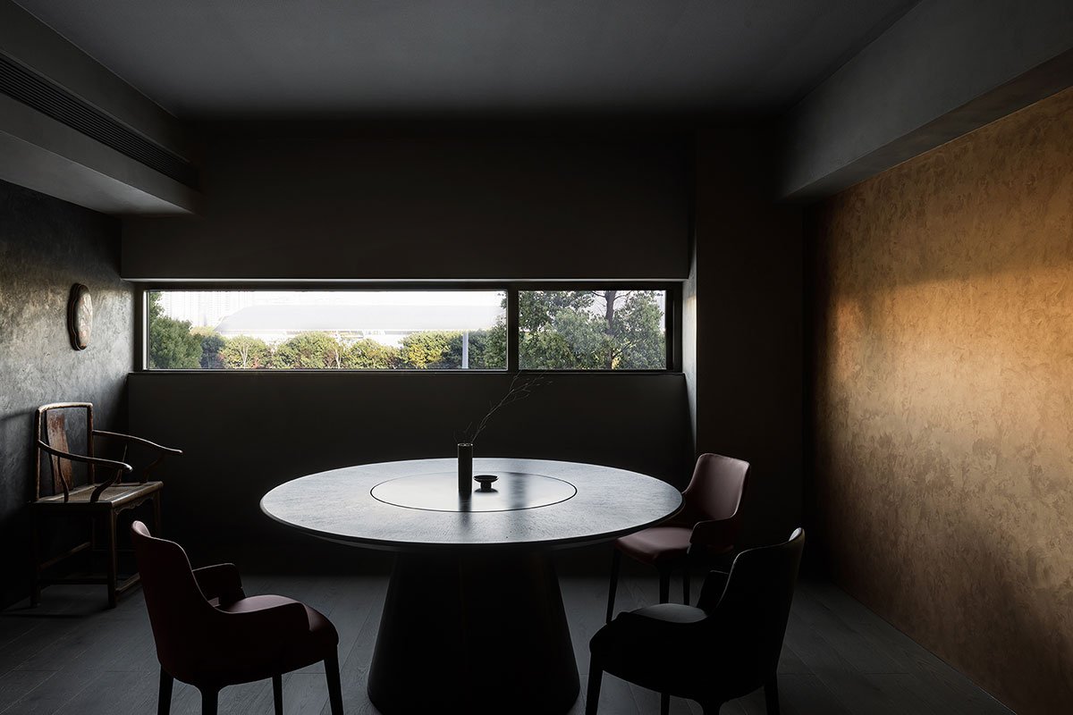 The design team created a landscape scene beside the window, which recalls traditional Chinese gardens and echoes with the natural scenery outdoors. In addition, retro furniture pieces and modern textures are combined, which produces an Oriental Zen atmosphere.