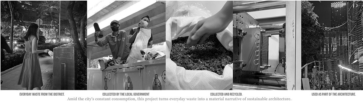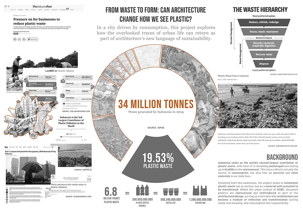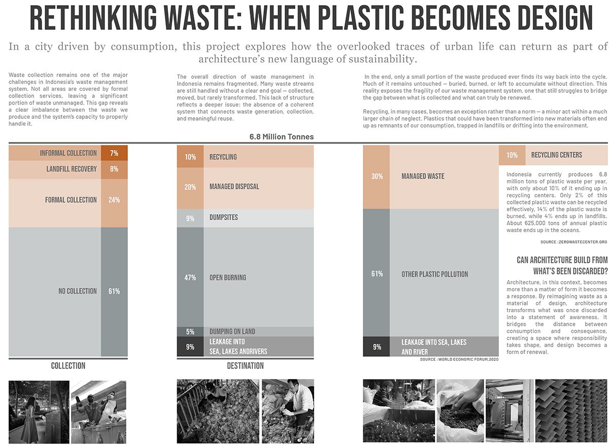 Sourced from 4,800 kg of SCBD’s (Business Districts Area) weekly plastic output, this project generates 16,800 units of functional architectural Lattice Plates. By integrating this recycled material system into a prominent site of Jakarta, the structure stands as a testament to waste management issues, reminding the public and policymakers of the 7 million tons of plastic untreated annually in Indonesia.