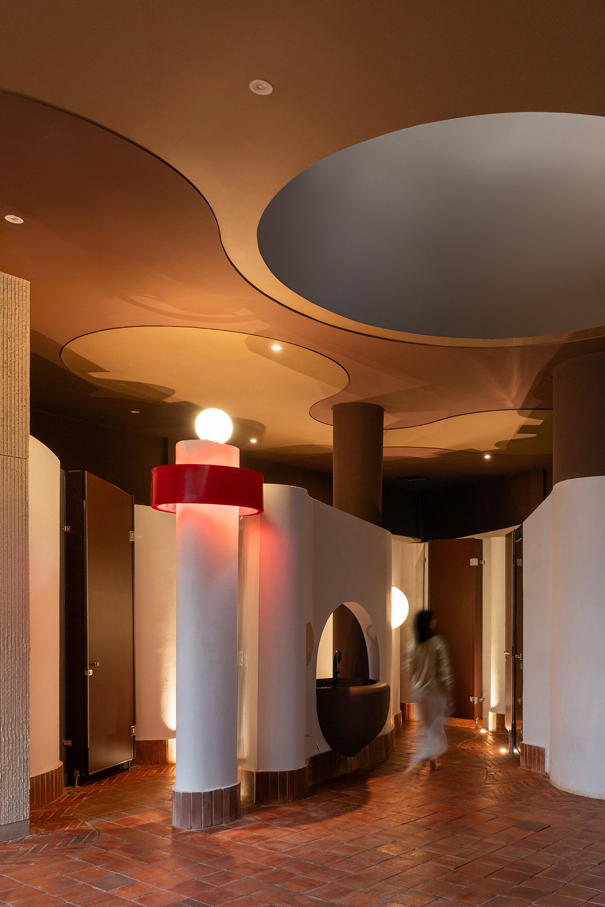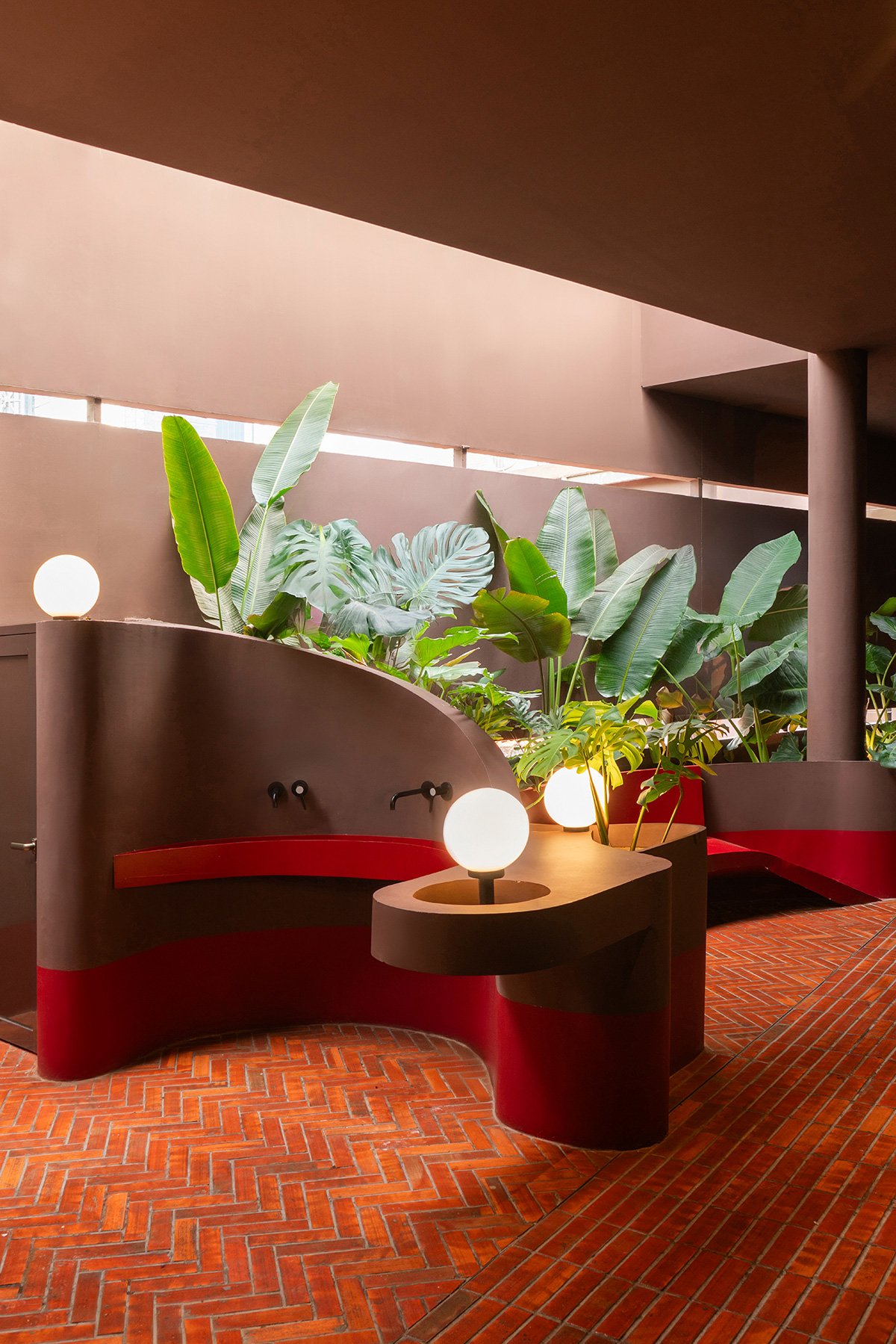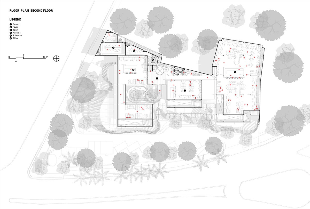 In a move to coexist with the site’s ecology, the design maintains a minimal 40% ground cover, choreographing saleable areas and activity spaces to interweave with the existing 20-meter tall trees. Rather than treating landscape as a supplement to architecture, the process was reverse-engineered: the massing was generated around the preserved tree zones.