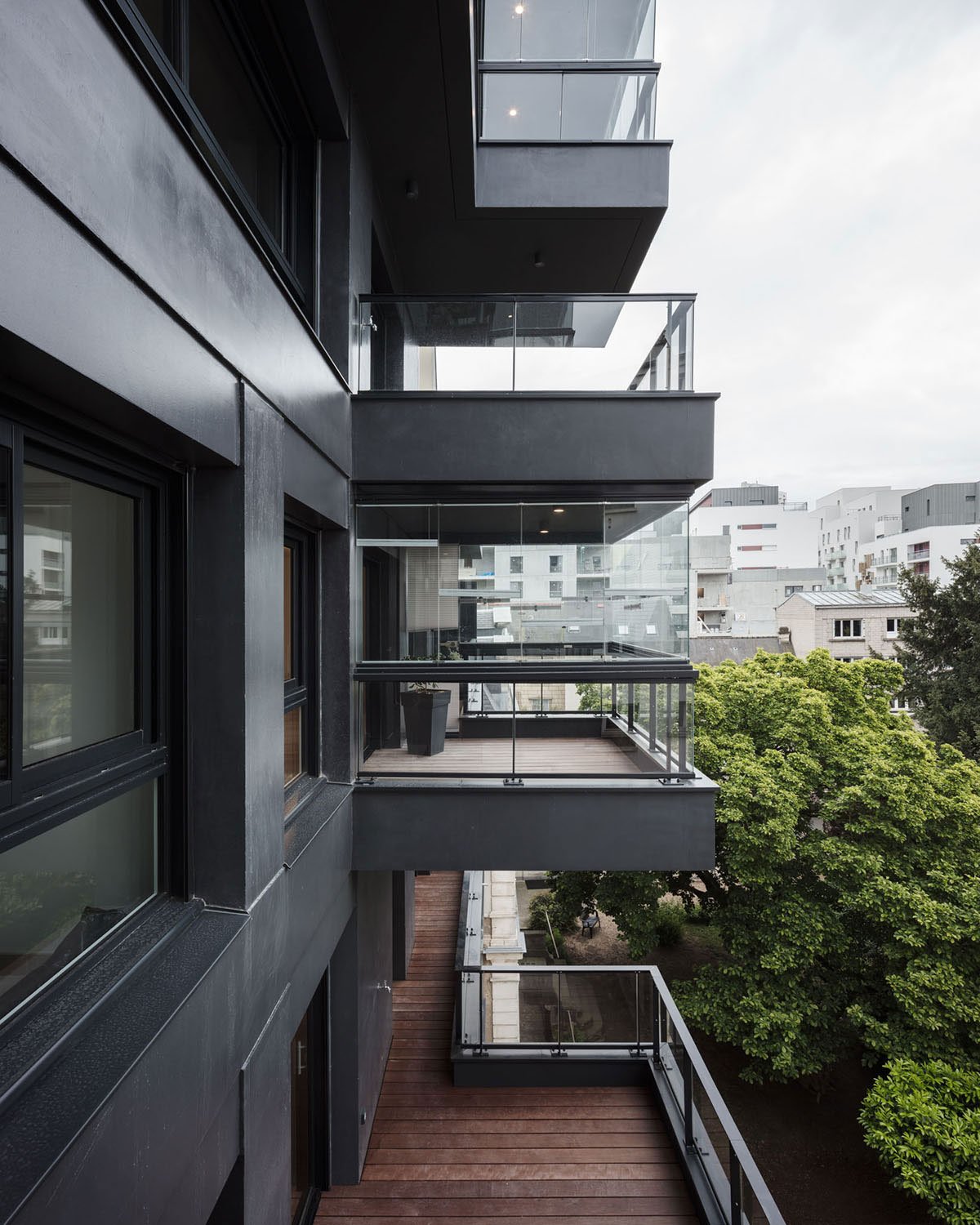 From the Place de Bretagne, the rear façade of the building presents another approach, hiding the morphological obviousness in the movement of the elements, which move asymmetrically in the robust and dark volume softened by the presence of large openings and light glass railings.