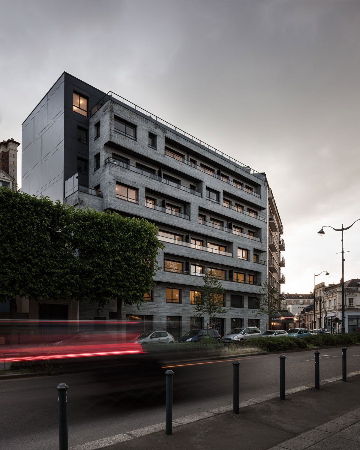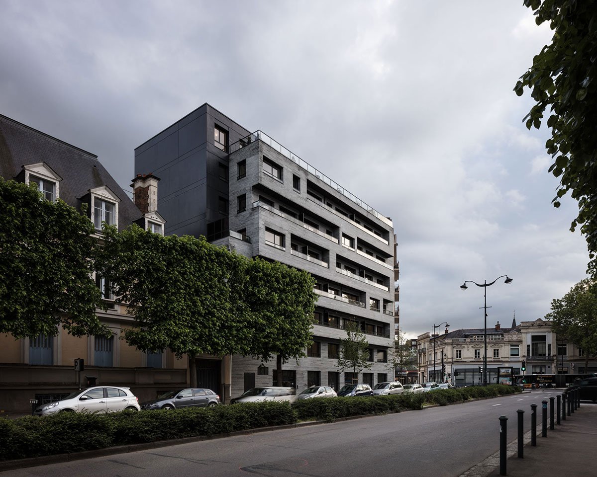 [Text as submitted by architect] The design of “Le One” is conceptually a project that tries to be sensitive and respectful through sober and refined lines, standing out – in addition to its exceptional location in the historic center of the city of Rennes – for the discreetly imposing way in which it is inserted between his neighbors. A timeless architecture where the main façade has its own identity and that in a subtle way creates a sophisticated composition of the construction elements with the use of opaque, raw, hermetic and durable materials such as exposed concrete and glass.