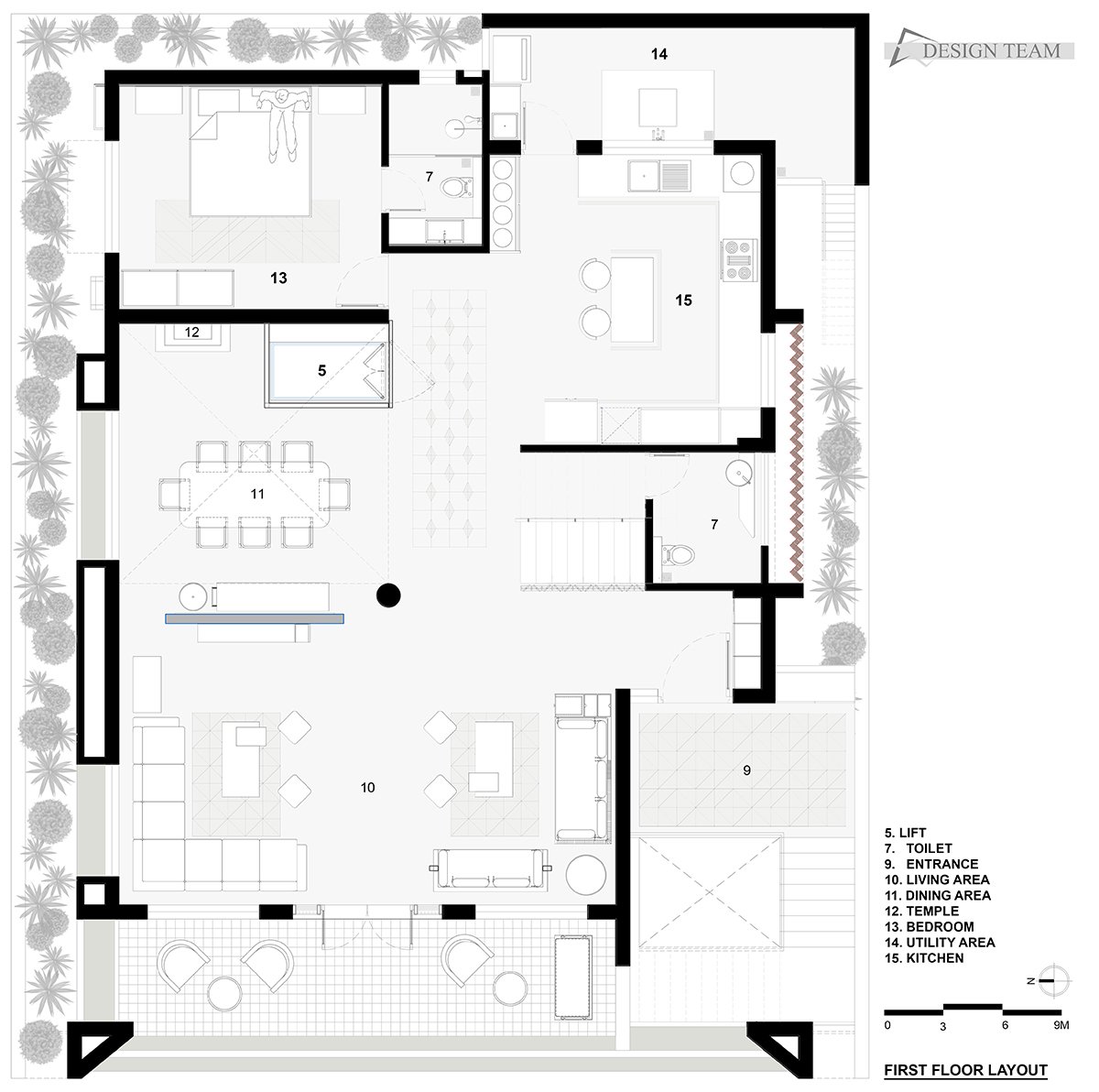 The spatial arrangement is a play of volumes with smooth overlap of private and public spaces. The almost square plot is divided by central volumes; the double heighted dining space & the open staircase well. On one side of this volume is a formal & informal living area and another has kitchen & parents’ bedroom space. The upper floors are reserved for bedroom spaces.