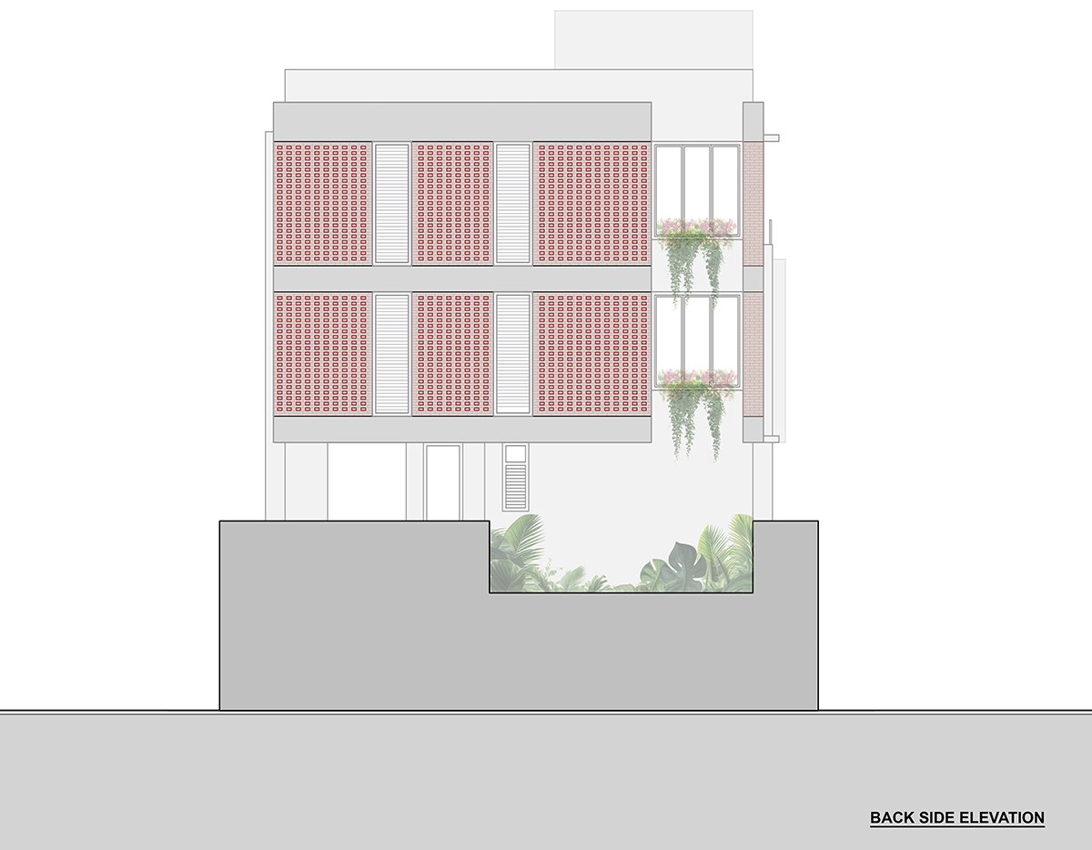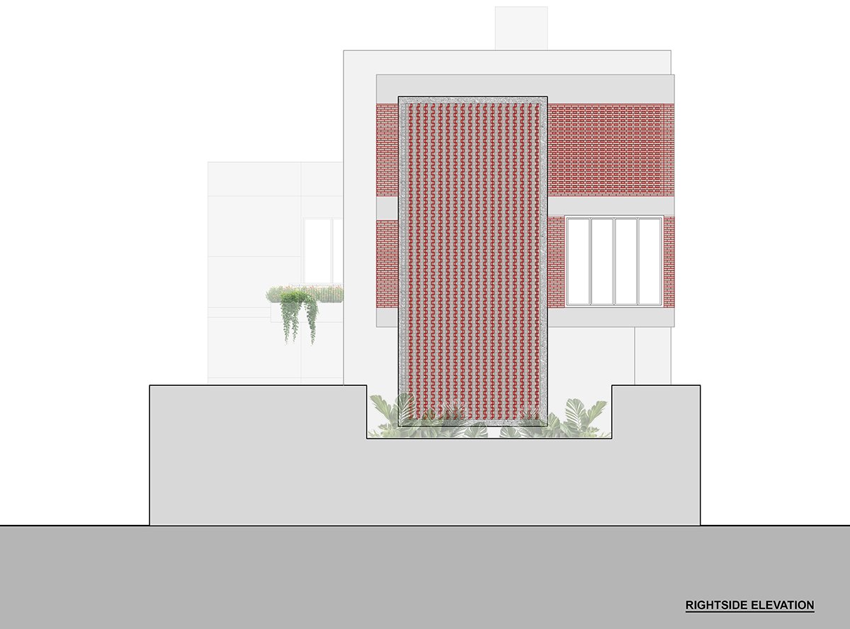 There is a theatrical play of exposed brickwork masses with exposed RCC masses in the exterior facade. The notion of elevation design is to use the very square exterior as a backdrop from which various forms of masses are extruded; with puncture of openings and balconies to add porosity in solid forms.